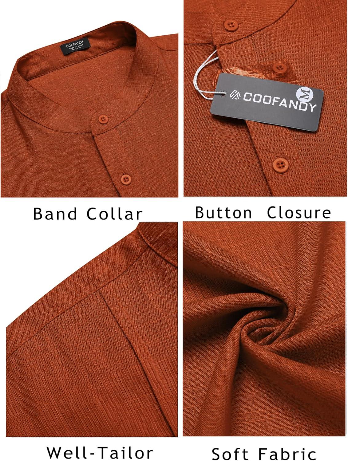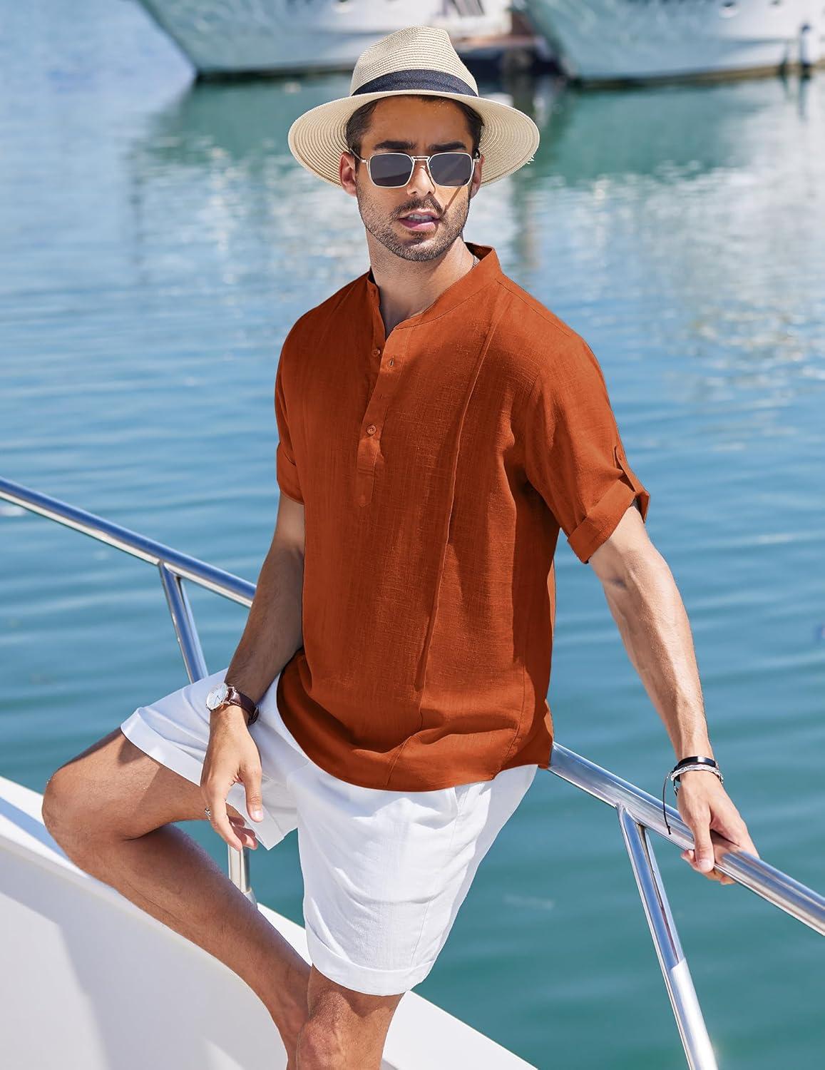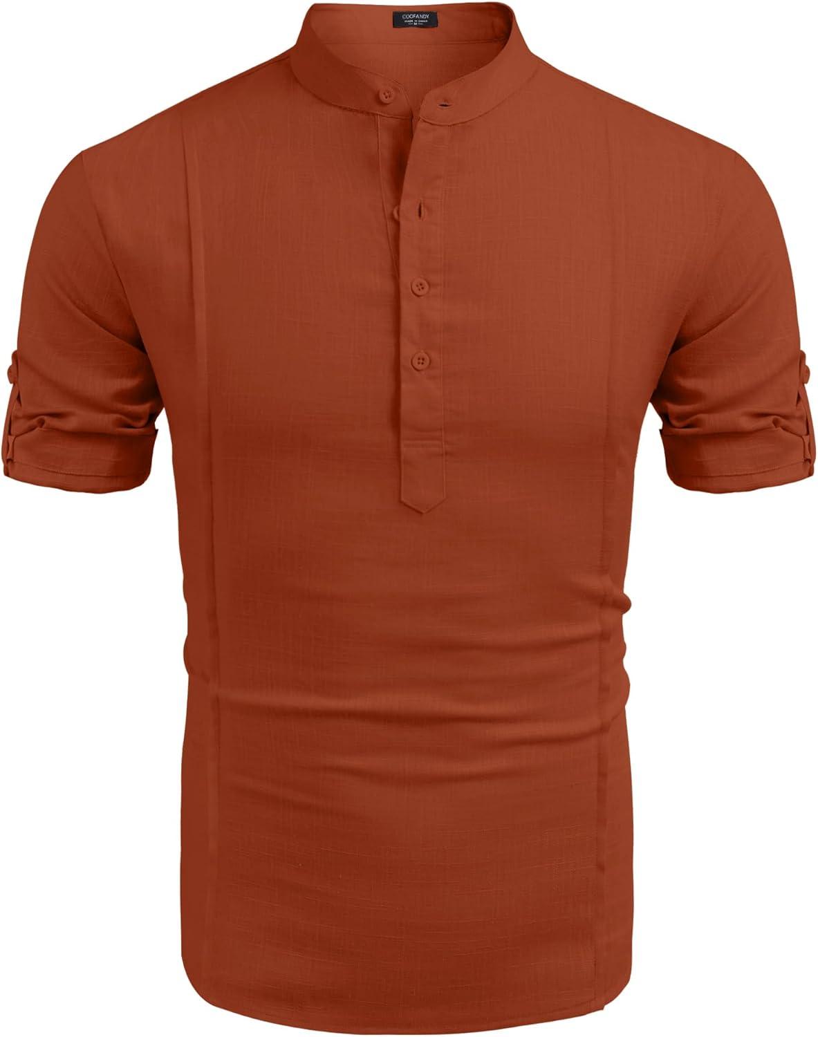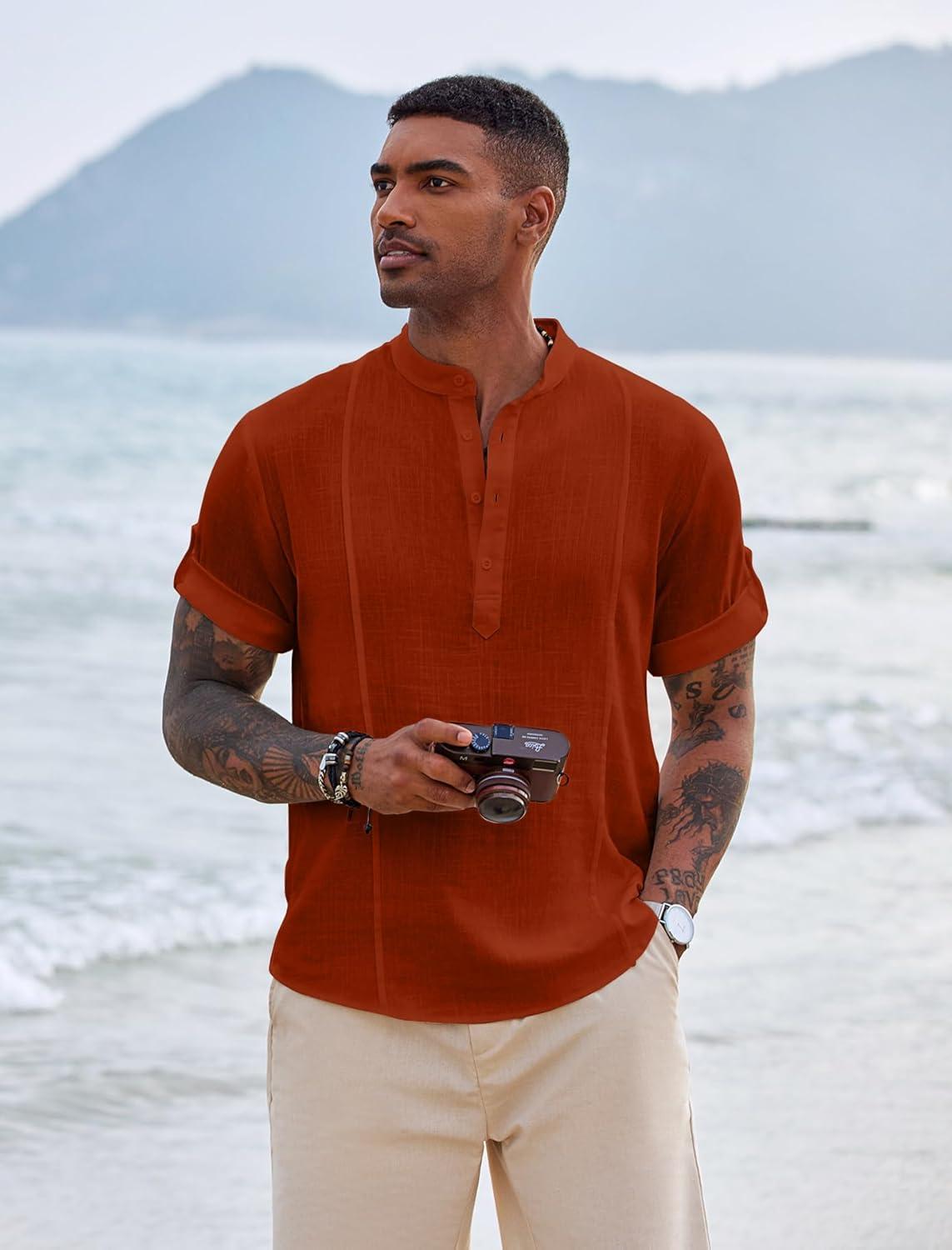 COOFANDY Men’s Casual Henley Shirt Band Collar Short Sleeve Shirt Summer Beach Hippie T-Shirt(Caramel)