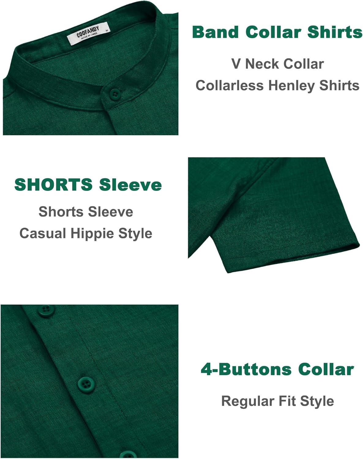 COOFANDY Men’s Casual Henley Shirt Band Collar Short Sleeve Shirt Summer Beach Hippie T-Shirt(Dark Green)