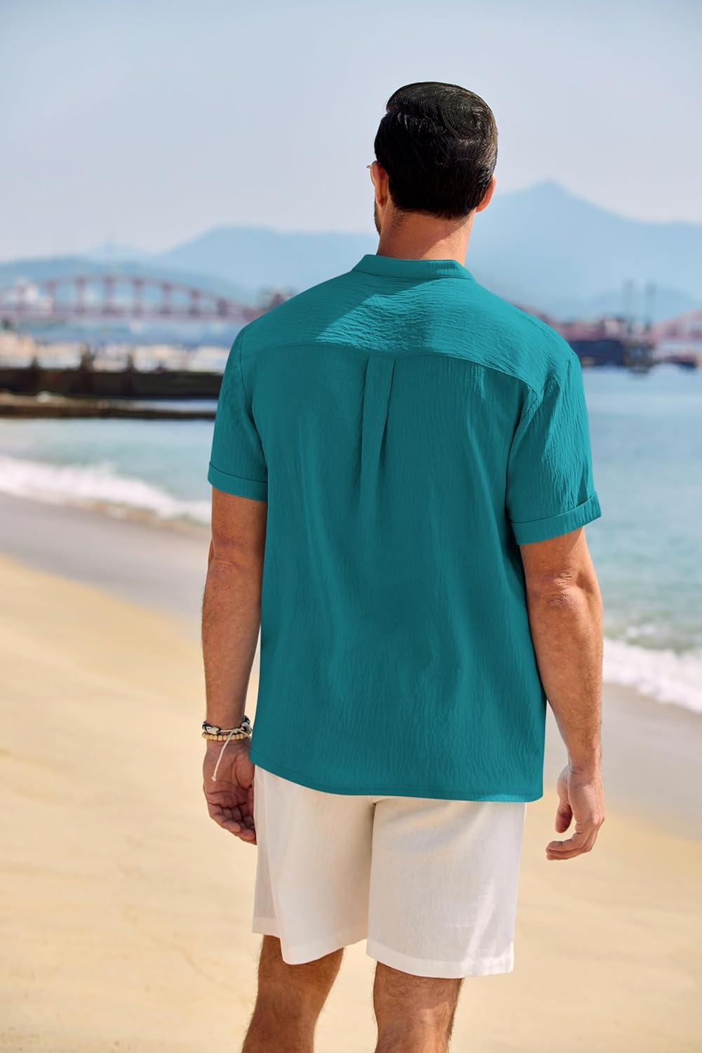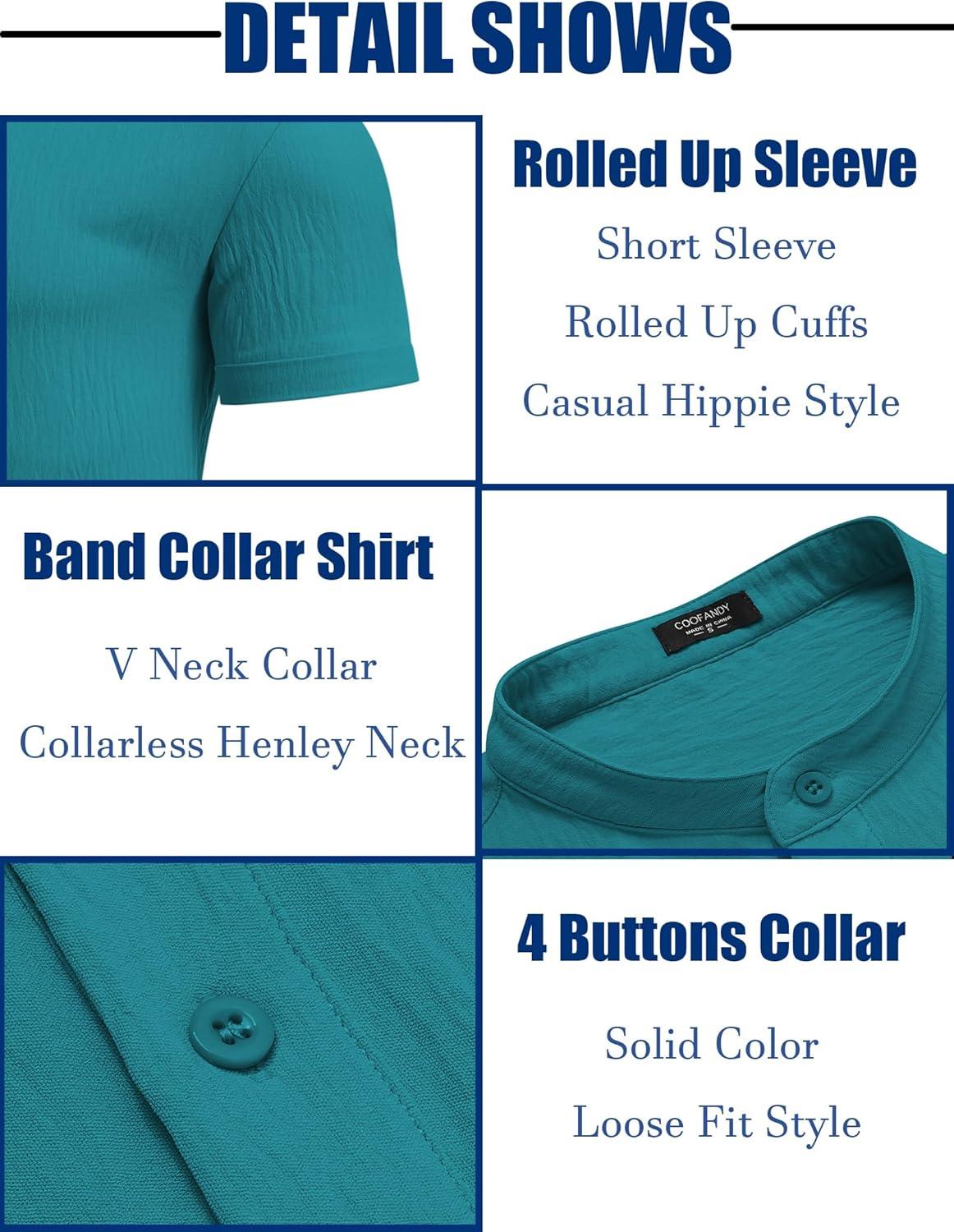COOFANDY Men’s Casual Henley Shirt Band Collar Short Sleeve Shirt Summer Beach Hippie T-Shirt(Dark Peacock Blue)