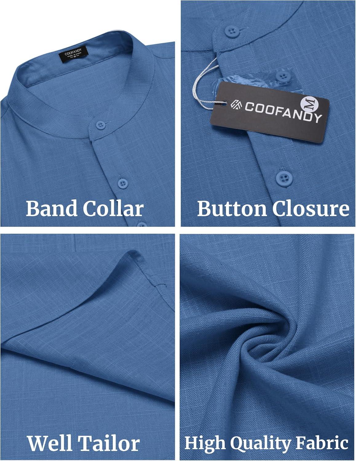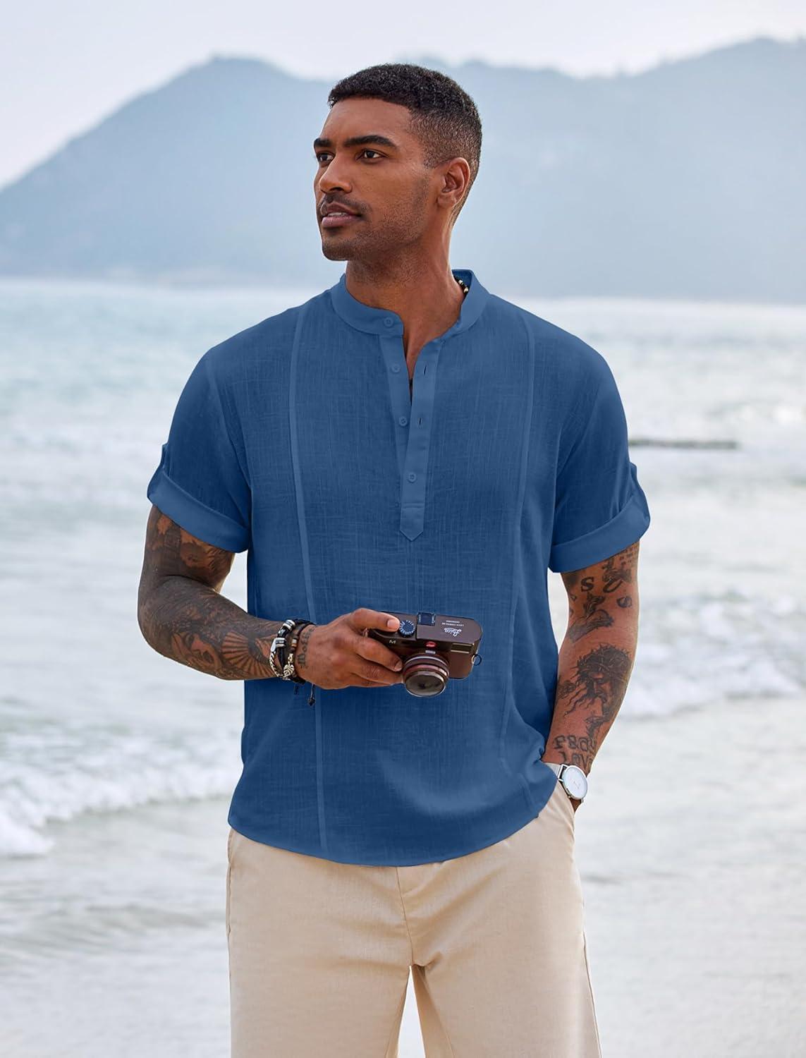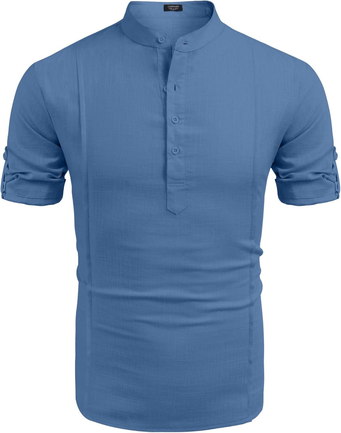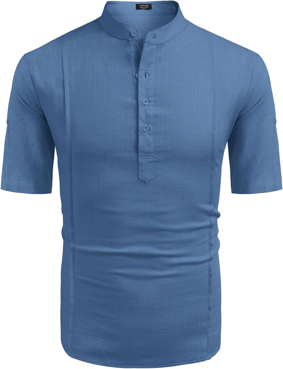 COOFANDY Men’s Casual Henley Shirt Band Collar Short Sleeve Shirt Summer Beach Hippie T-Shirt(Denim Blue)