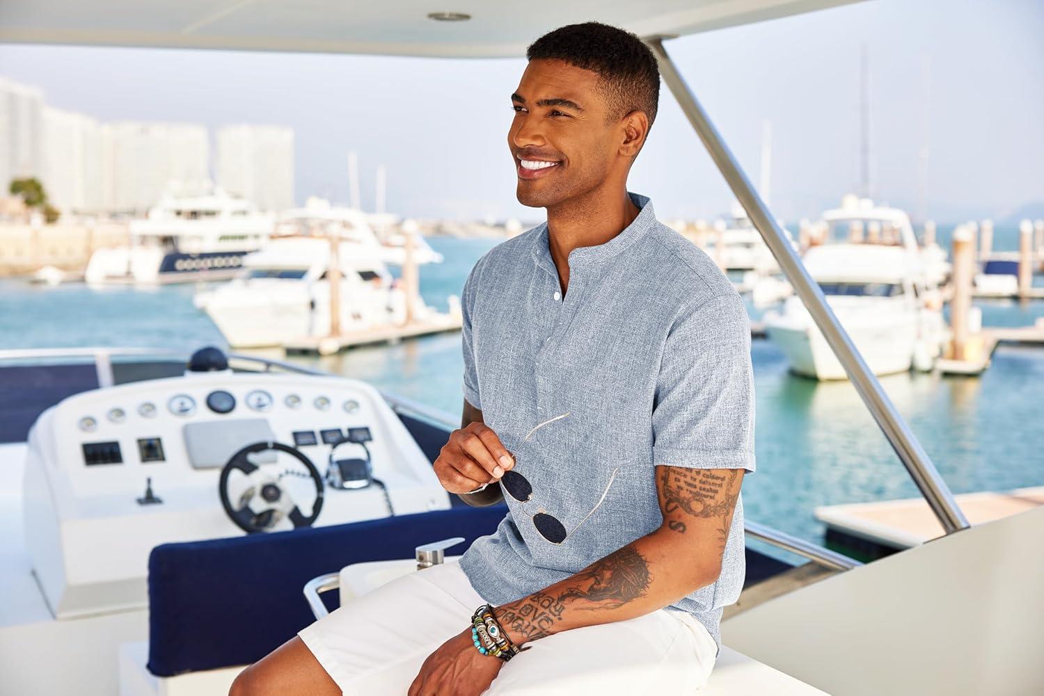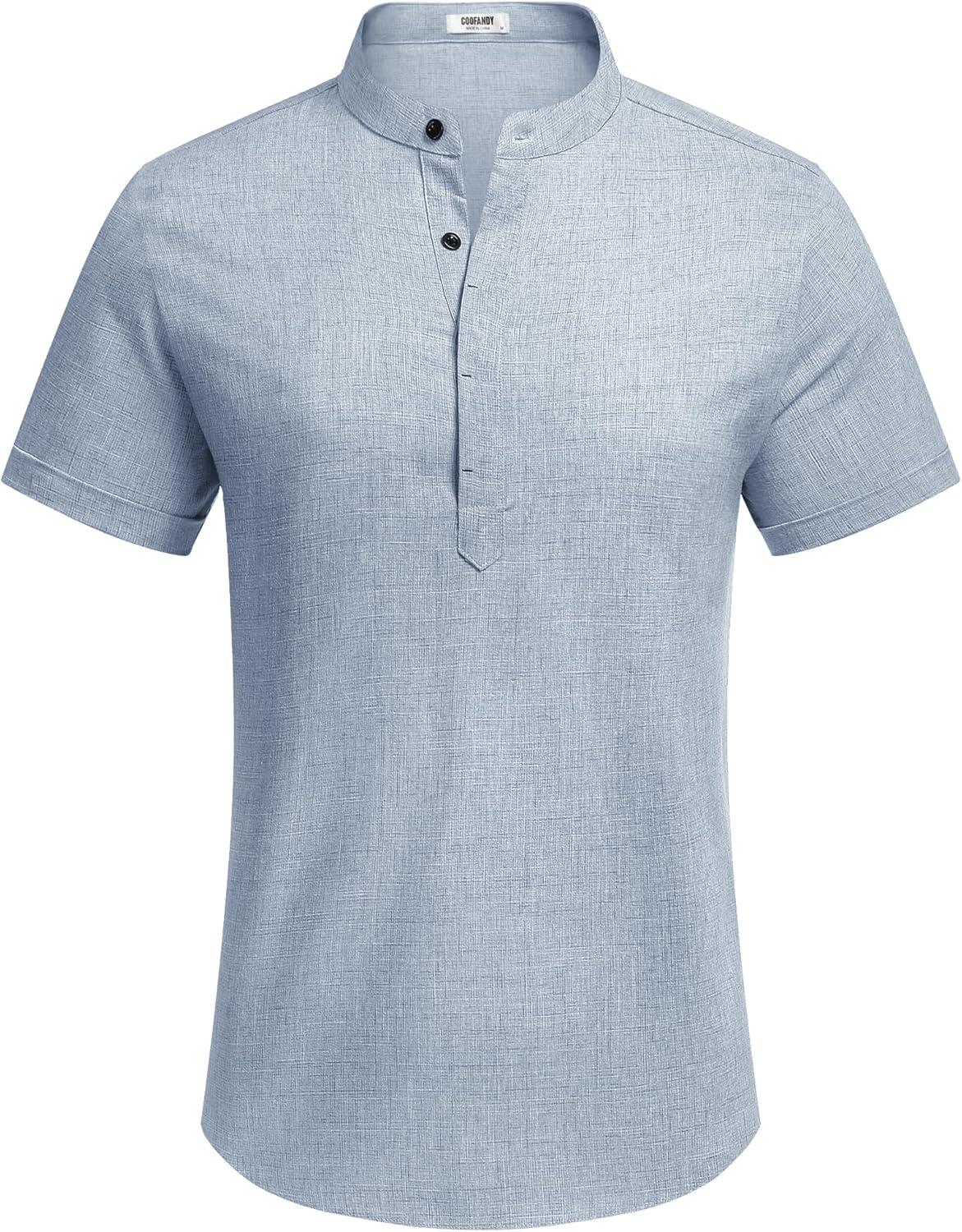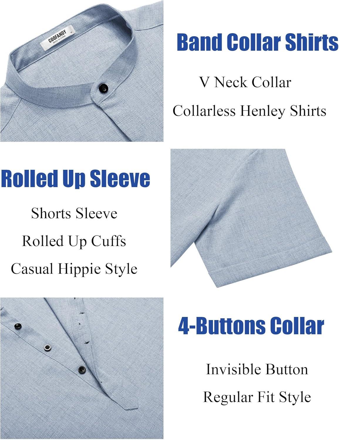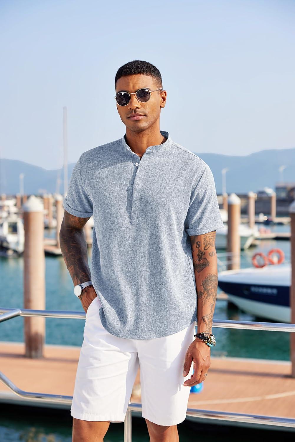 COOFANDY Men’s Casual Henley Shirt Band Collar Short Sleeve Shirt Summer Beach Hippie T-Shirt(Flecking Blue)