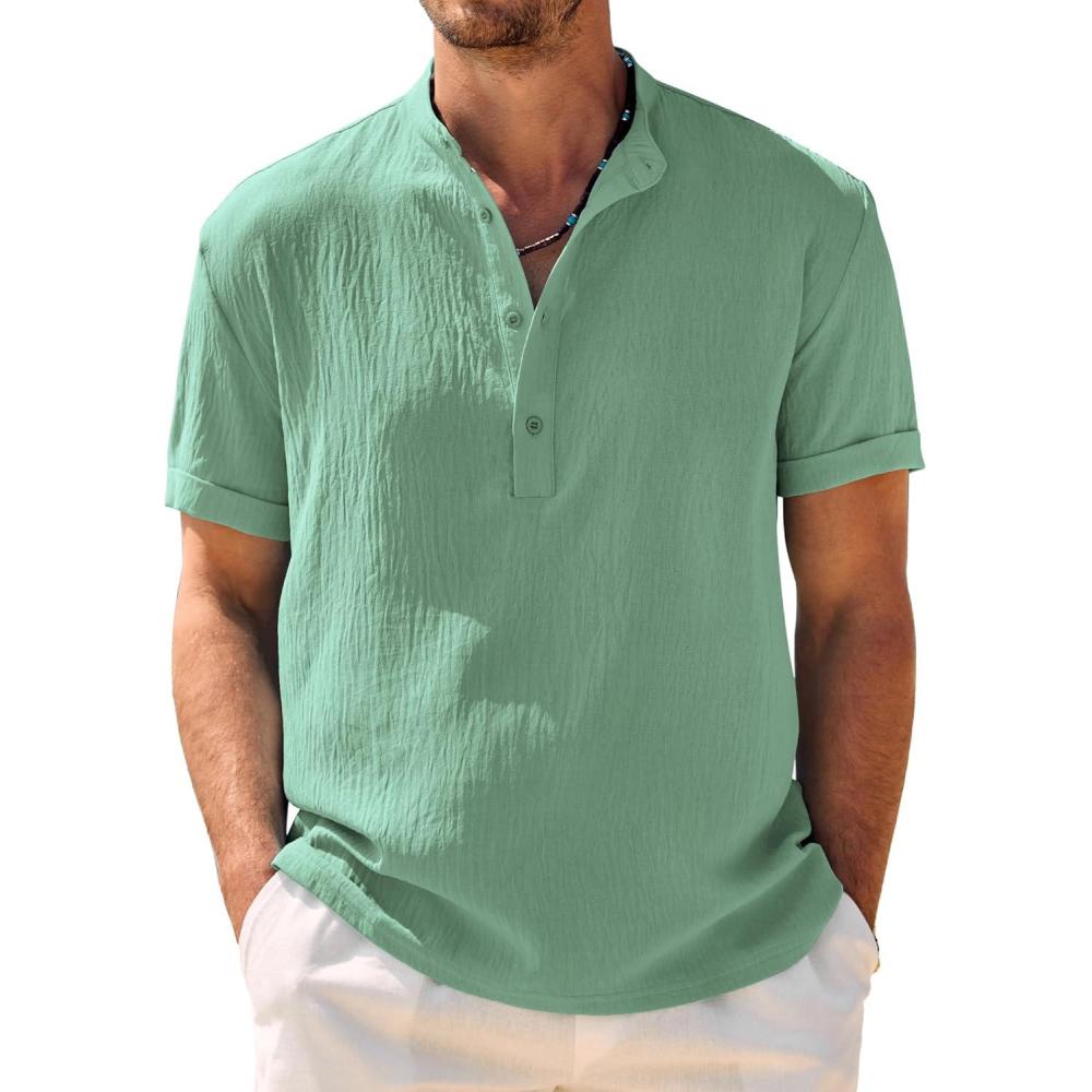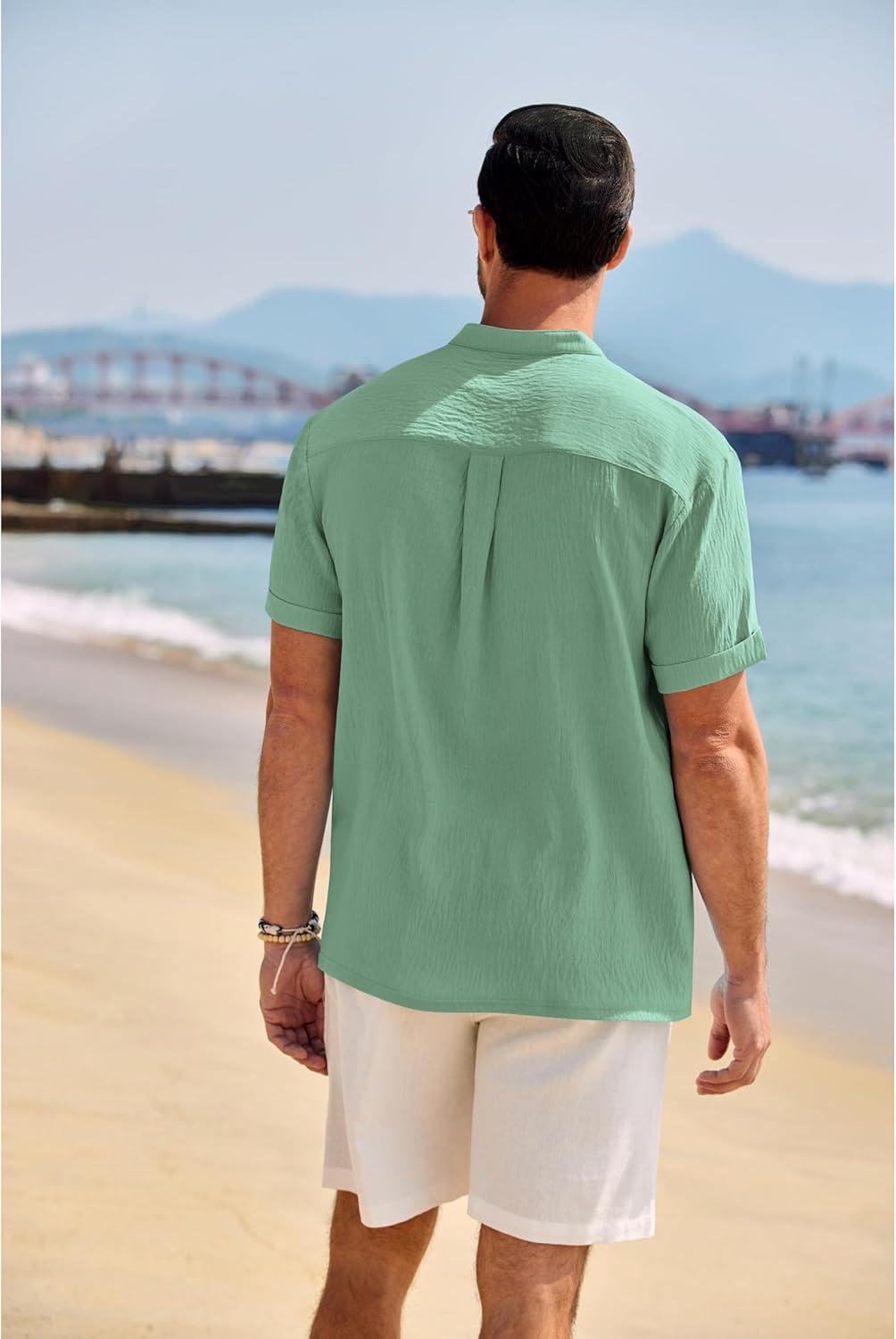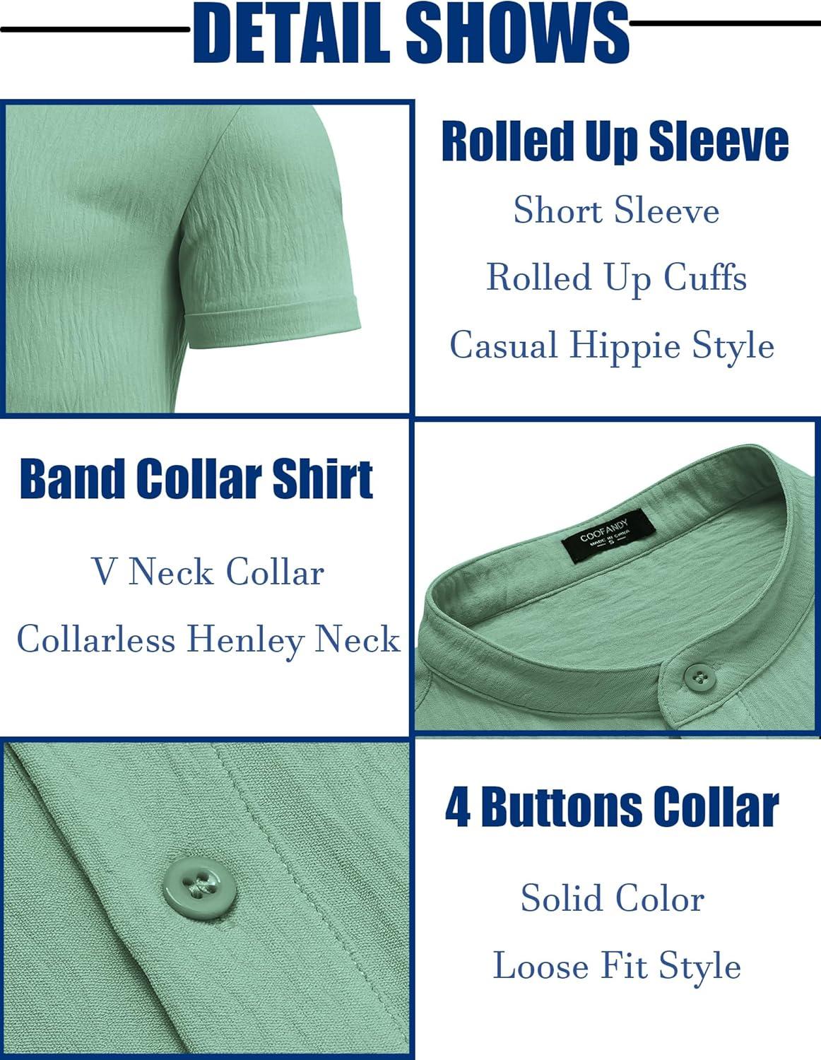 COOFANDY Men’s Casual Henley Shirt Band Collar Short Sleeve Shirt Summer Beach Hippie T-Shirt(Ice Green)