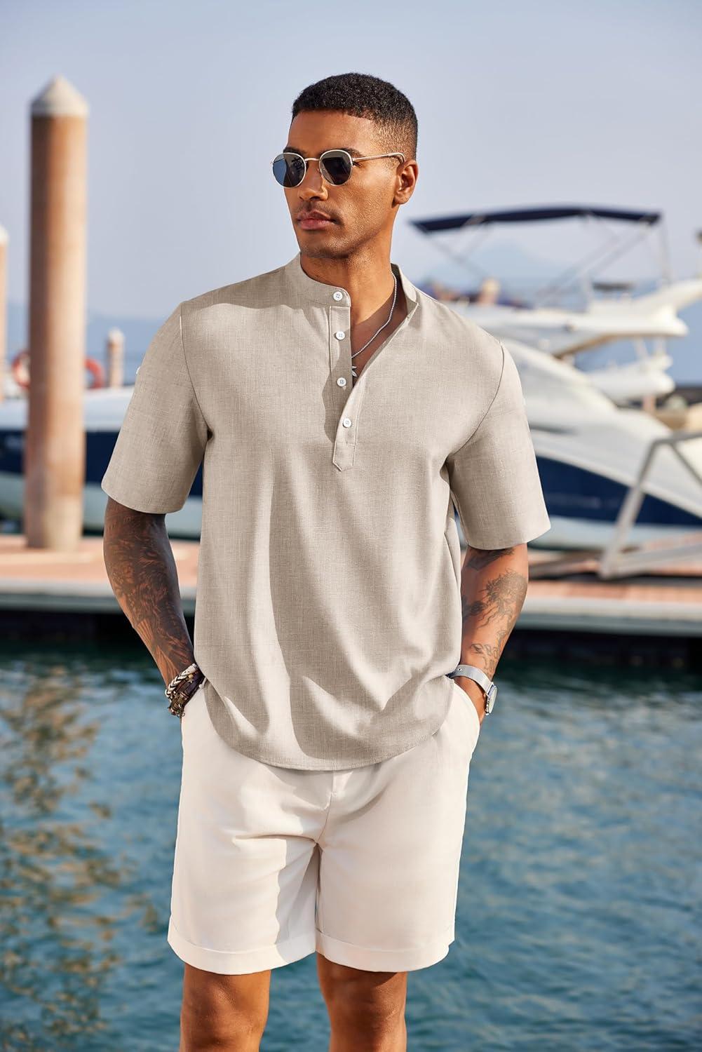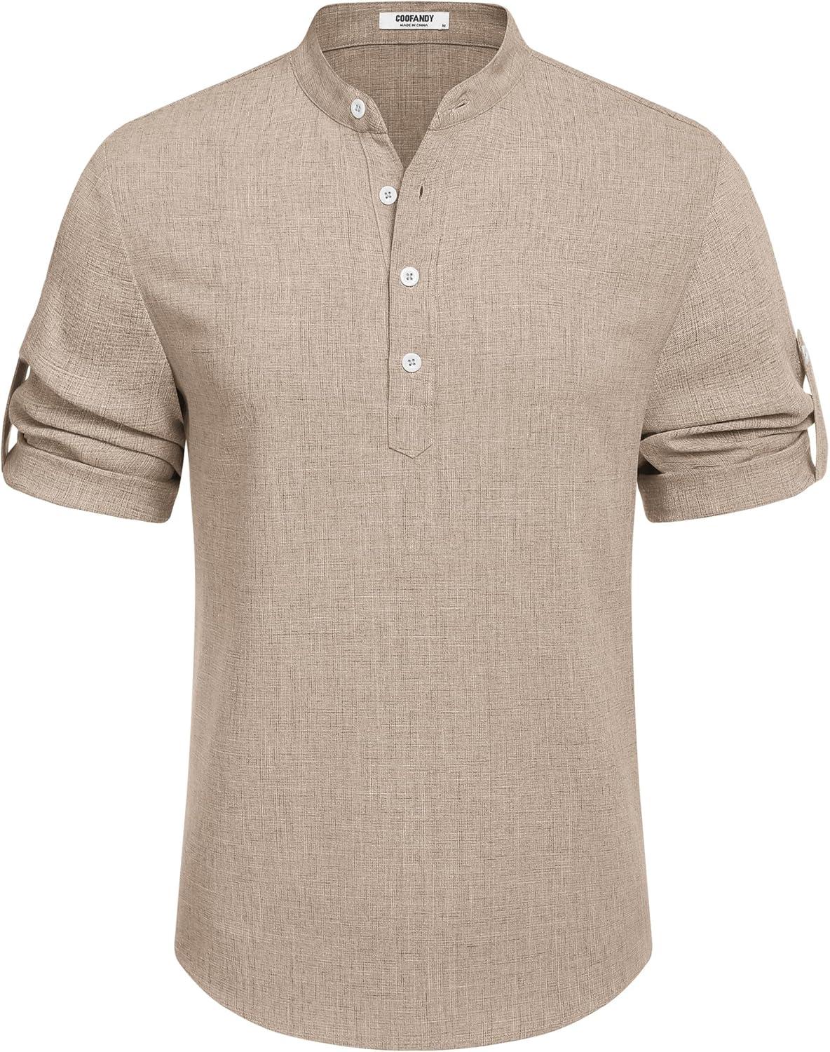 COOFANDY Men’s Casual Henley Shirt Band Collar Short Sleeve Shirt Summer Beach Hippie T-Shirt(Khaki)