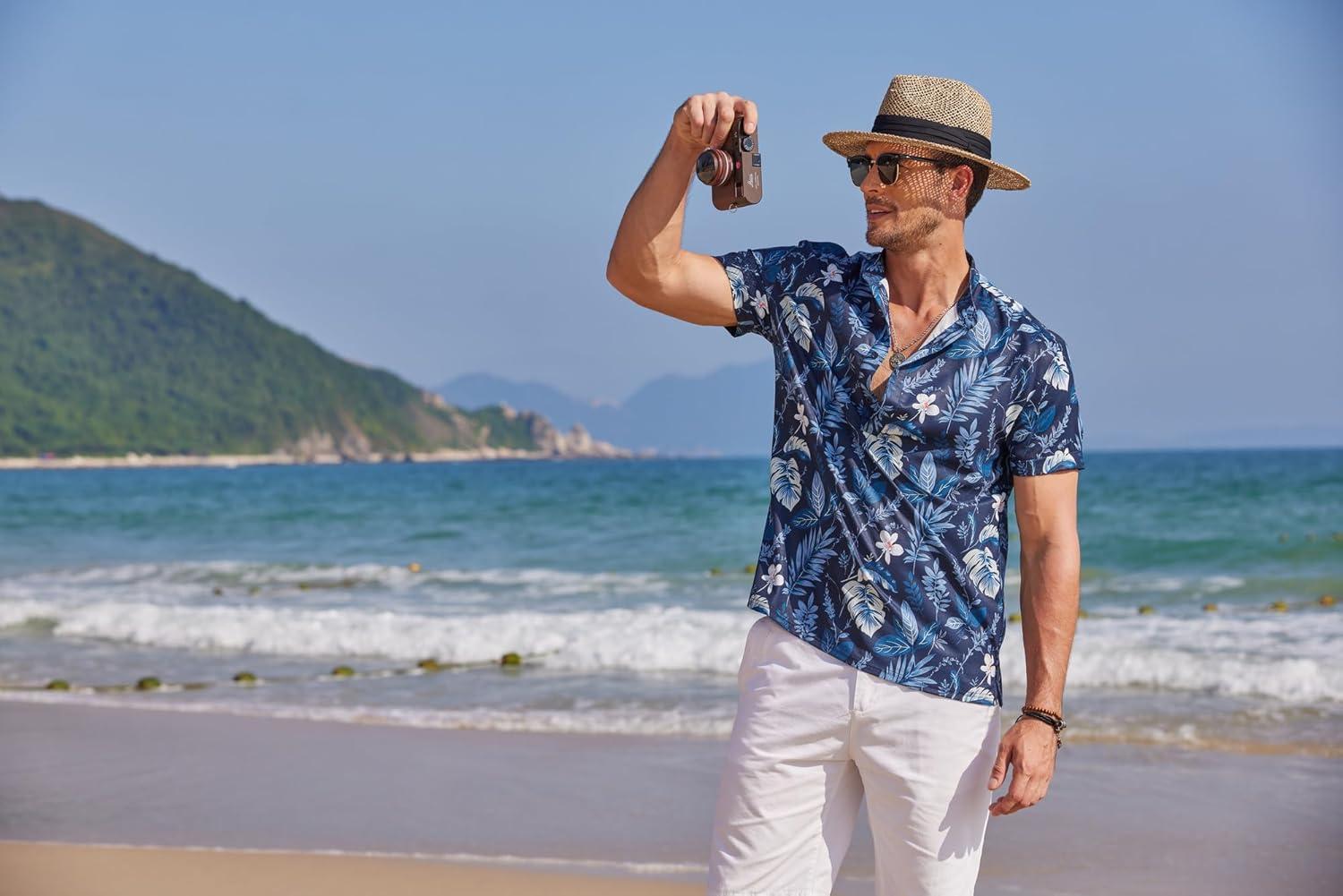 COOFANDY Men’s Casual Henley Shirt Band Collar Short Sleeve Shirt Summer Beach Hippie T-Shirt(Light Blue Hawaiian Flower)