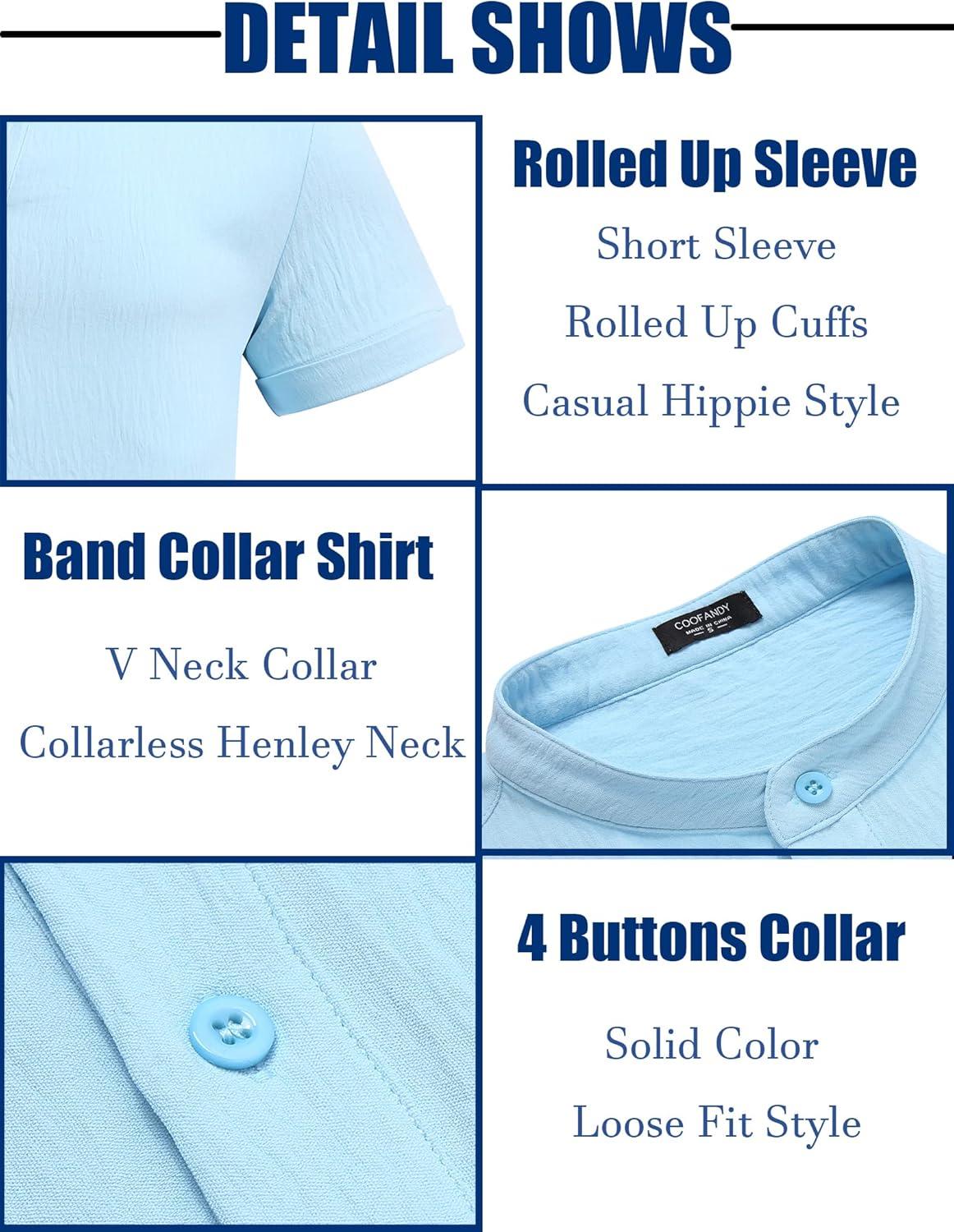 COOFANDY Men’s Casual Henley Shirt Band Collar Short Sleeve Shirt Summer Beach Hippie T-Shirt(Light Blue)