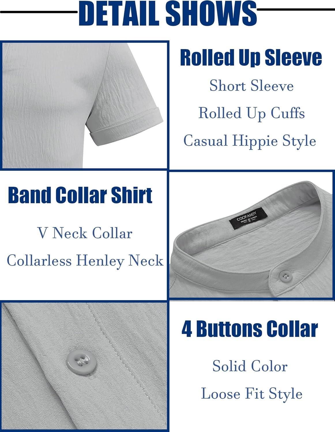 COOFANDY Men’s Casual Henley Shirt Band Collar Short Sleeve Shirt Summer Beach Hippie T-Shirt(Light Grey)