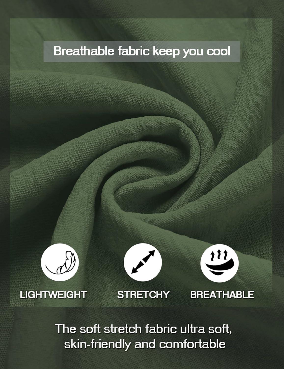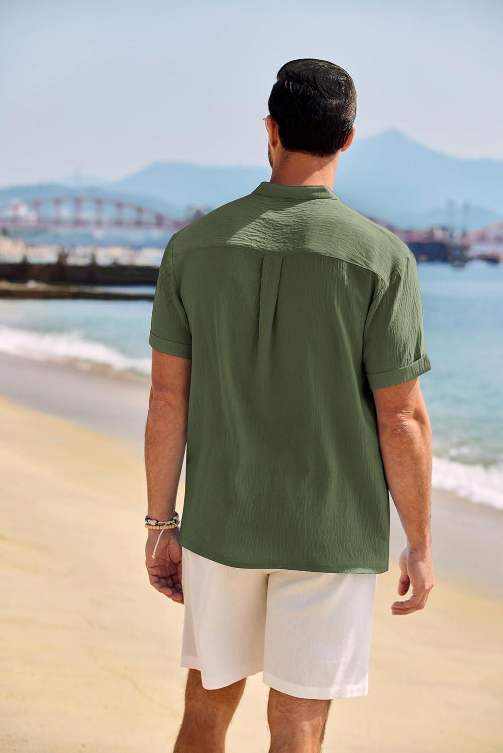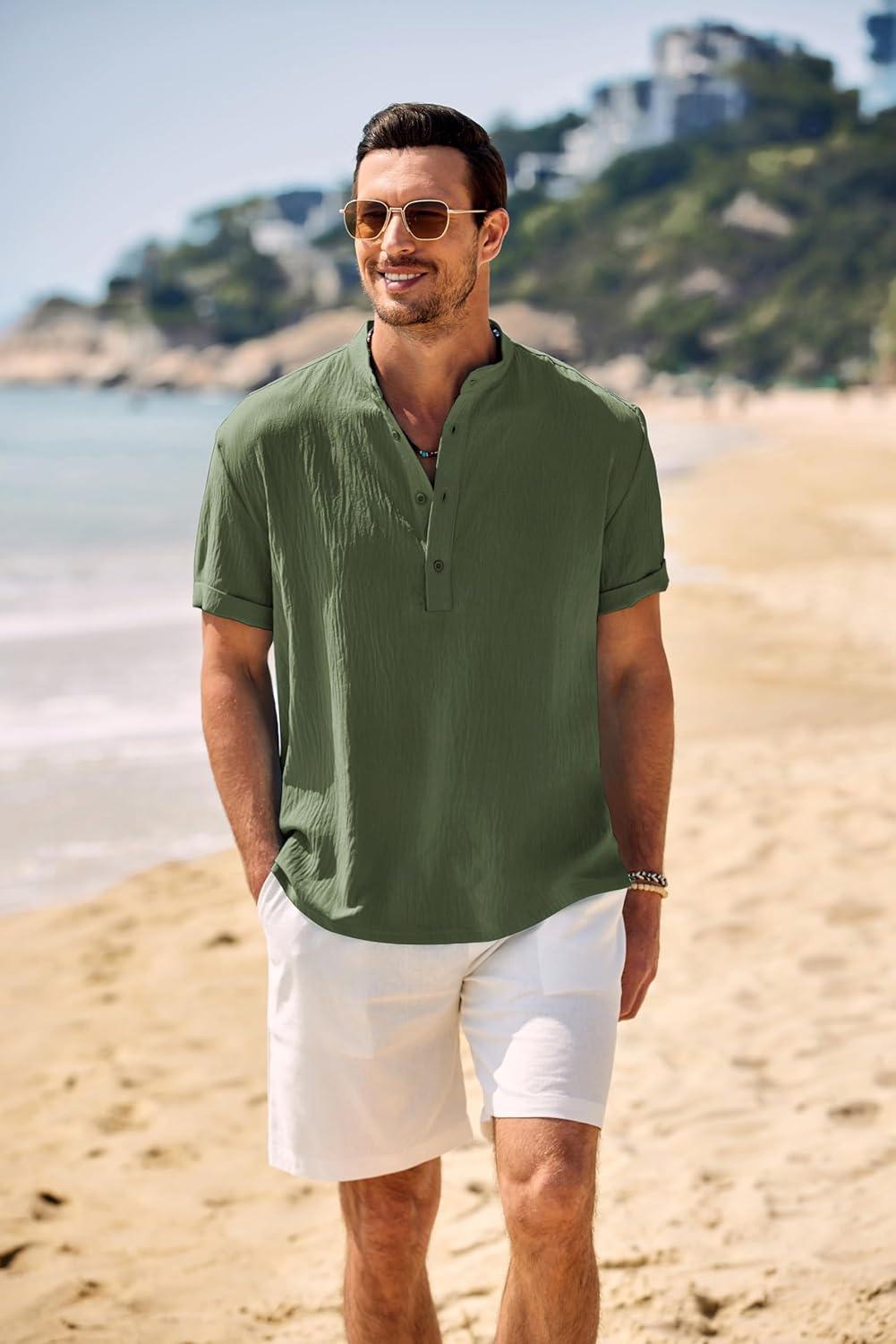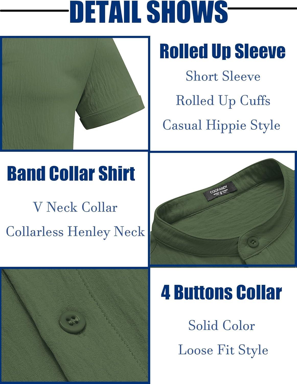 COOFANDY Men’s Casual Henley Shirt Band Collar Short Sleeve Shirt Summer Beach Hippie T-Shirt(Olive Green)