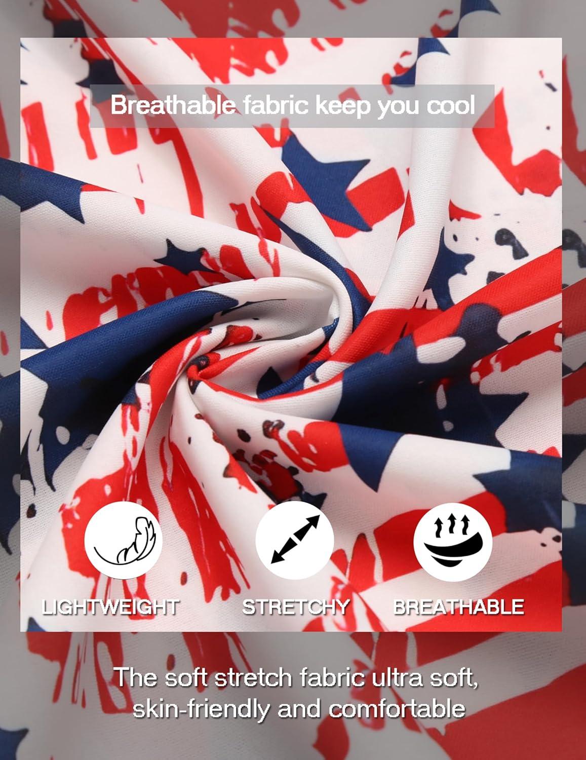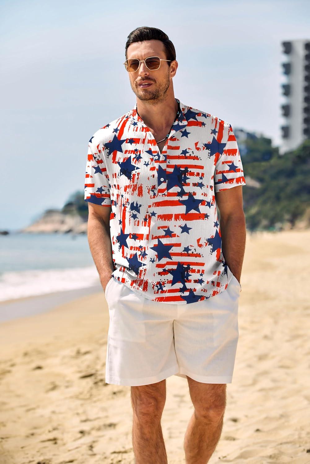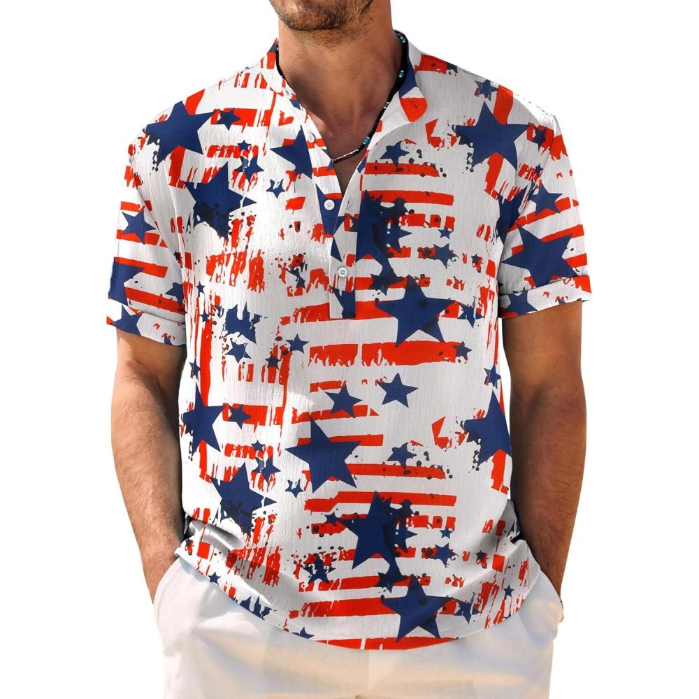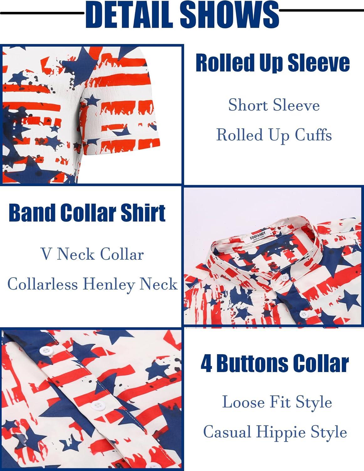 COOFANDY Men’s Casual Henley Shirt Band Collar Short Sleeve Shirt Summer Beach Hippie T-Shirt(Red White Flag Blue Stars)