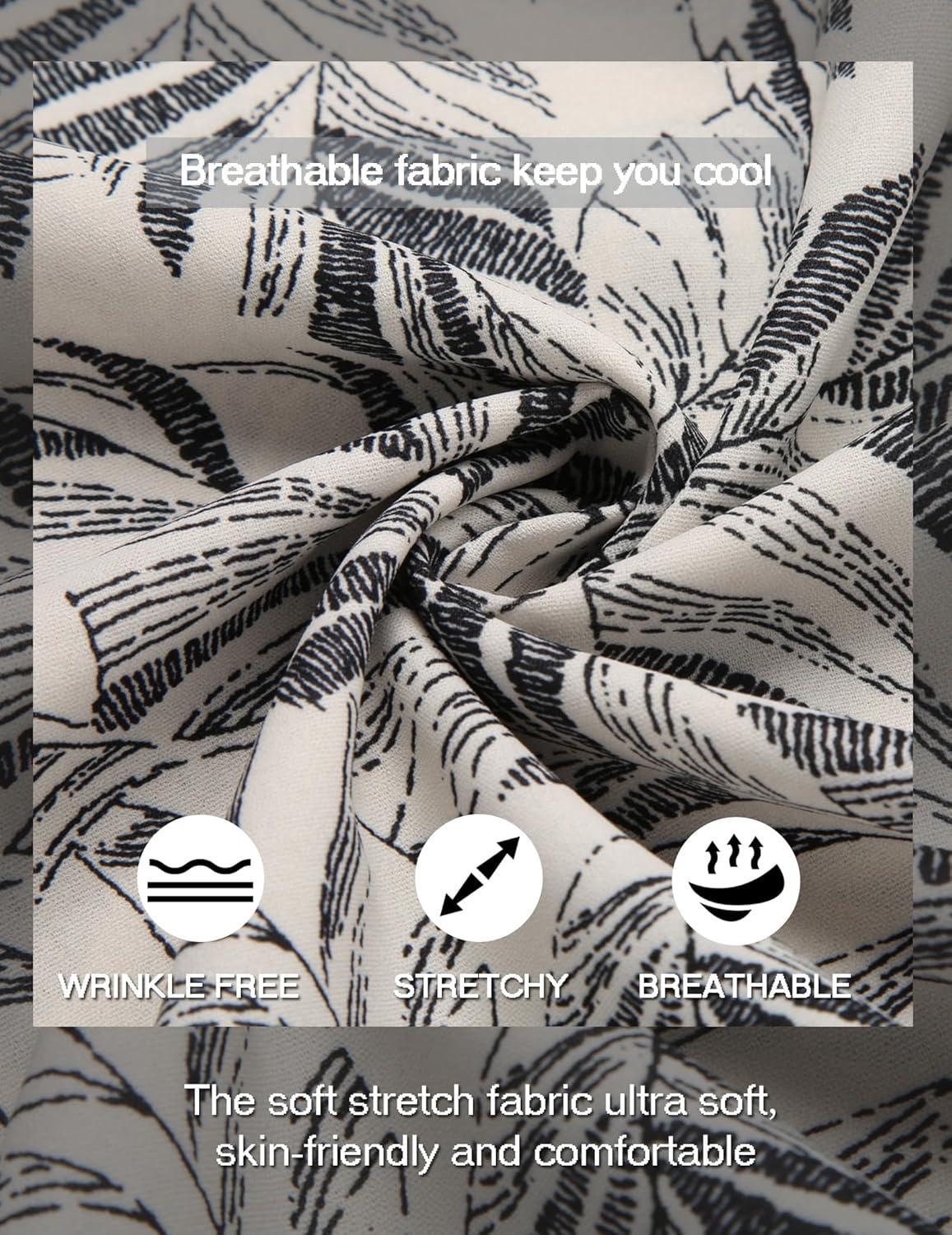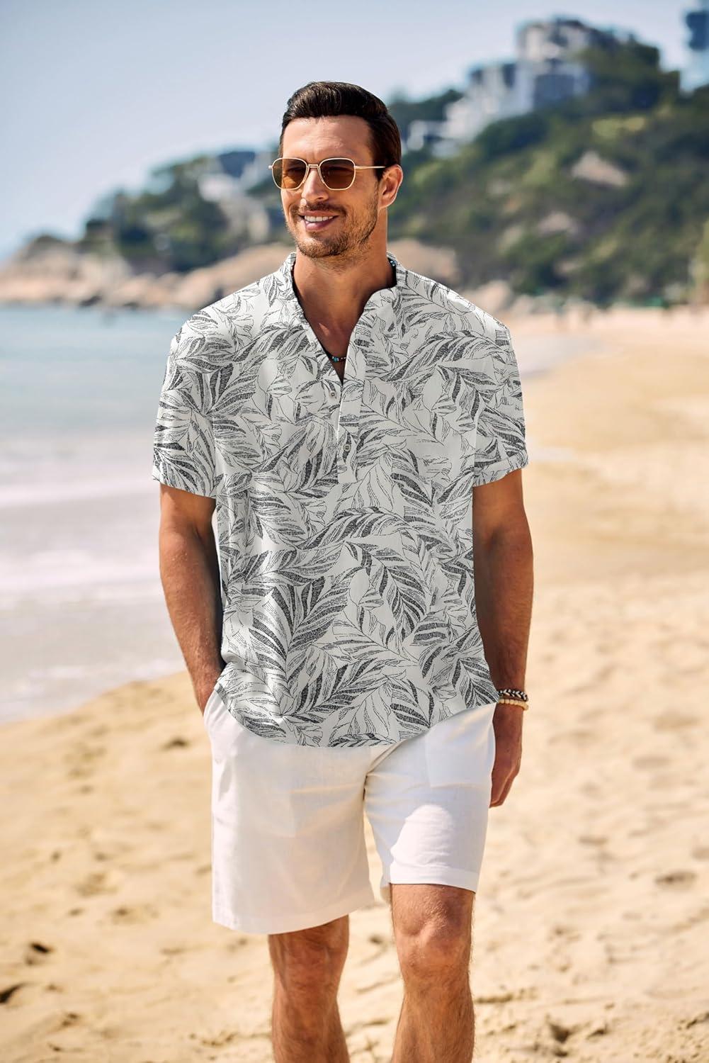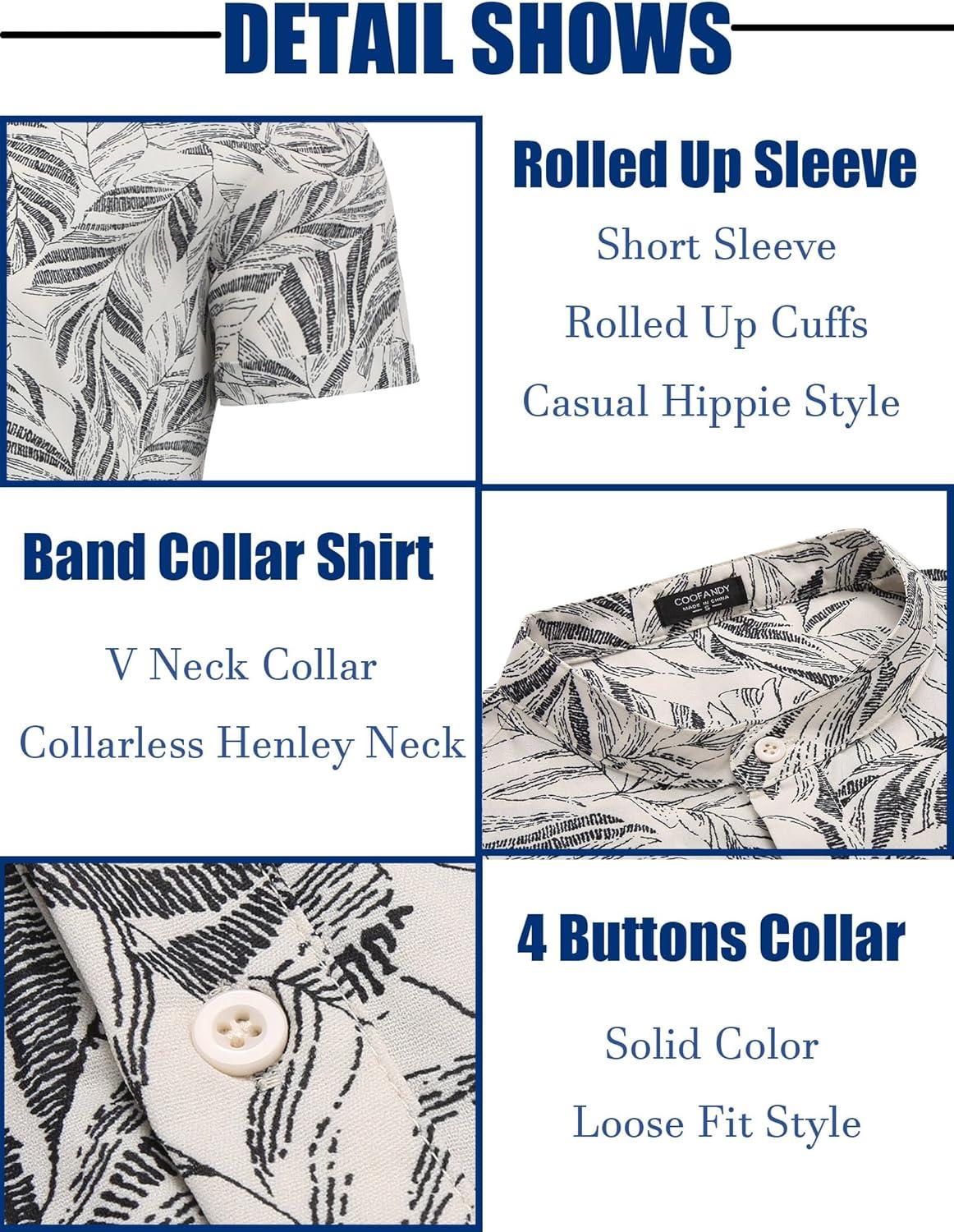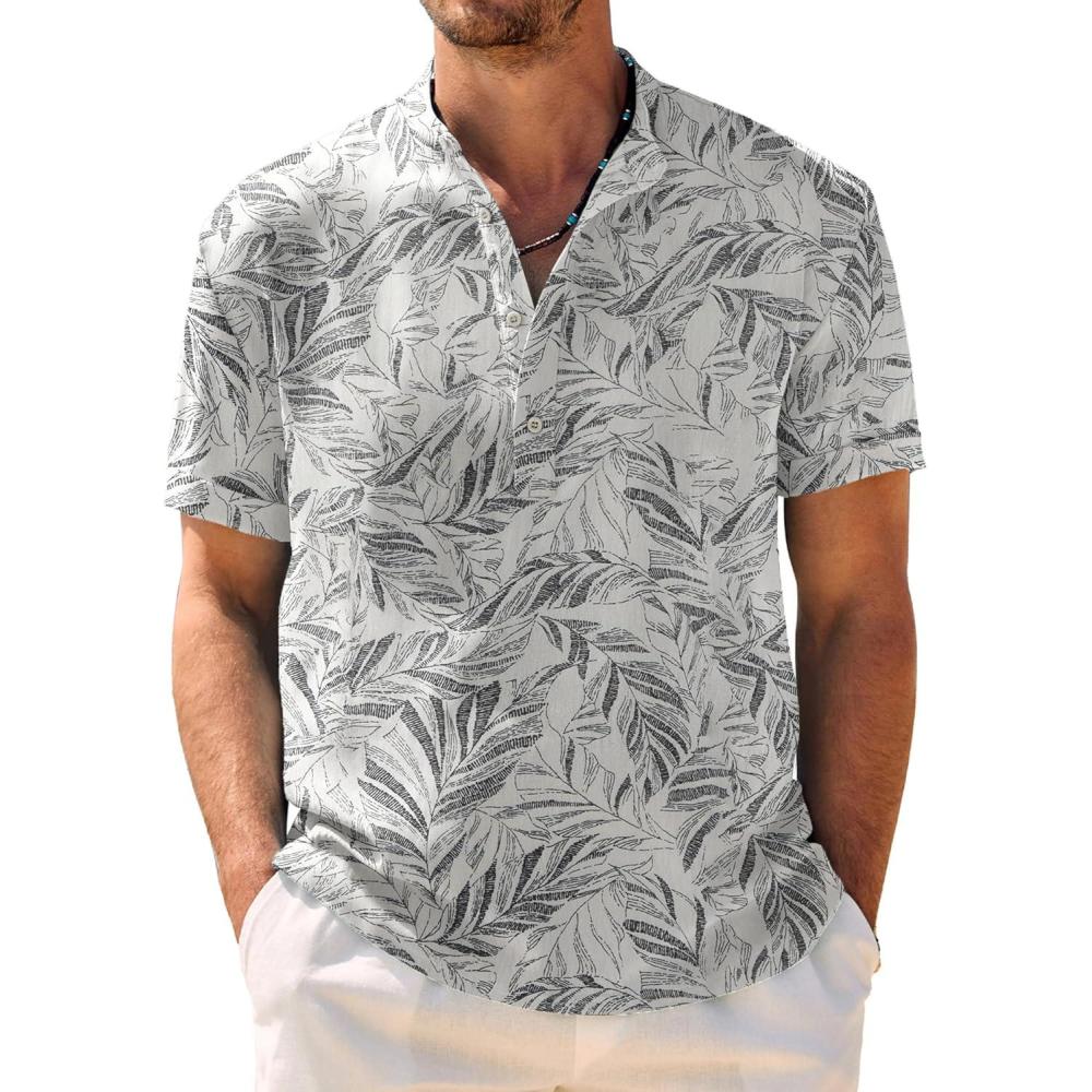 COOFANDY Men’s Casual Henley Shirt Band Collar Short Sleeve Shirt Summer Beach Hippie T-Shirt(White Black Flower)
