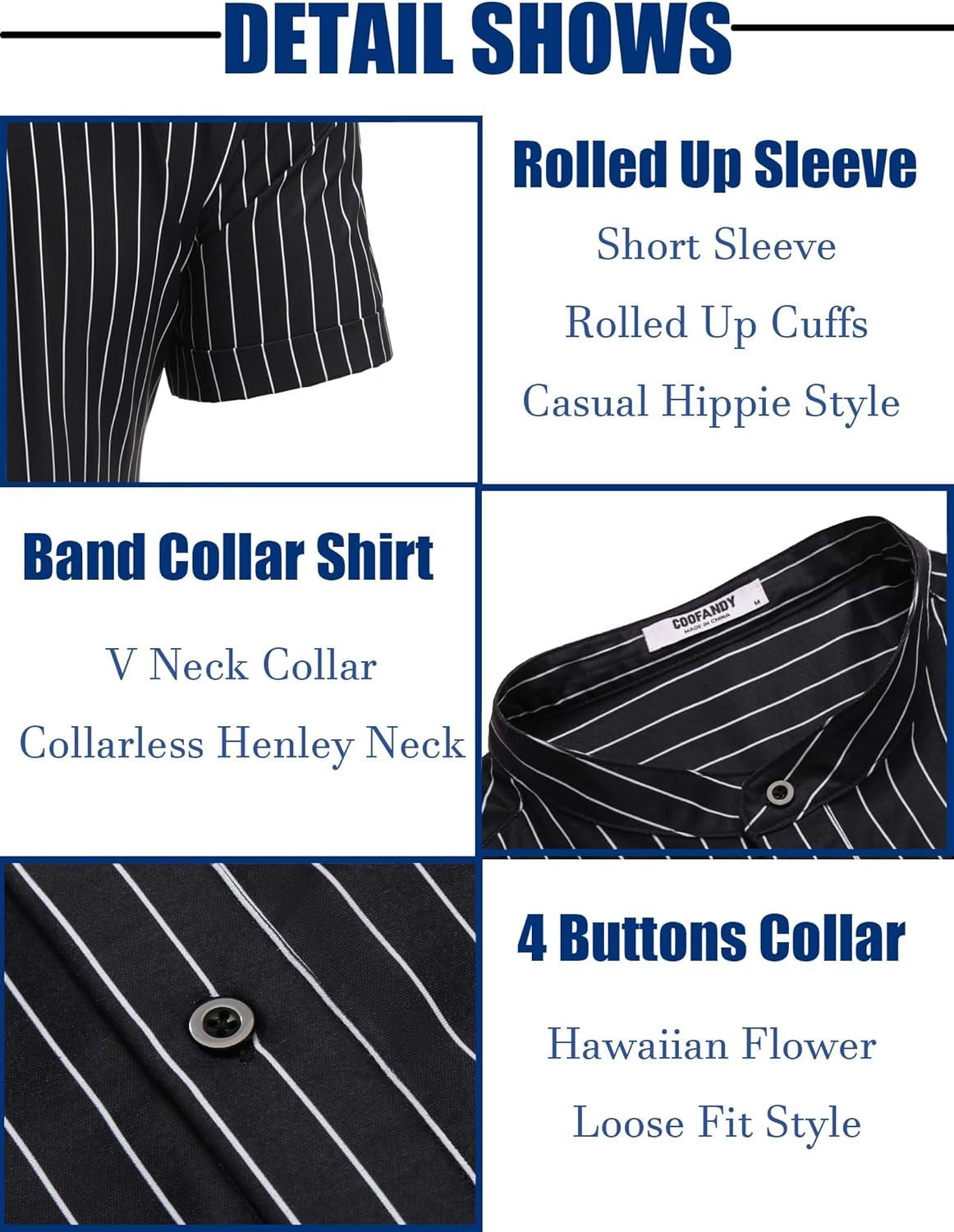 COOFANDY Men’s Casual Henley Shirt Band Collar Short Sleeve Shirt Summer Beach Hippie T-Shirt(White Stripes on Black)