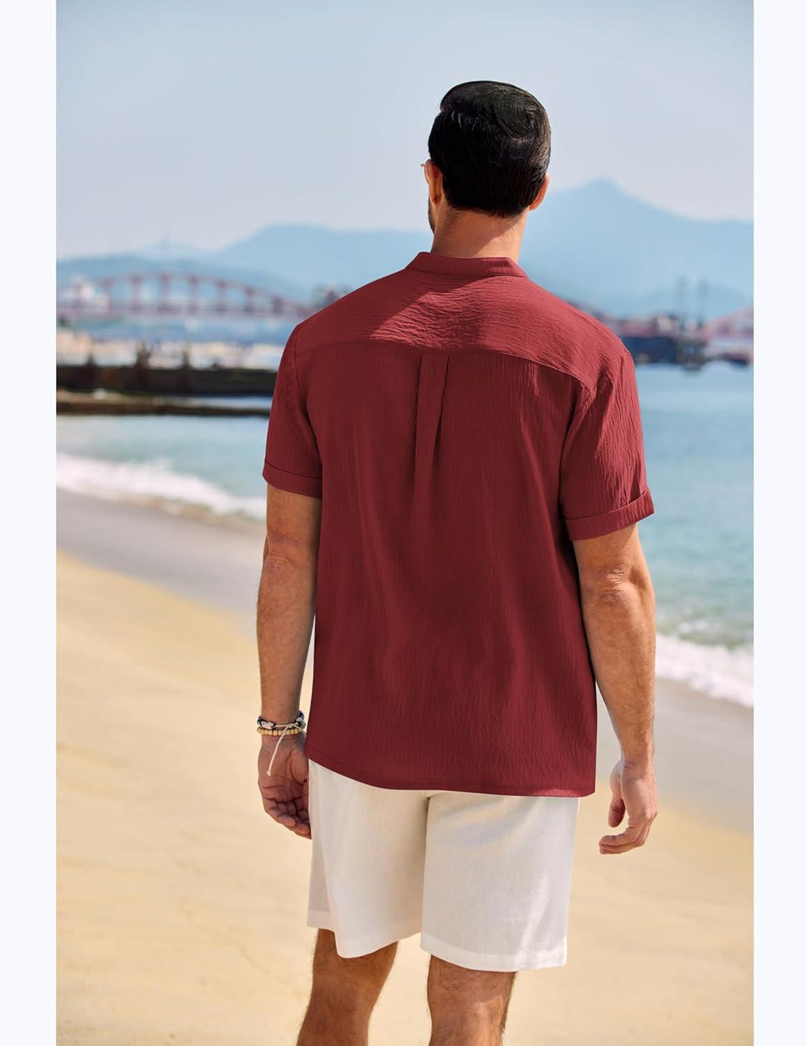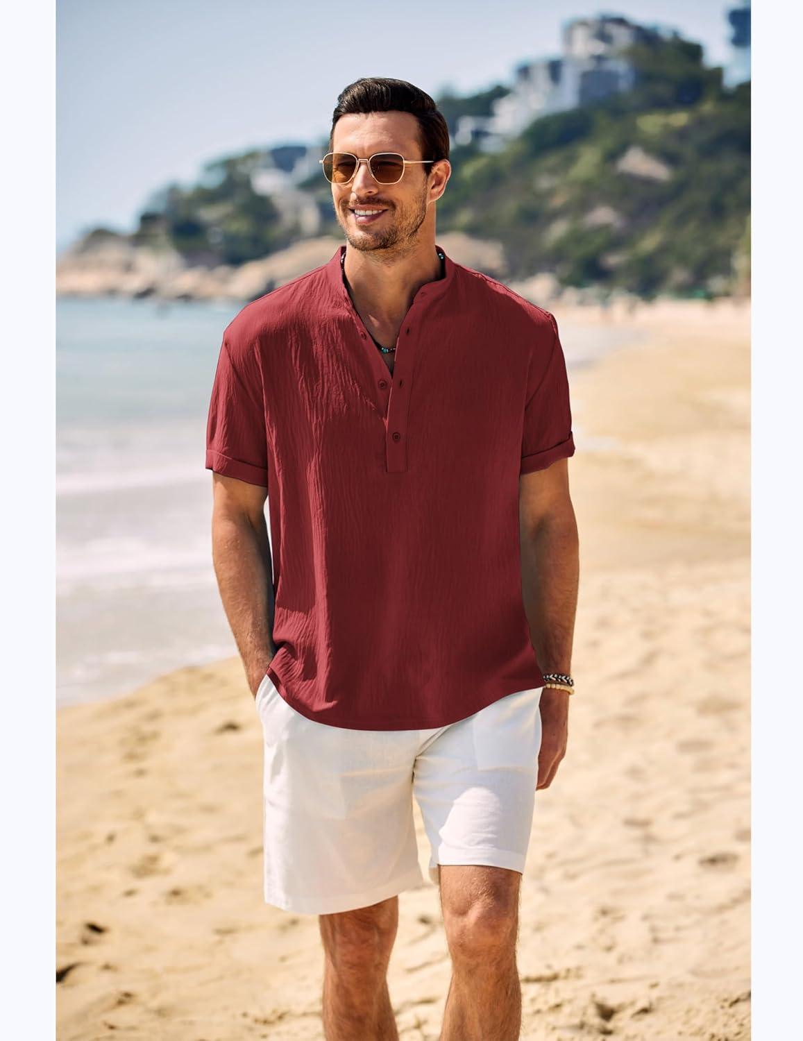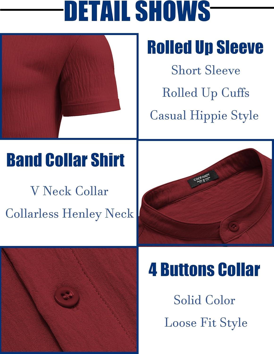 COOFANDY Men’s Casual Henley Shirt Band Collar Short Sleeve Shirt Summer Beach Hippie T-Shirt(Wine Red)