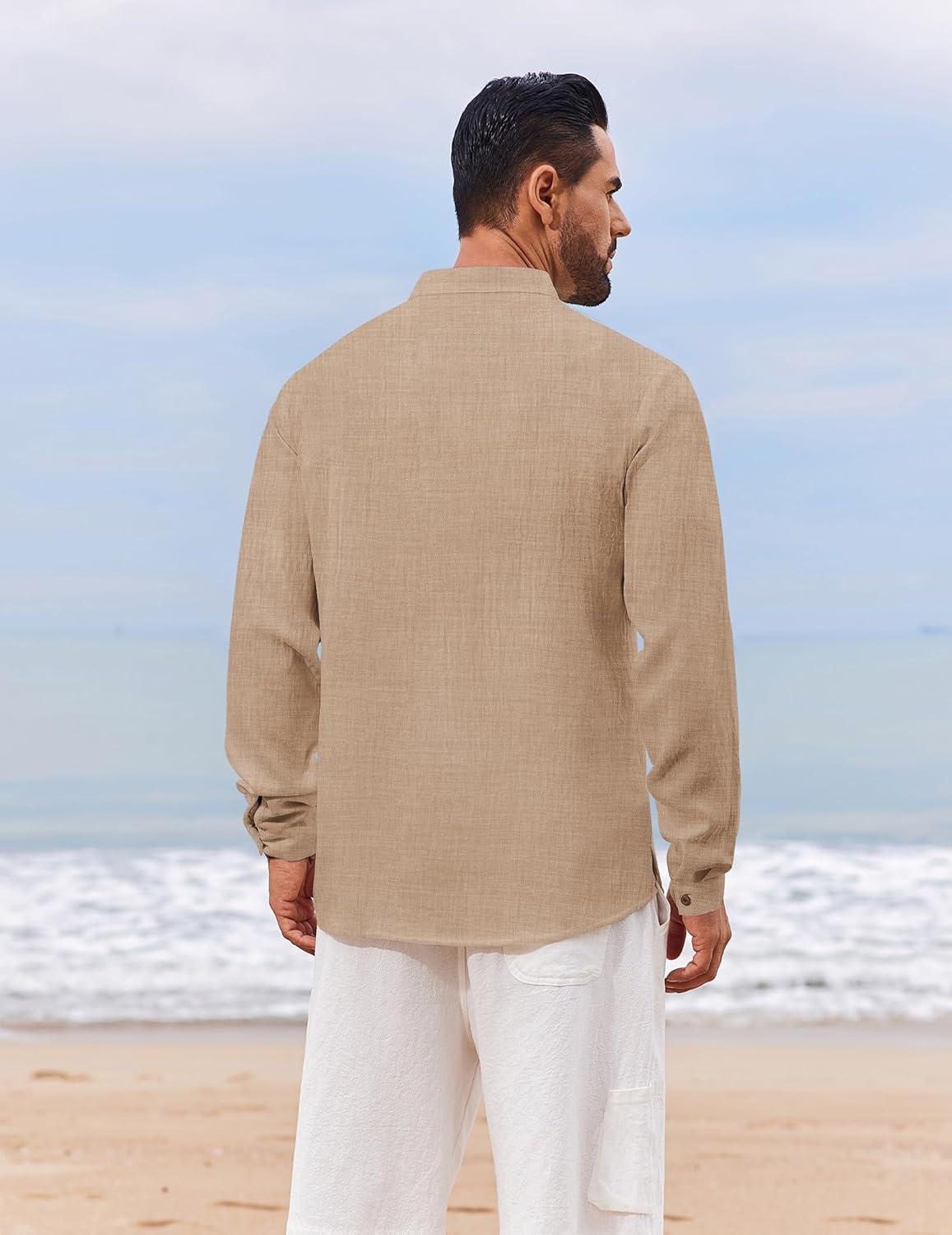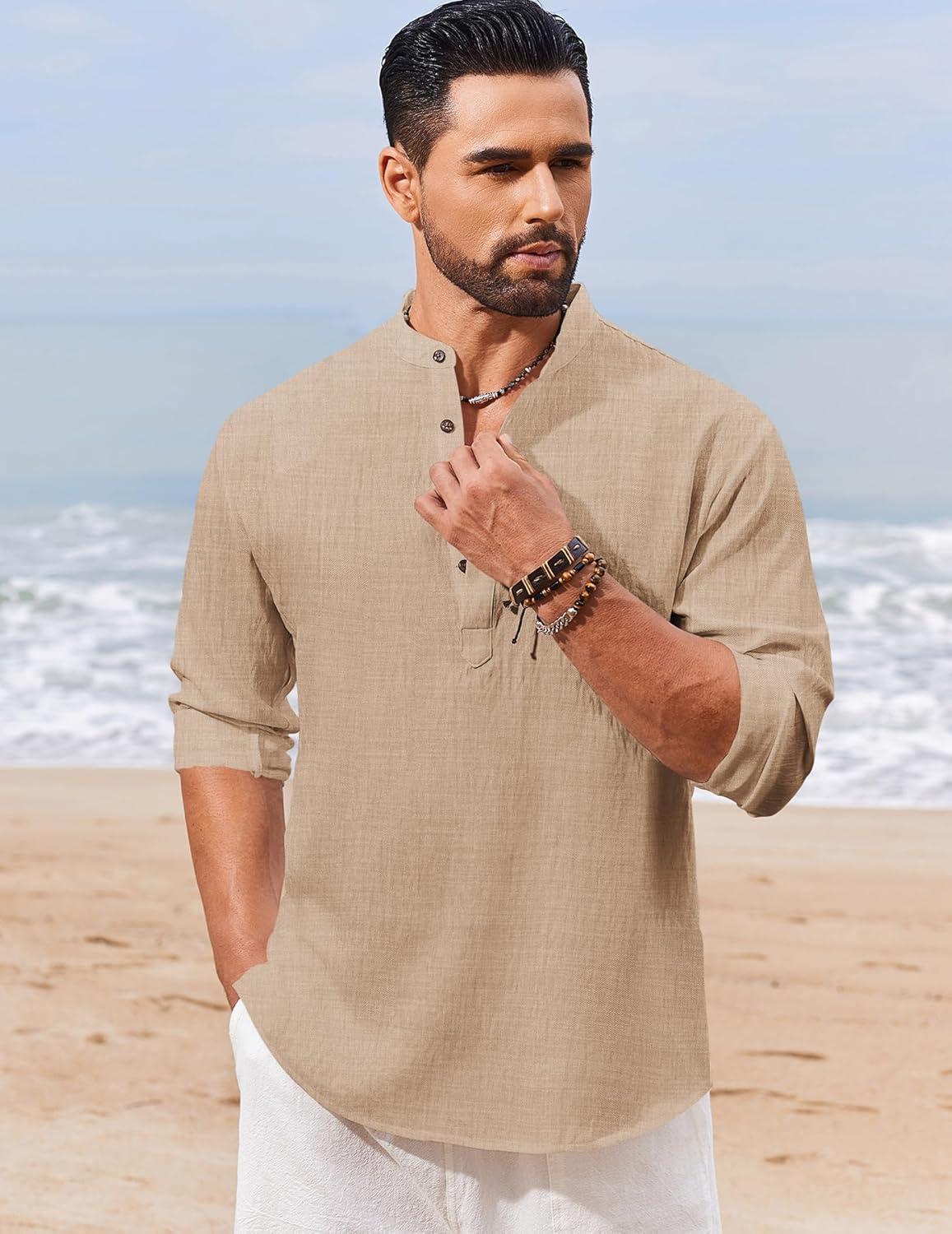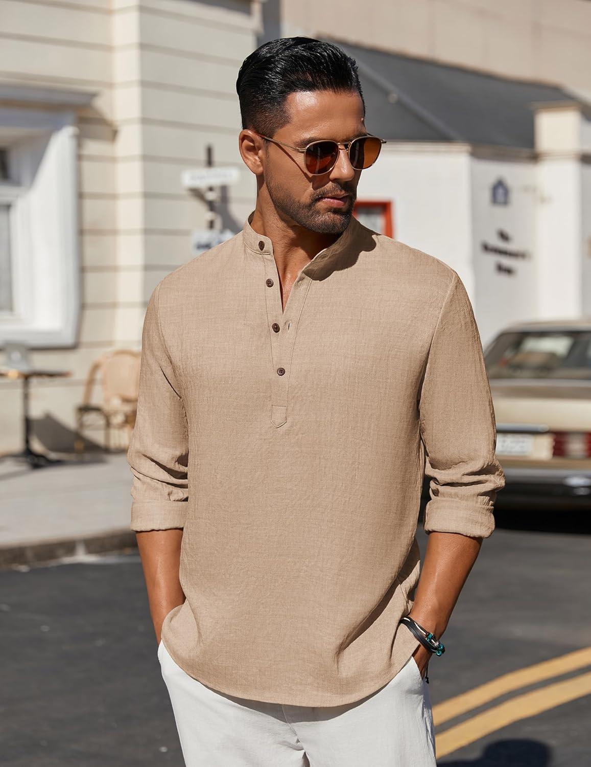 COOFANDY Men’s Casual Henley Shirt Long Sleeve Band Collar Shirts Summer Beach Hippie Button T-Shirts(Khaki)