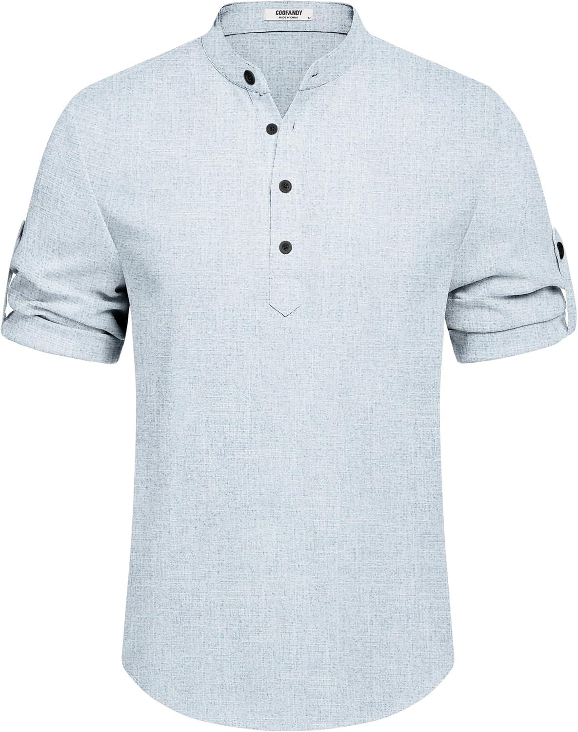 COOFANDY Men’s Casual Henley Shirt Short Sleeve Band Collar Linen Shirt Summer Beach Hippie T-Shirts(Flecking Light Blue)