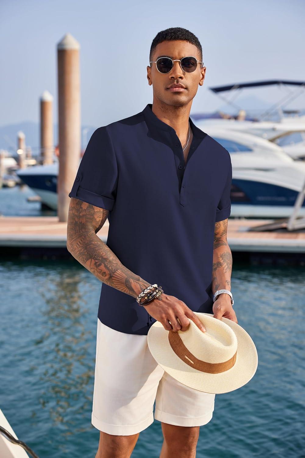 COOFANDY Men’s Casual Henley Shirt Short Sleeve Band Collar Linen Shirt Summer Beach Hippie T-Shirts(Navy Blue)