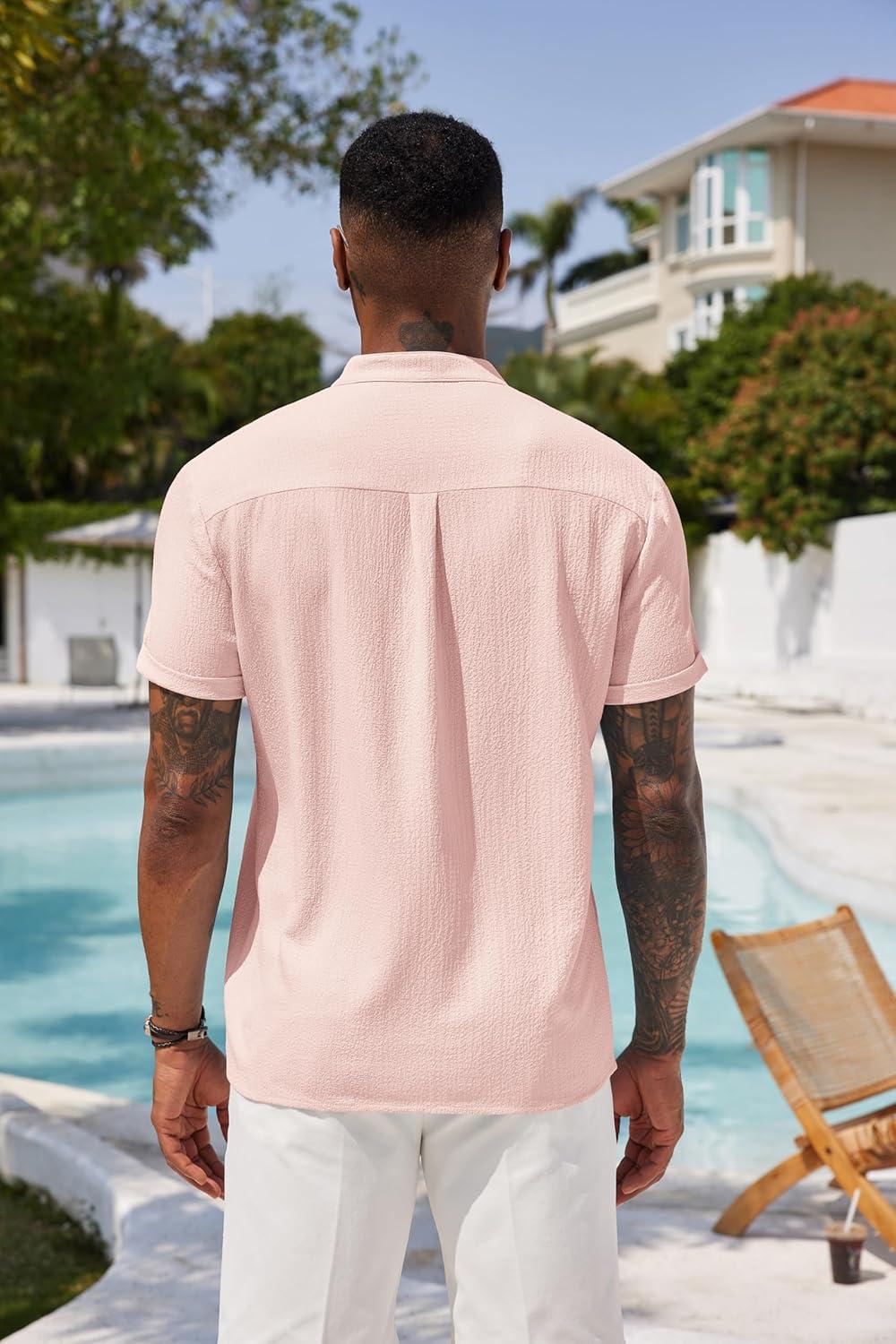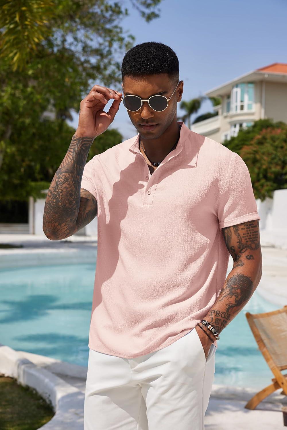 COOFANDY Men’s Casual Henley Shirt Short Sleeve Band Collar Shirt Summer Beach Hippie Vacation T Shirt with Button(Dark Pink)