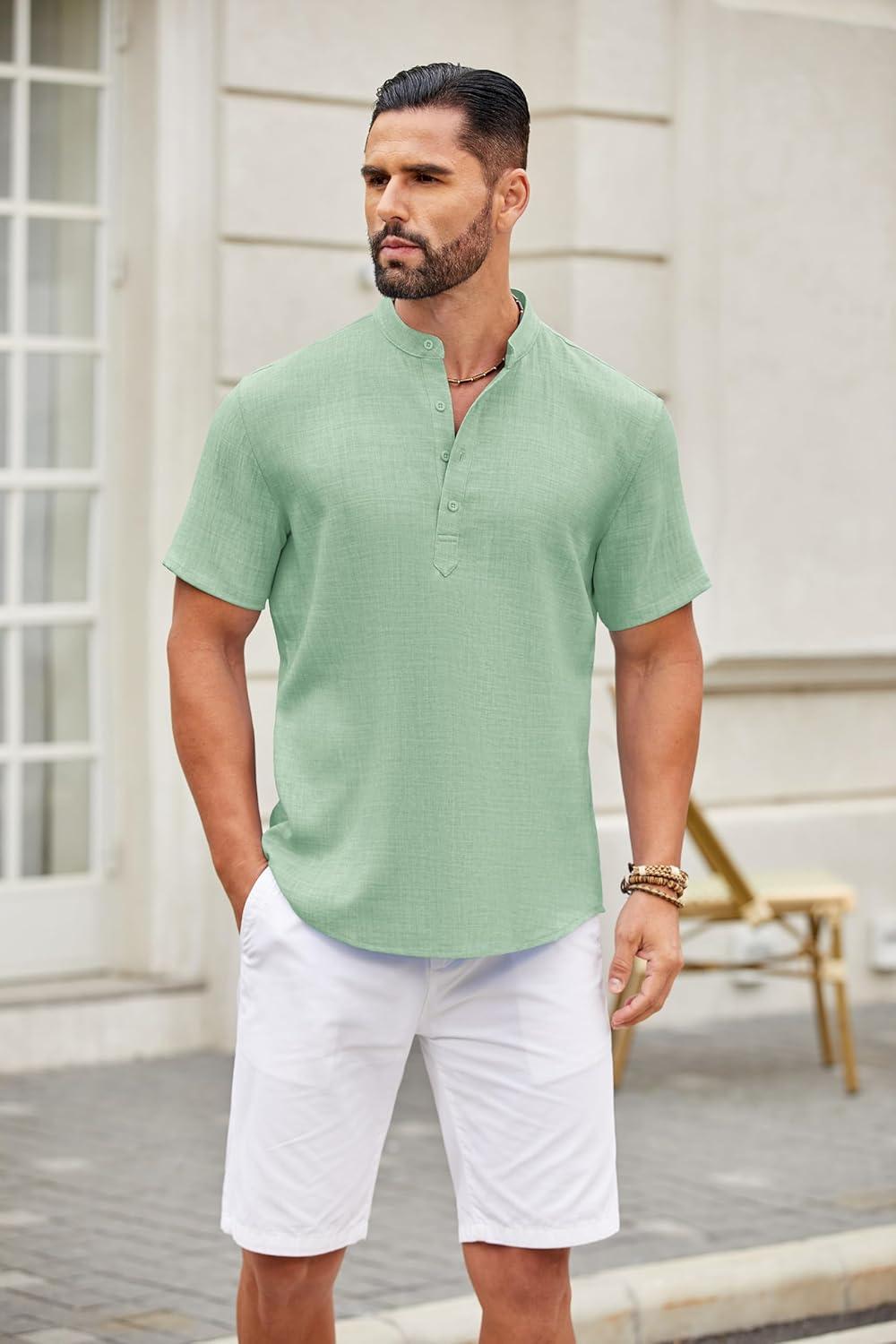 COOFANDY Men’s Casual Henley Shirt Short Sleeve Summer Shirts Linen Band Collar Summer Beach Hippie T-Shirts(Light Green)