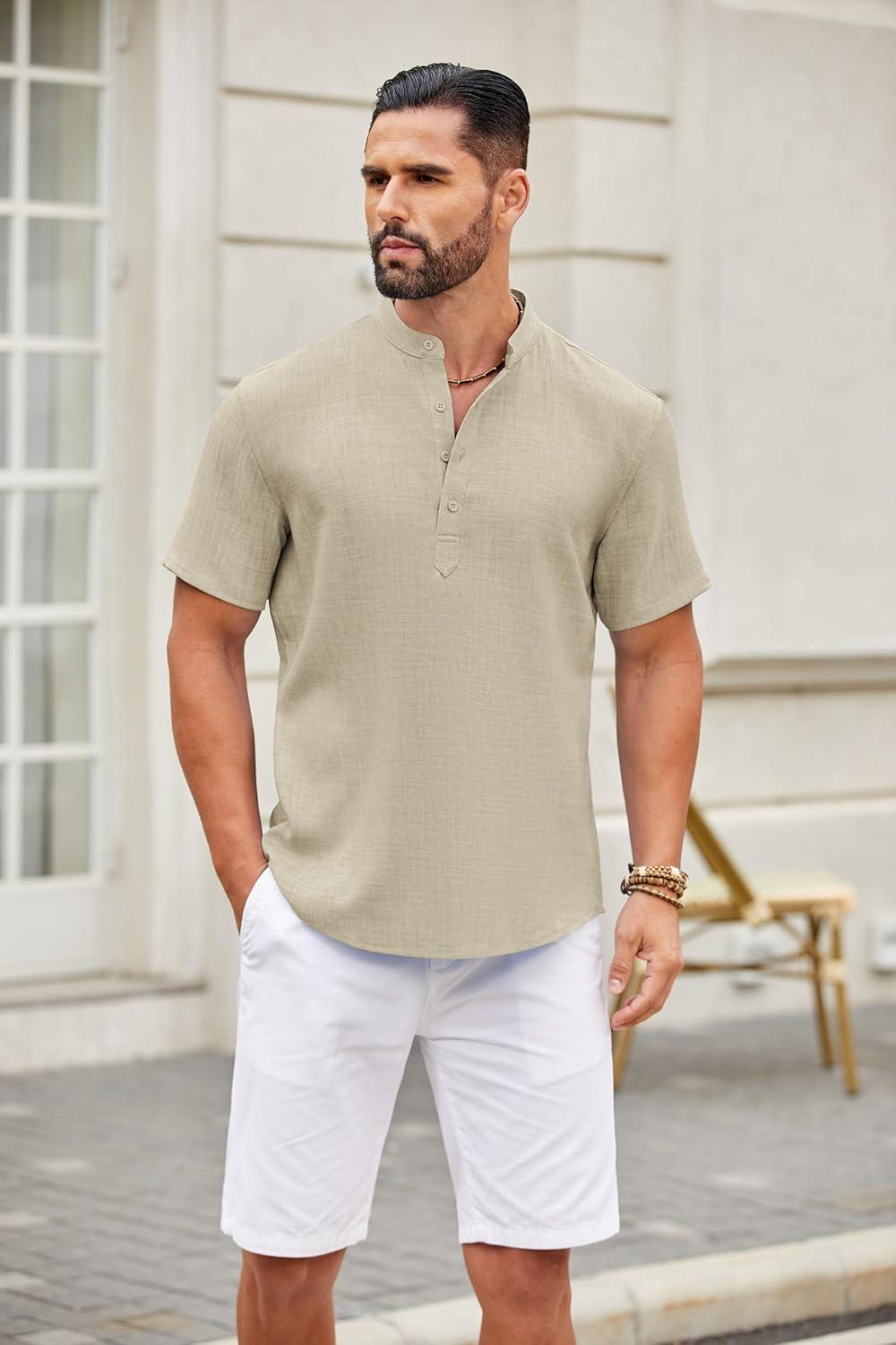COOFANDY Men’s Casual Henley Shirt Short Sleeve Summer Shirts Linen Band Collar Summer Beach Hippie T-Shirts(Light Khaki)