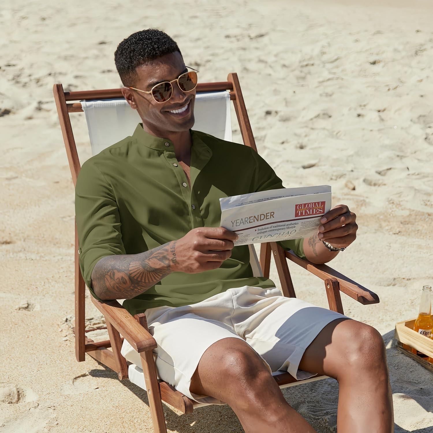 COOFANDY Men’s Casual Henley Shirts Long Sleeve Band Collar Lightweight Beach Shirts Summer T-Shirts(Army Green)