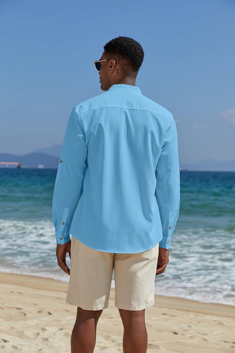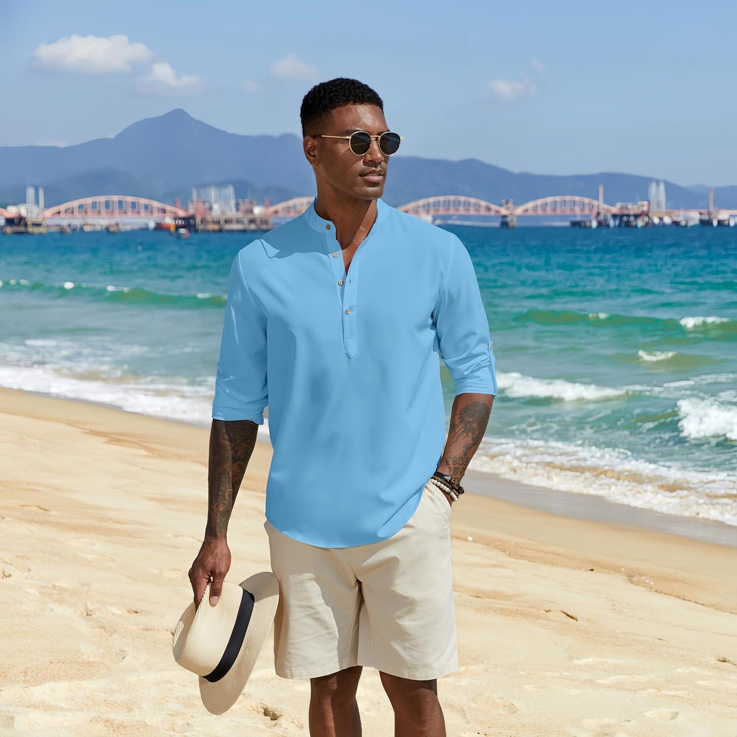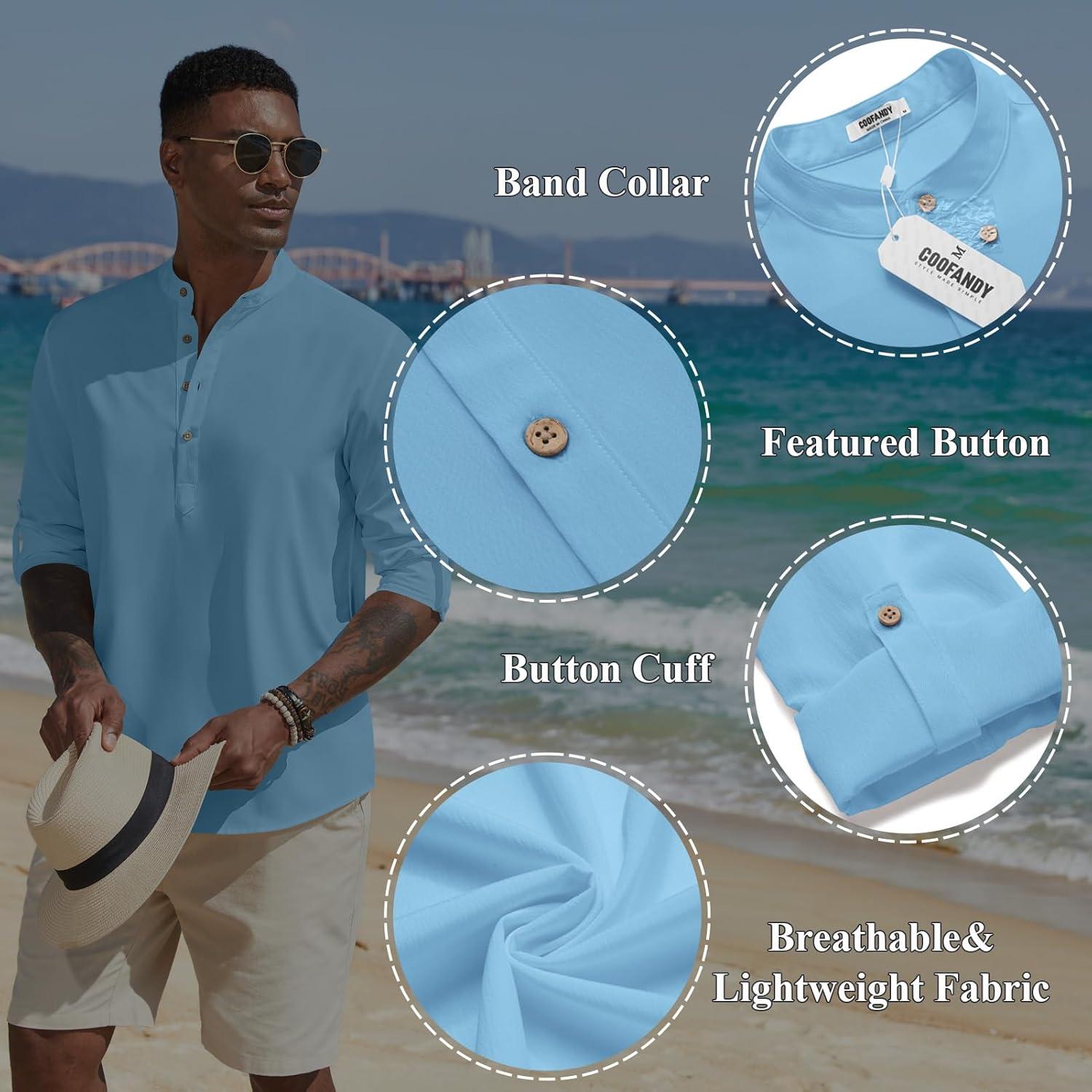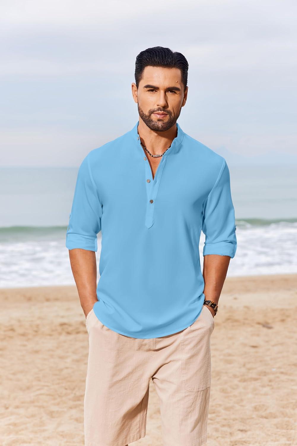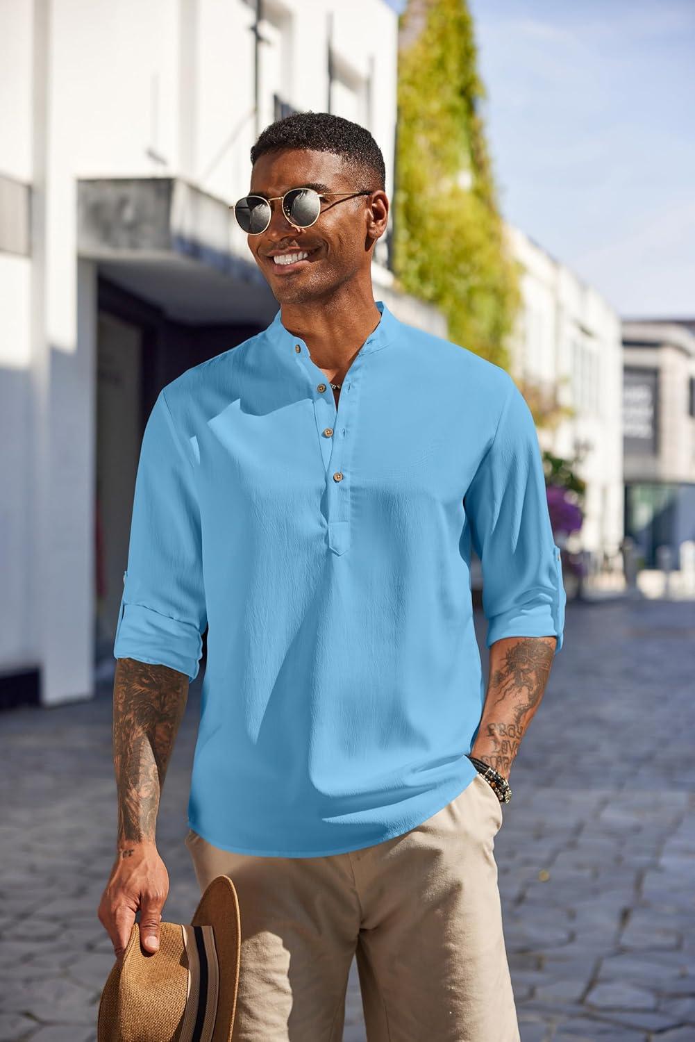 COOFANDY Men’s Casual Henley Shirts Long Sleeve Band Collar Lightweight Beach Shirts Summer T-Shirts(Denim Blue)
