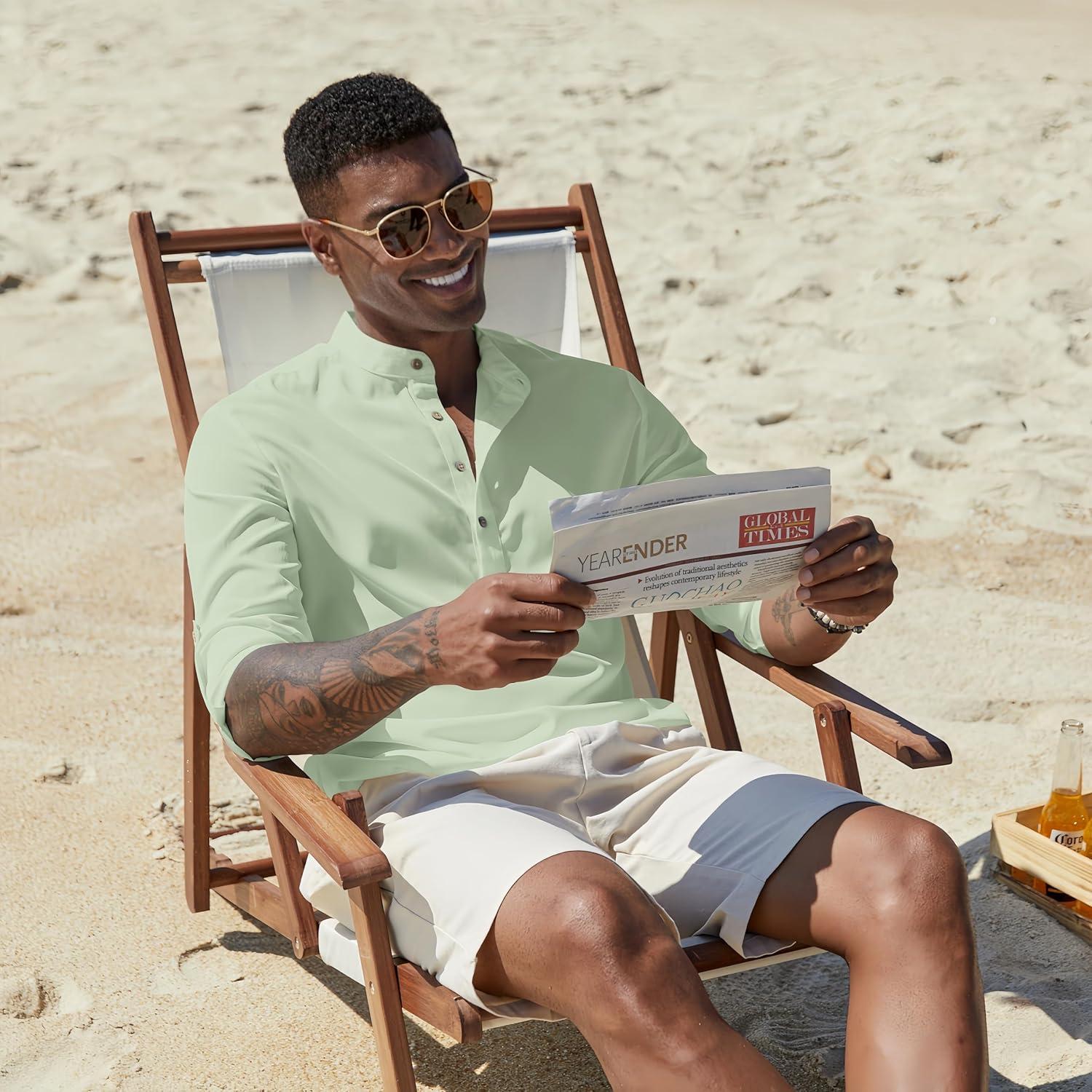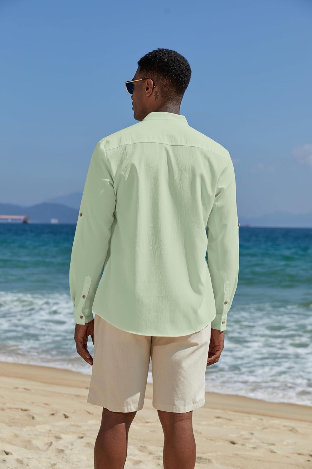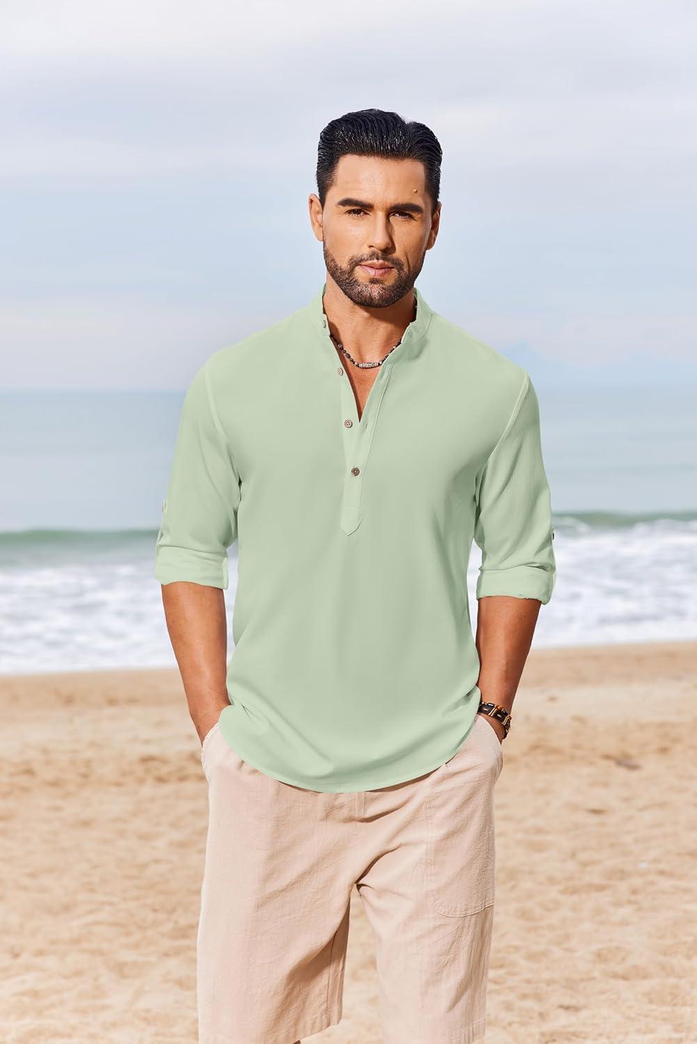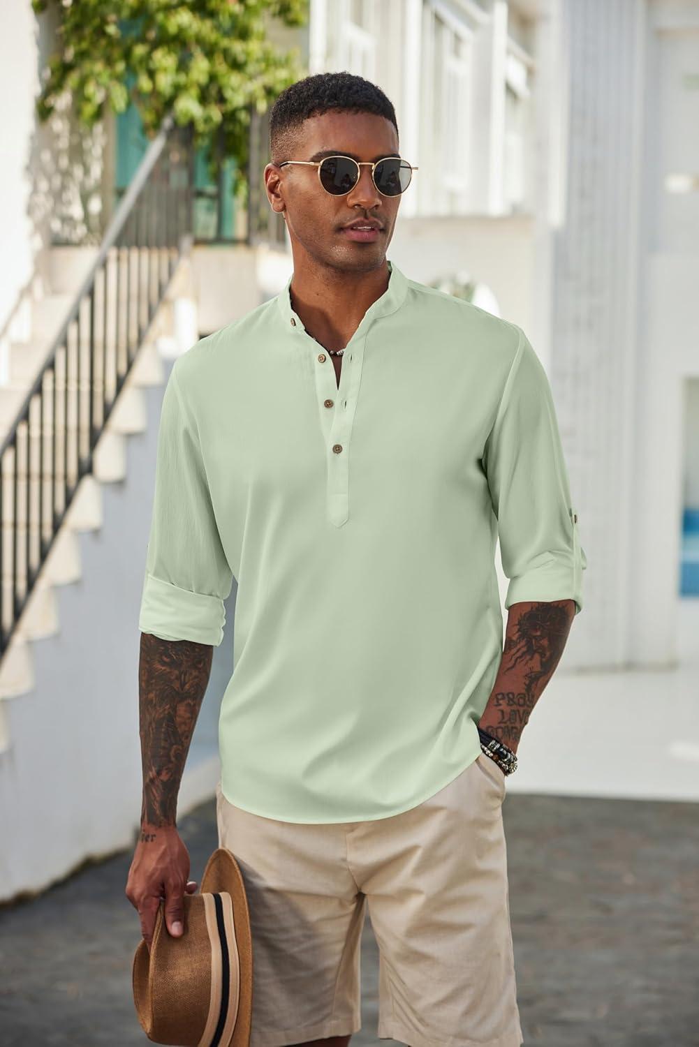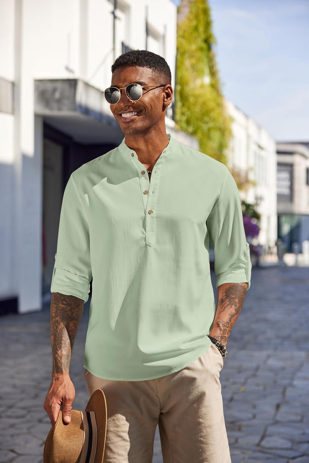COOFANDY Men’s Casual Henley Shirts Long Sleeve Band Collar Lightweight Beach Shirts Summer T-Shirts(Green)