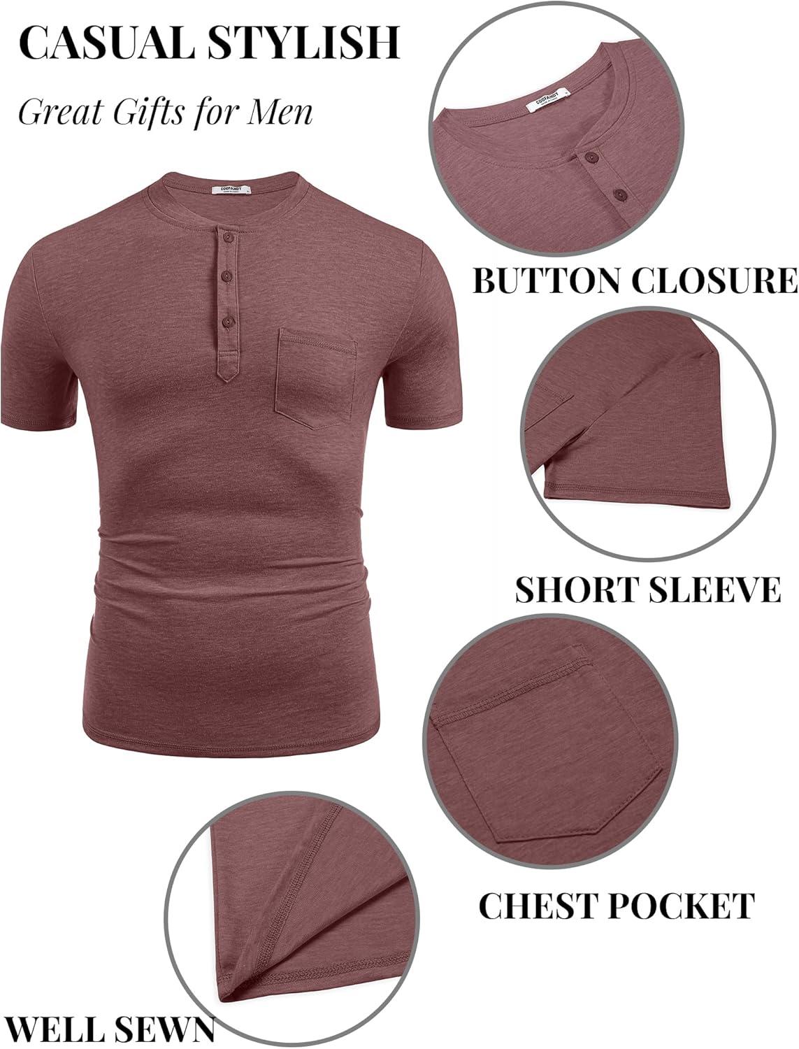 COOFANDY Men’s Casual Henley Shirts Short Sleeve Pocket T-Shirts Lightweight Button Henley Pullover Basic Tees(Wine Red)