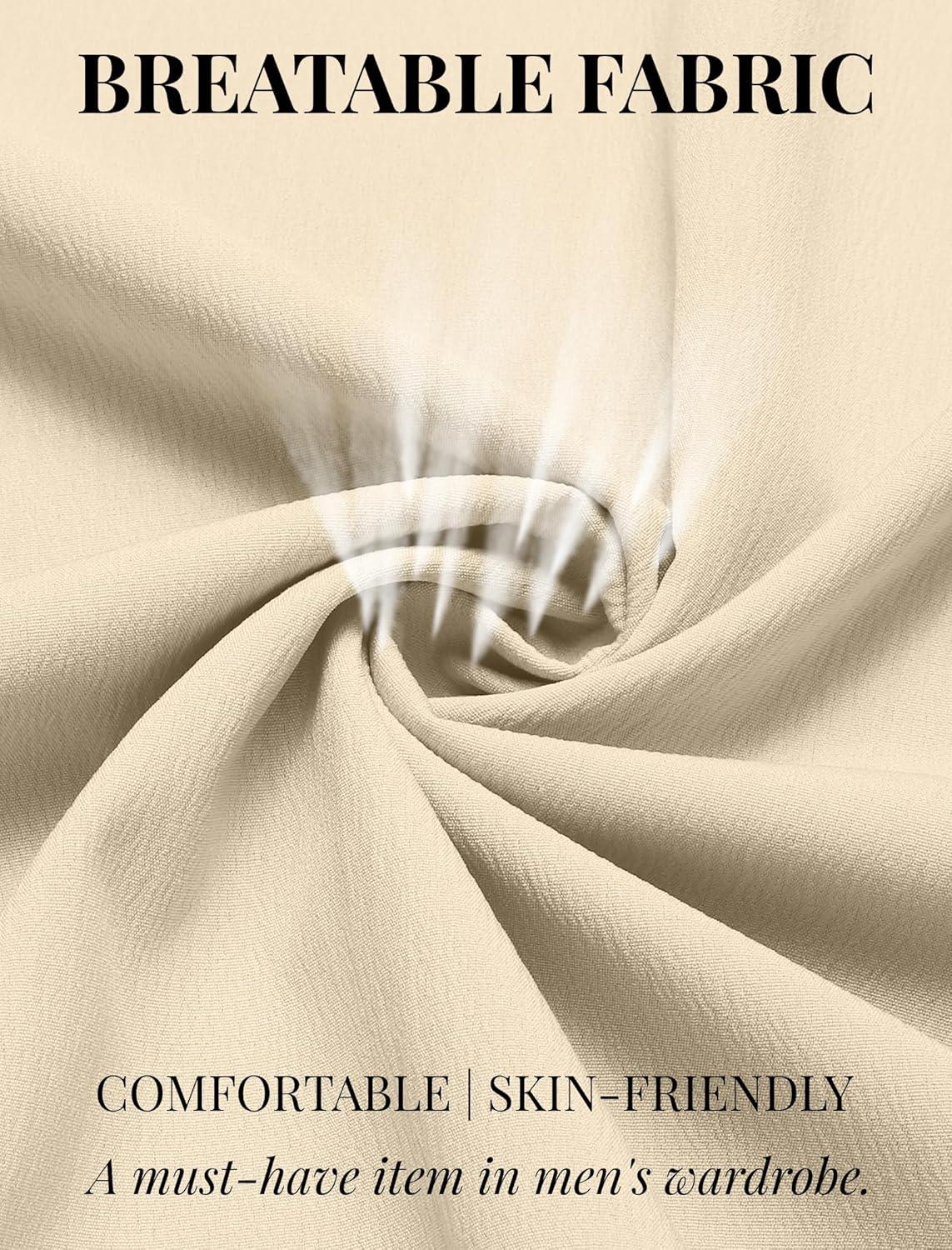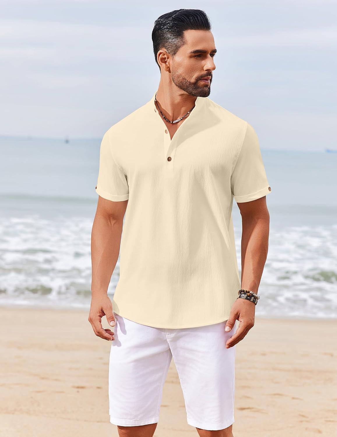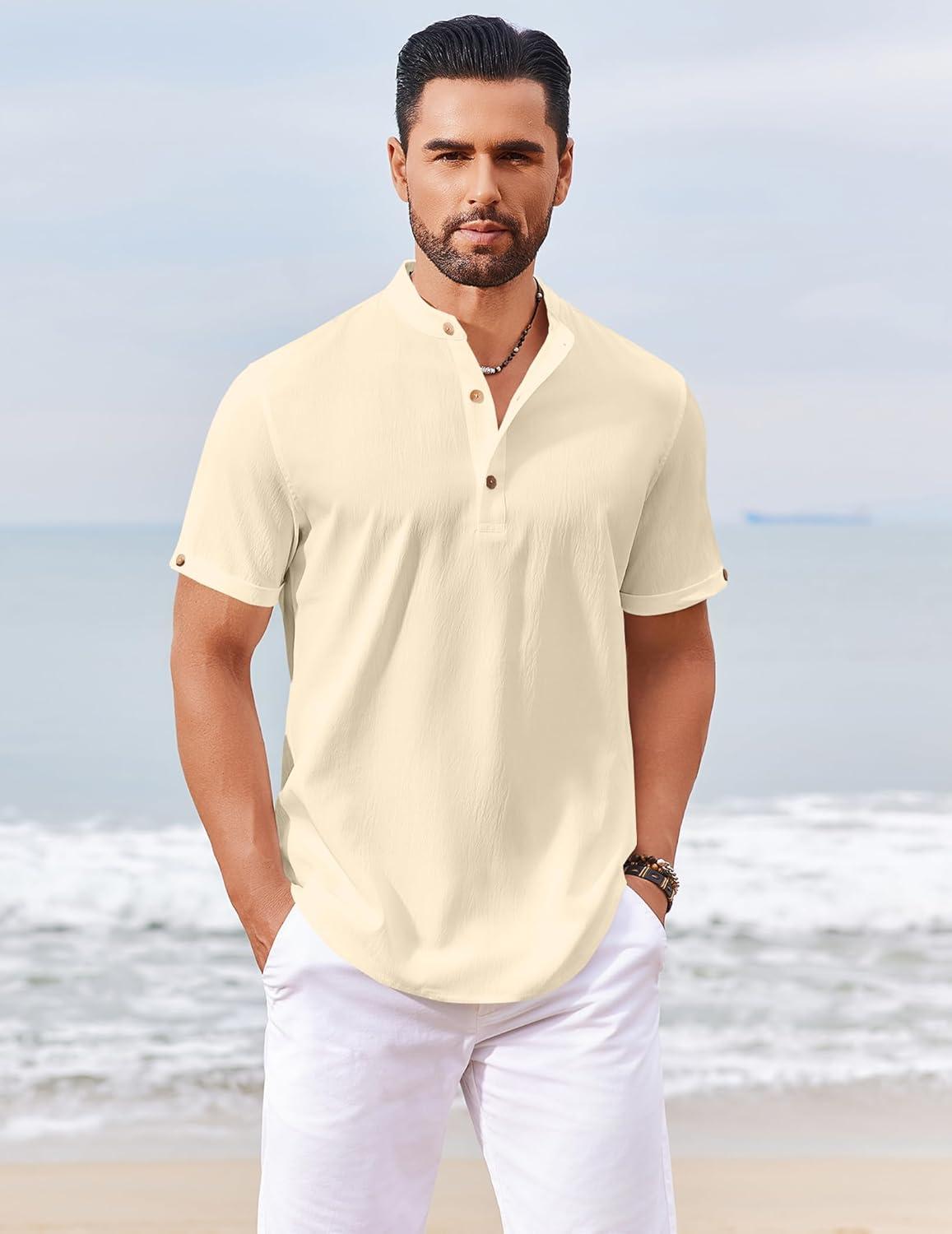 COOFANDY Men’s Casual Henley Shirts Short Sleeve Summer Beach T-Shirts Banded Collar Henleys Button Tee Shirt(Beige)