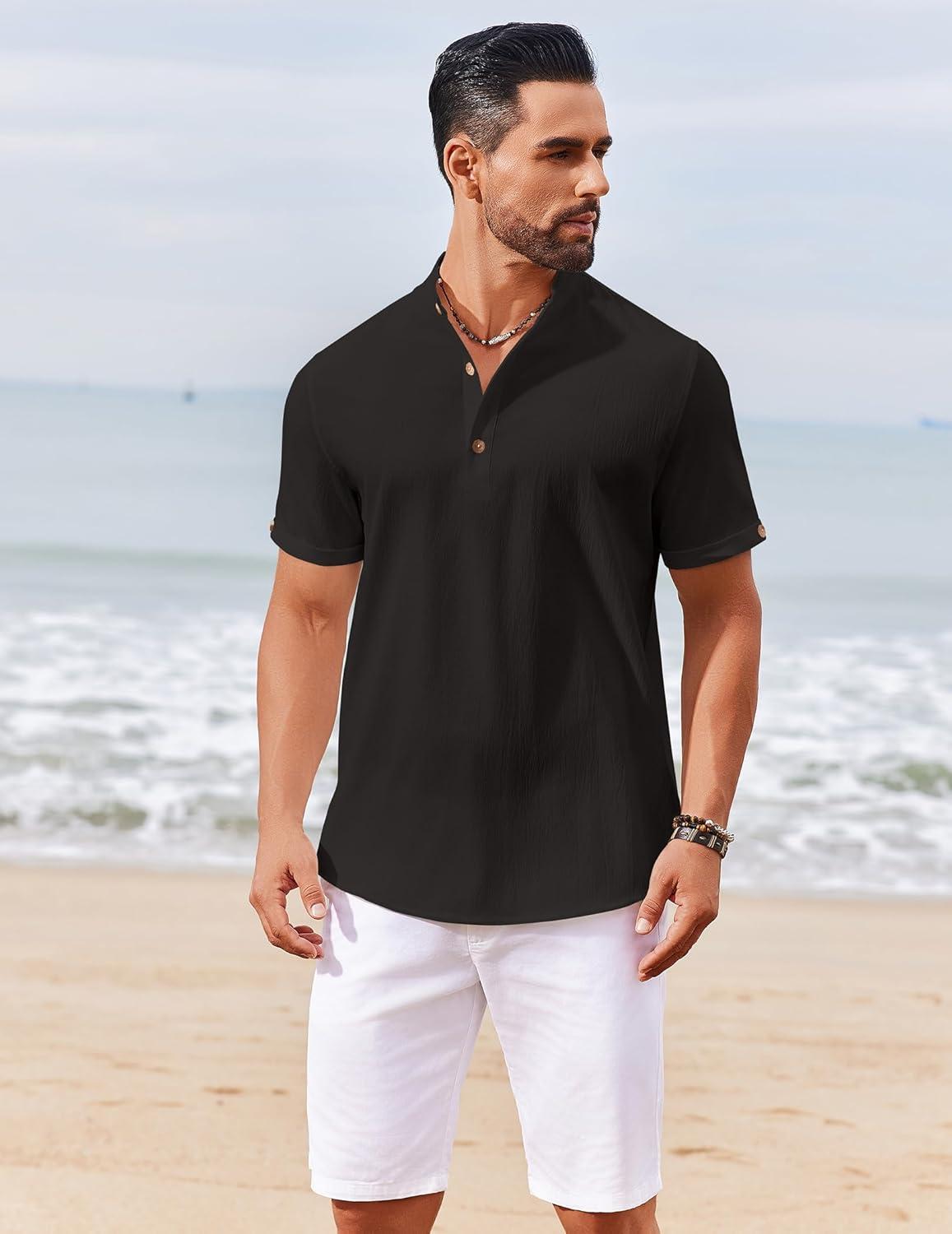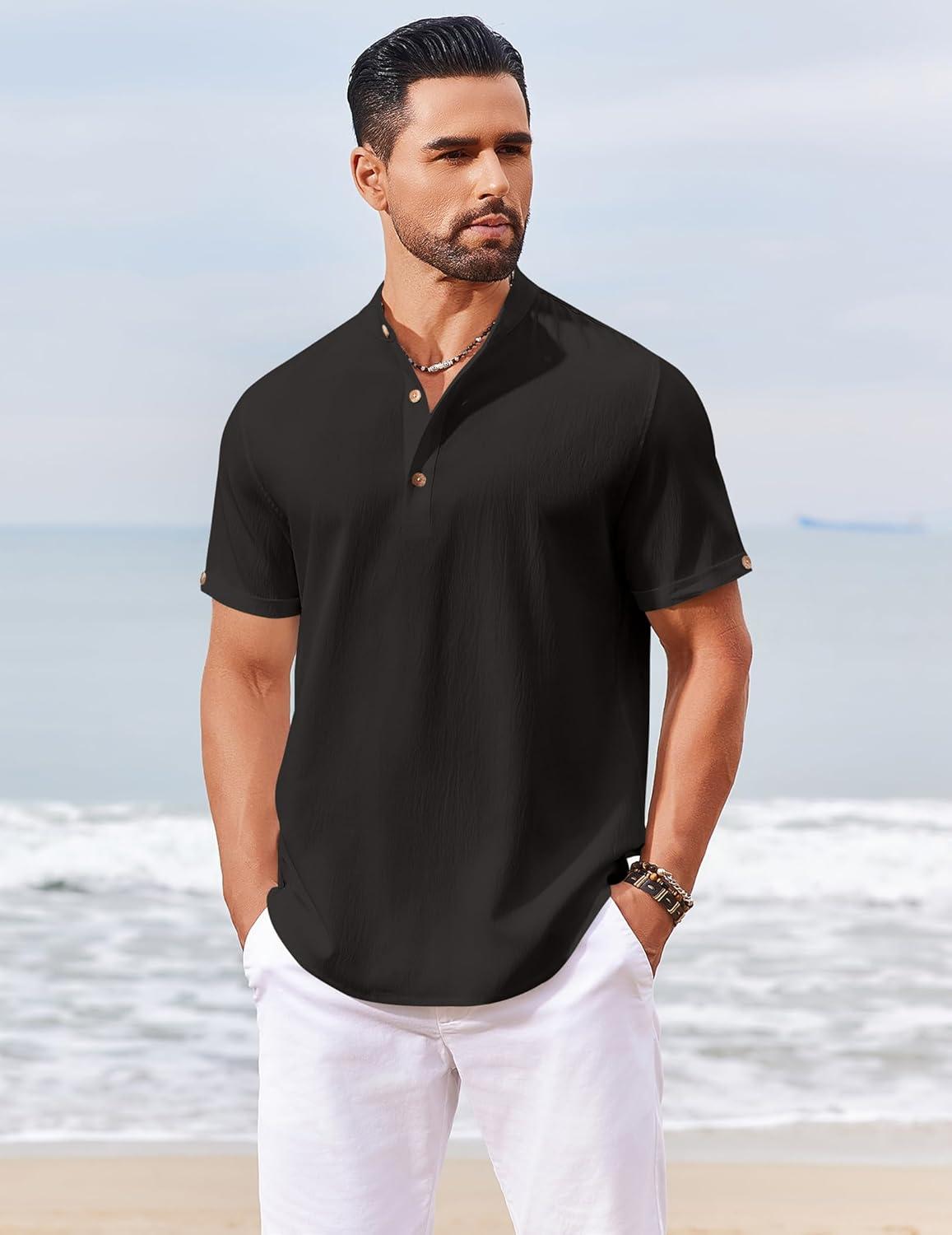 COOFANDY Men’s Casual Henley Shirts Short Sleeve Summer Beach T-Shirts Banded Collar Henleys Button Tee Shirt(Black)