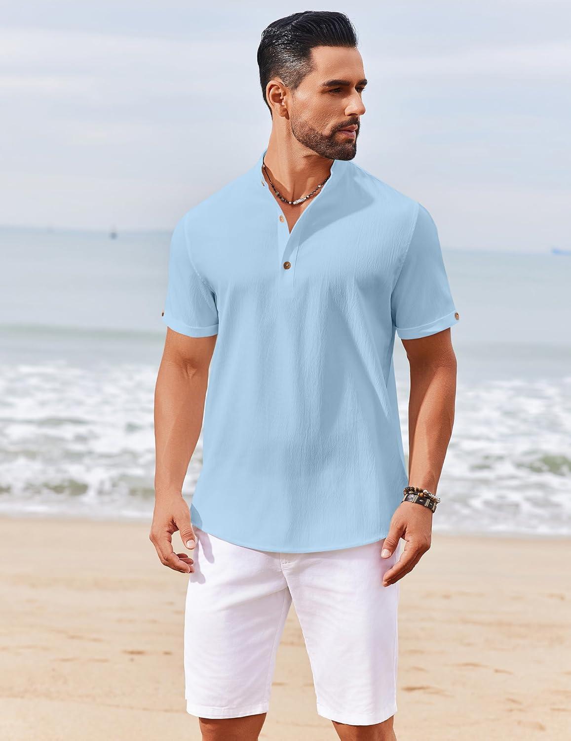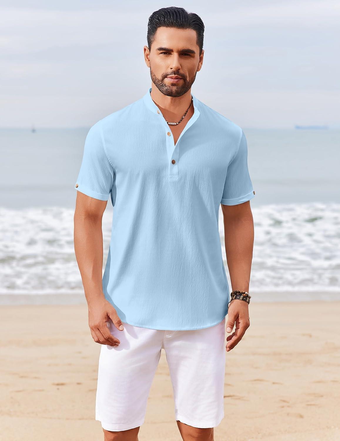 COOFANDY Men’s Casual Henley Shirts Short Sleeve Summer Beach T-Shirts Banded Collar Henleys Button Tee Shirt(Blue)