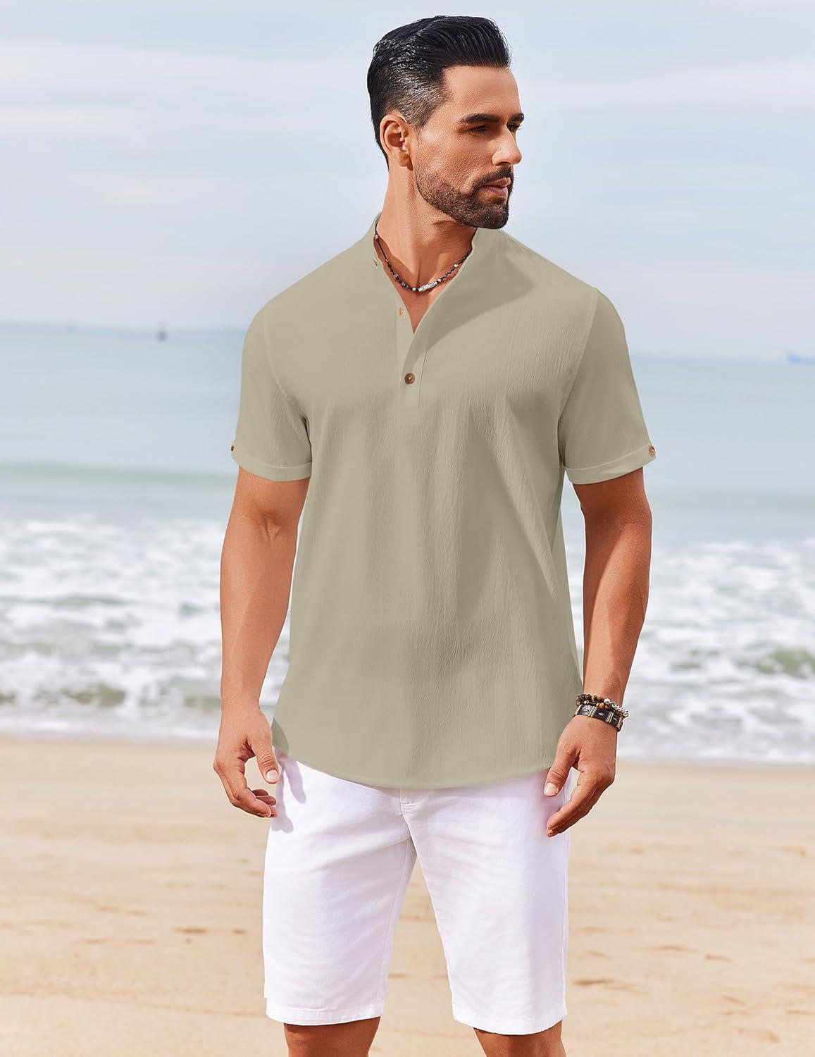 COOFANDY Men’s Casual Henley Shirts Short Sleeve Summer Beach T-Shirts Banded Collar Henleys Button Tee Shirt(Gray Green)