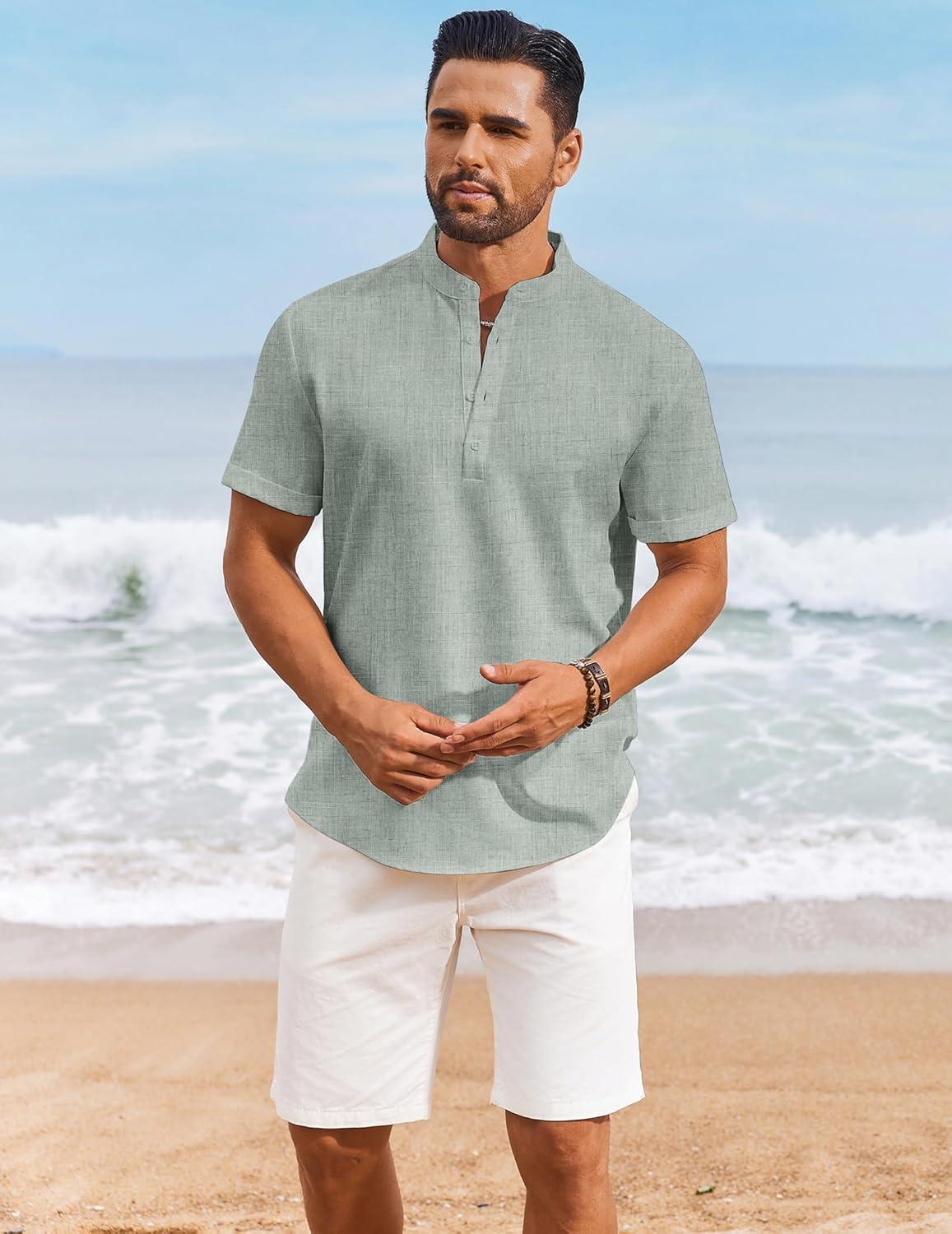 COOFANDY Men’s Casual Linen Henley Shirts Short Sleeve Band Collar Summer Beach Vacation T-Shirts(Light Green)