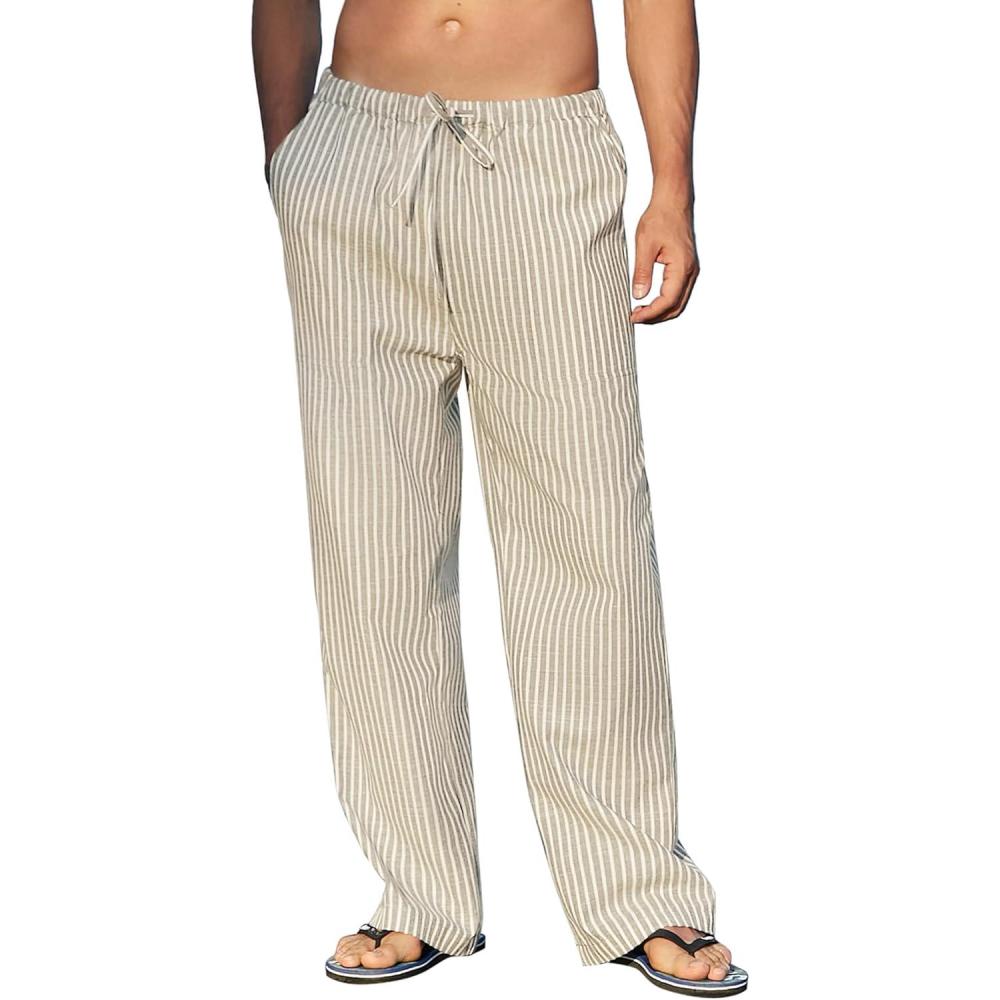 COOFANDY Mens Casual Linen Pants Elastic Waist Linen Pants Drawstring Summer Beach Yoga Linen Trouser(Striped- Khaki)