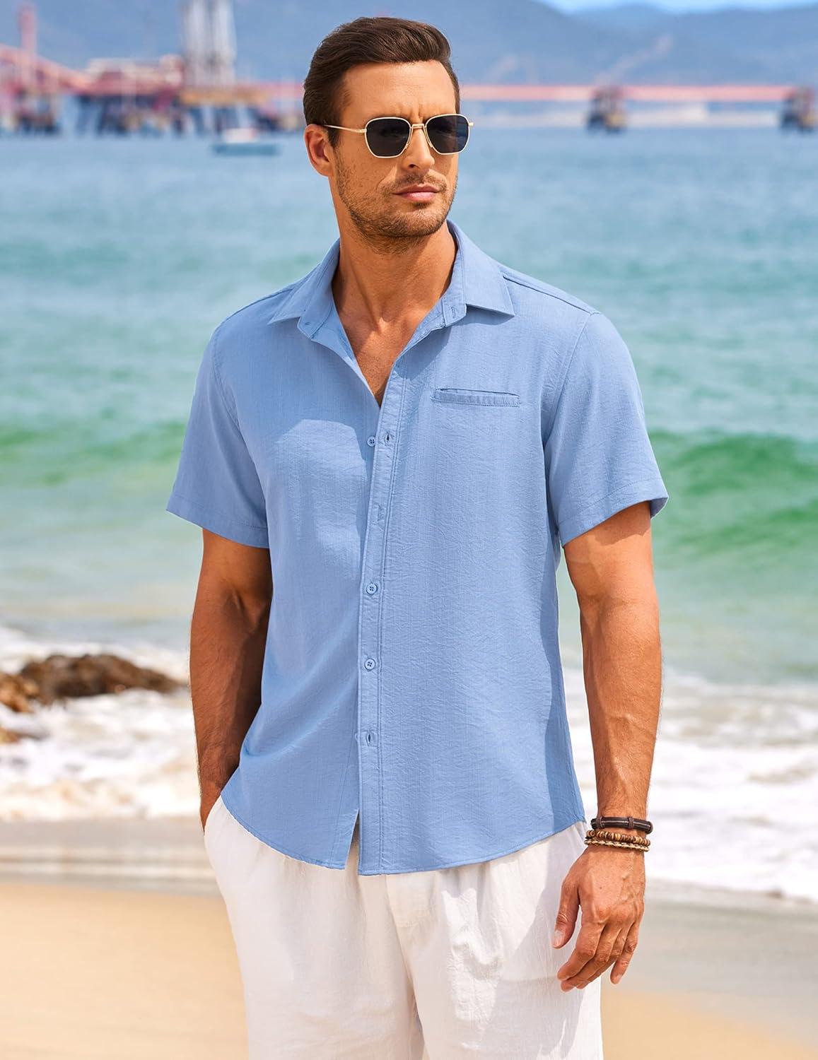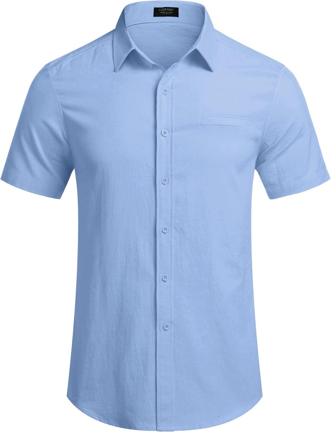 COOFANDY Mens Casual Linen Shirt Short Sleeve Button Down Shirt Summer Beach Hawaiian Shirts(Blue)