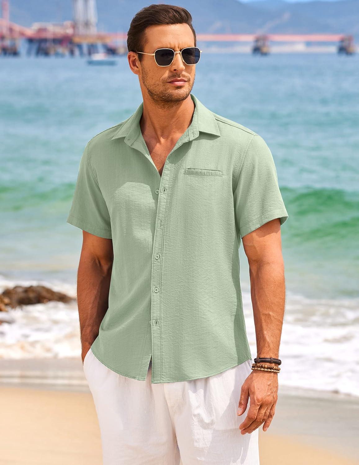 COOFANDY Mens Casual Linen Shirt Short Sleeve Button Down Shirt Summer Beach Hawaiian Shirts(Green)