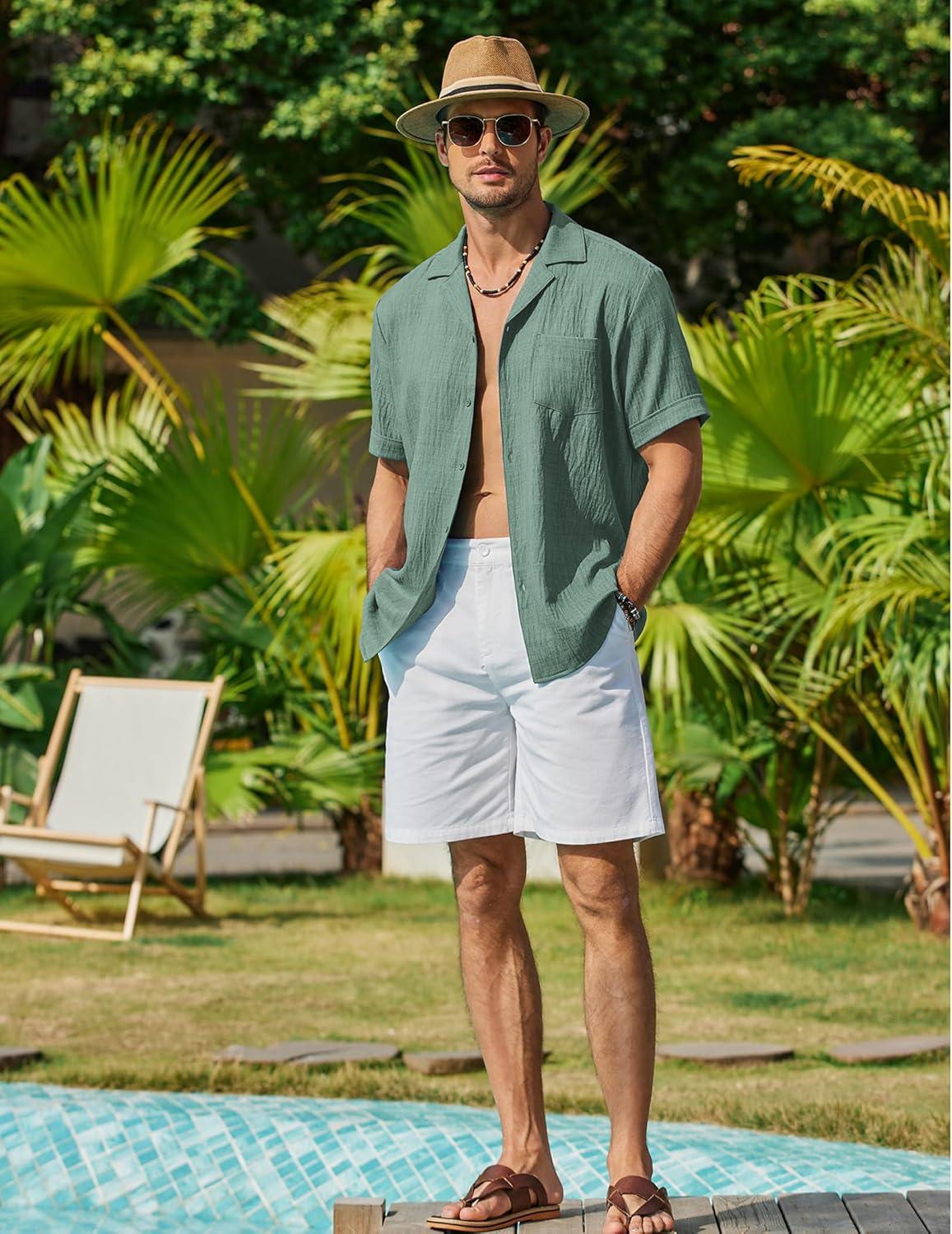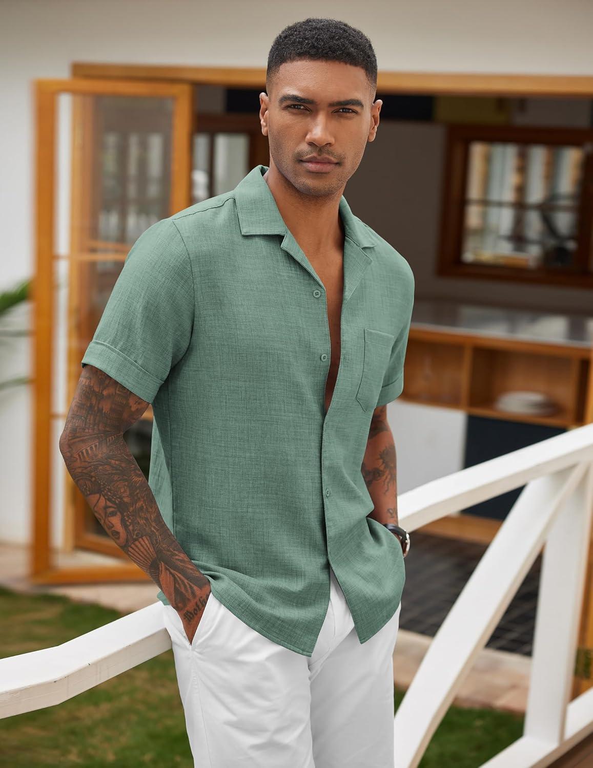 COOFANDY Mens Casual Linen Shirt Short Sleeve Button Down Shirt Summer Beach Hawaiian Shirts(Grey Green)