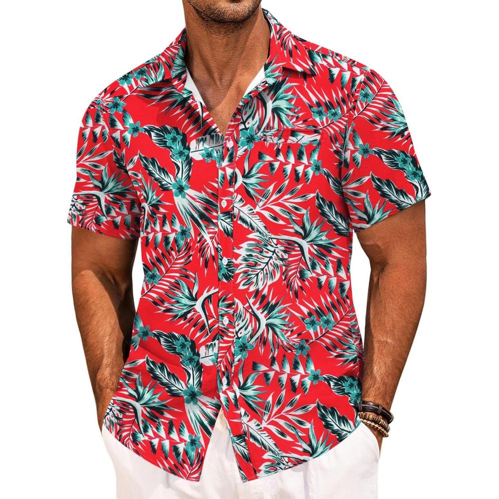 COOFANDY Mens Casual Linen Shirt Short Sleeve Button Down Shirt Summer Beach Hawaiian Shirts(Leaves-red)