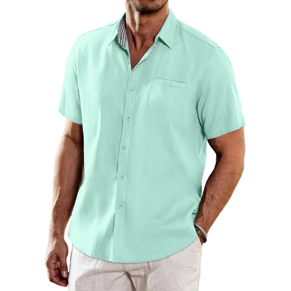 COOFANDY Men’s Casual Linen Shirts Short Sleeve Button Down Shirt Summer Beach Tops(Green)