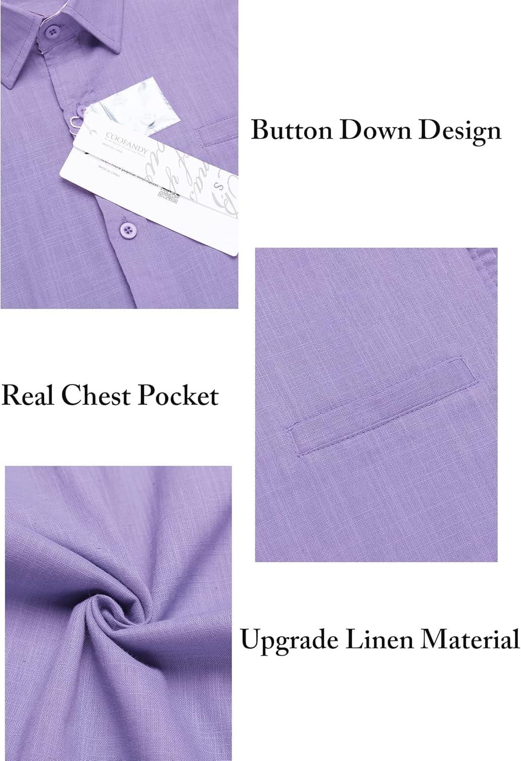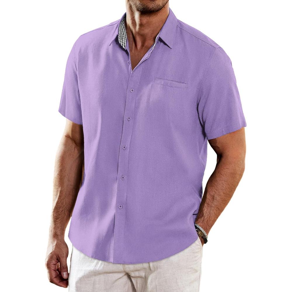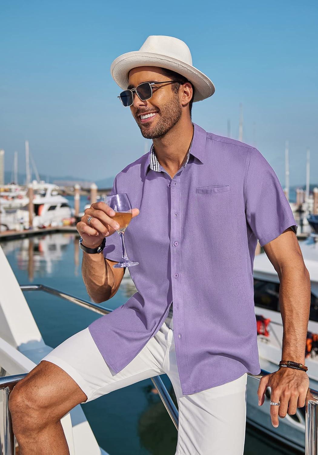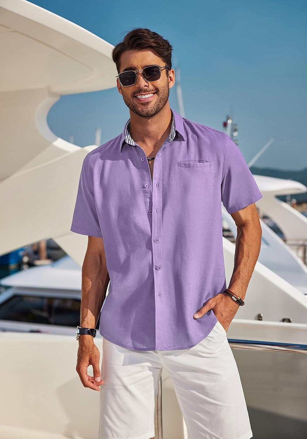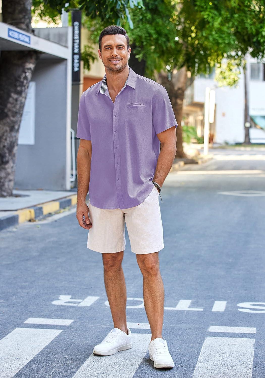 COOFANDY Men’s Casual Linen Shirts Short Sleeve Button Down Shirt Summer Beach Tops(Light Purple)