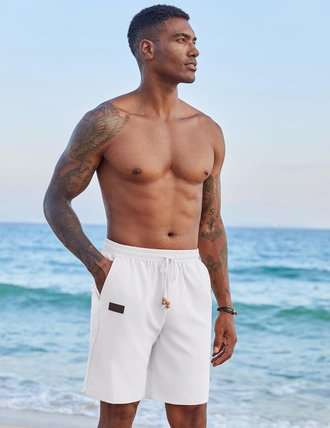 COOFANDY Mens Casual Linen Shorts Elastic Waist Drawstring Loose Fit Summer Beach Vacation Shorts with Pockets(White)
