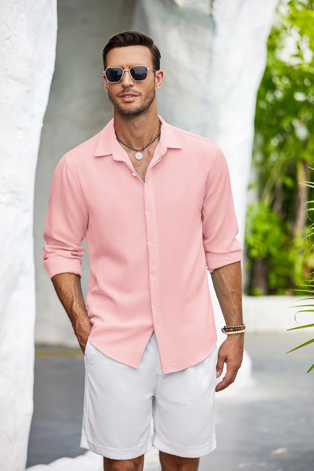 COOFANDY Men’s Casual Shirt Long Sleeve Casual Button Down Shirt for Men Summer Beach Wedding Shirt(Light Pink)