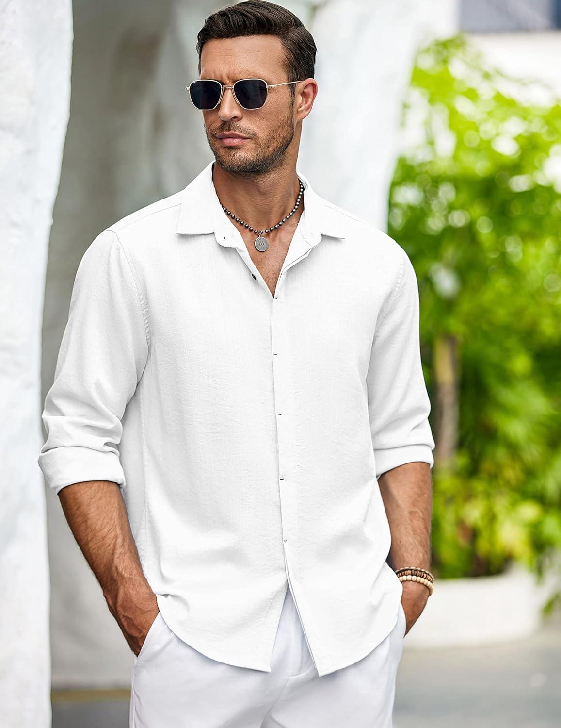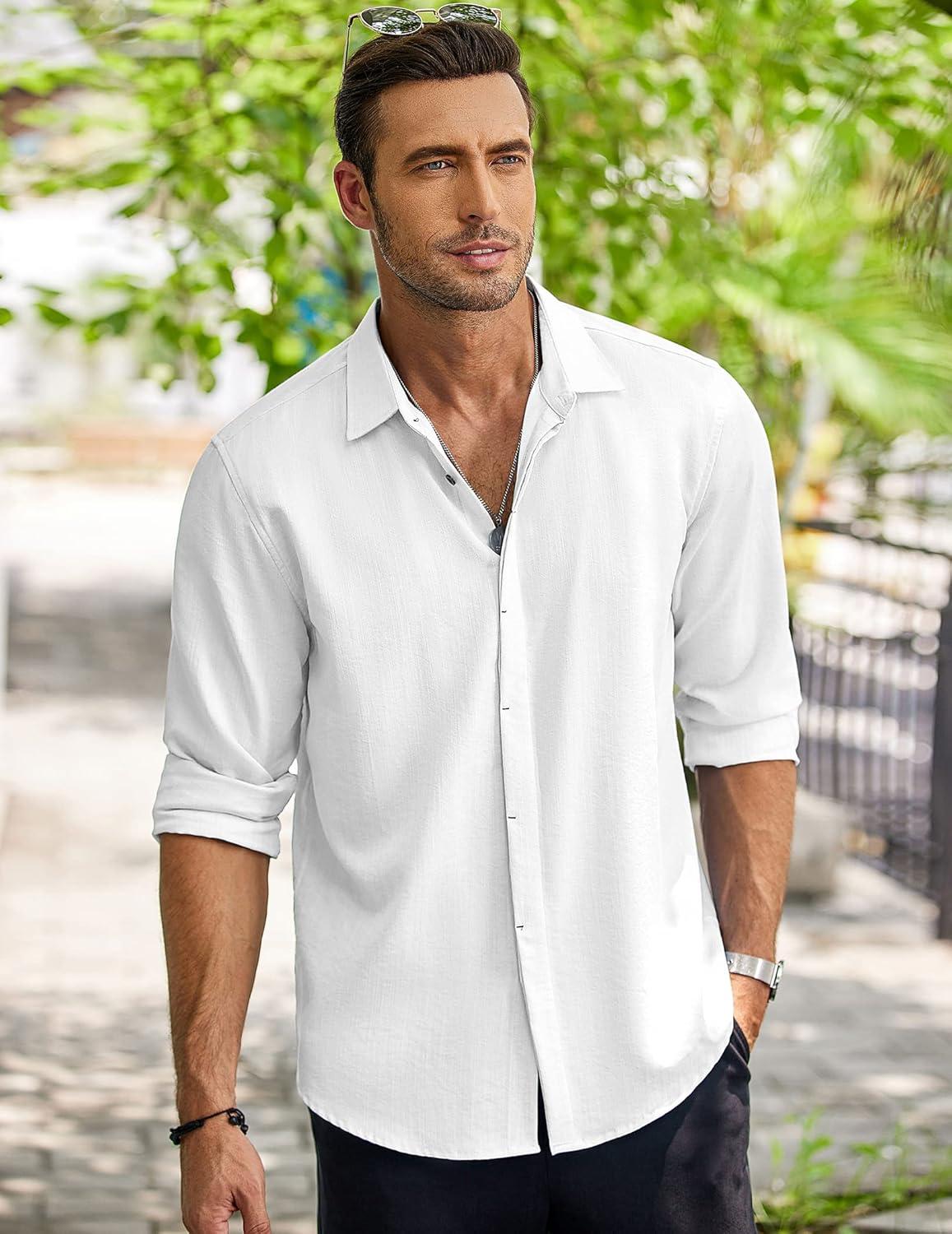COOFANDY Men’s Casual Shirt Long Sleeve Casual Button Down Shirt for Men Summer Beach Wedding Shirt(White)