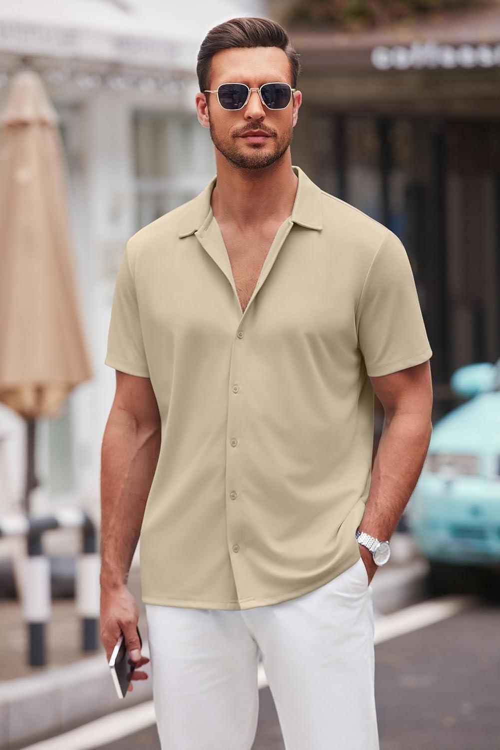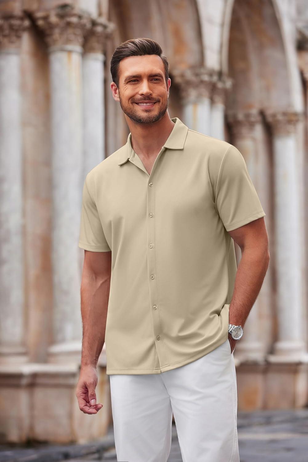 COOFANDY Mens Casual Shirts Short Sleeve Button Down Shirt Wrinkle Free Summer Shirt(Light Khaki)