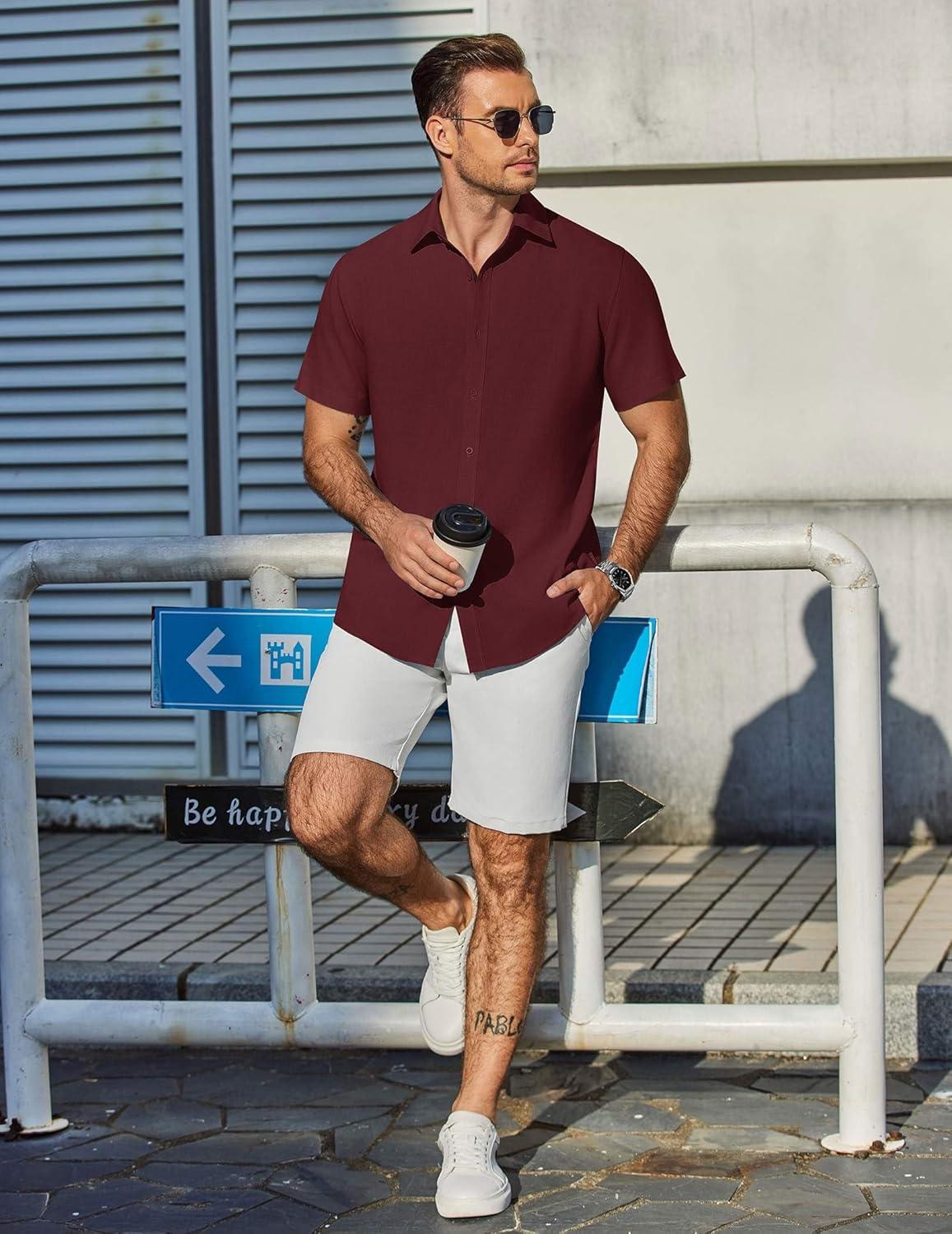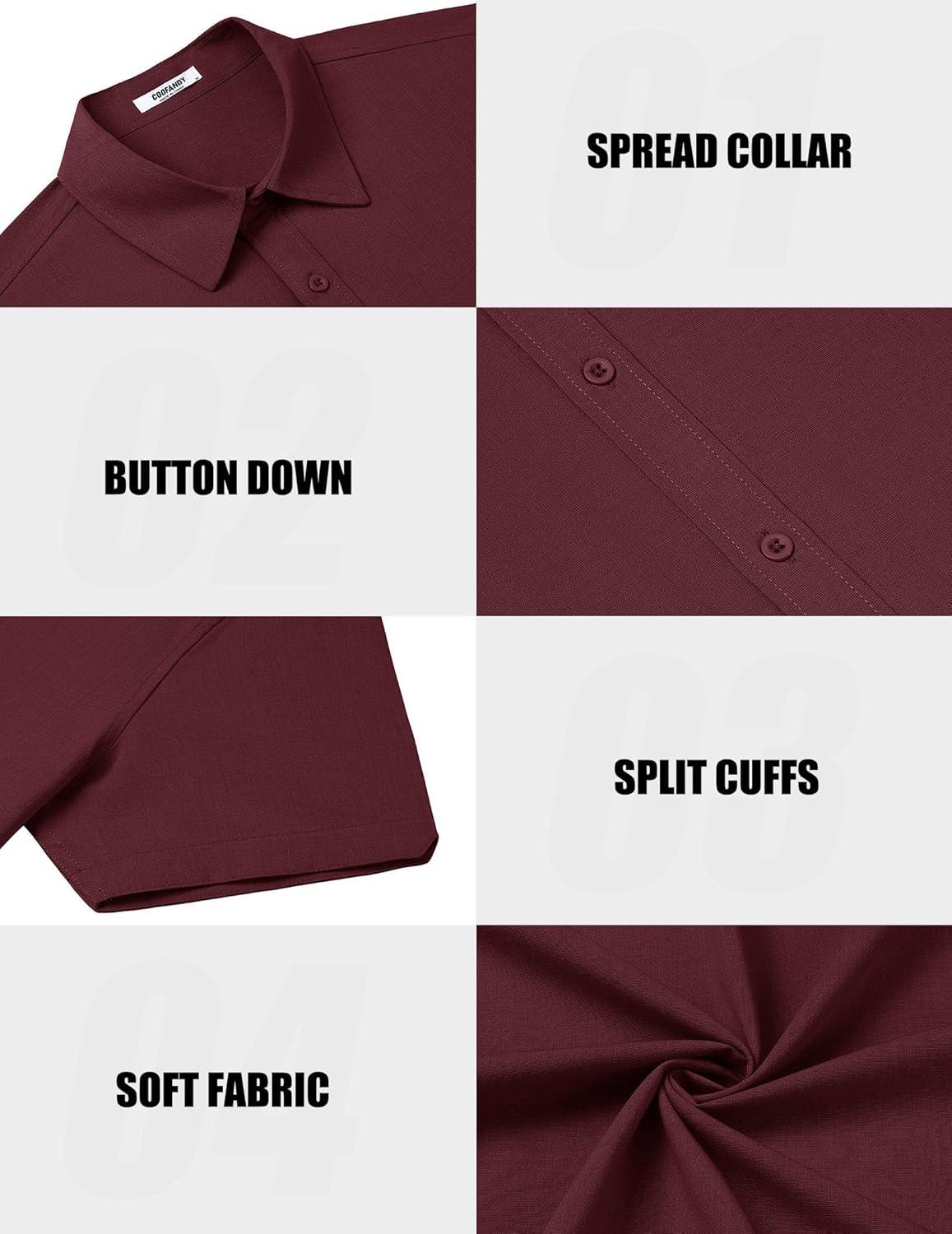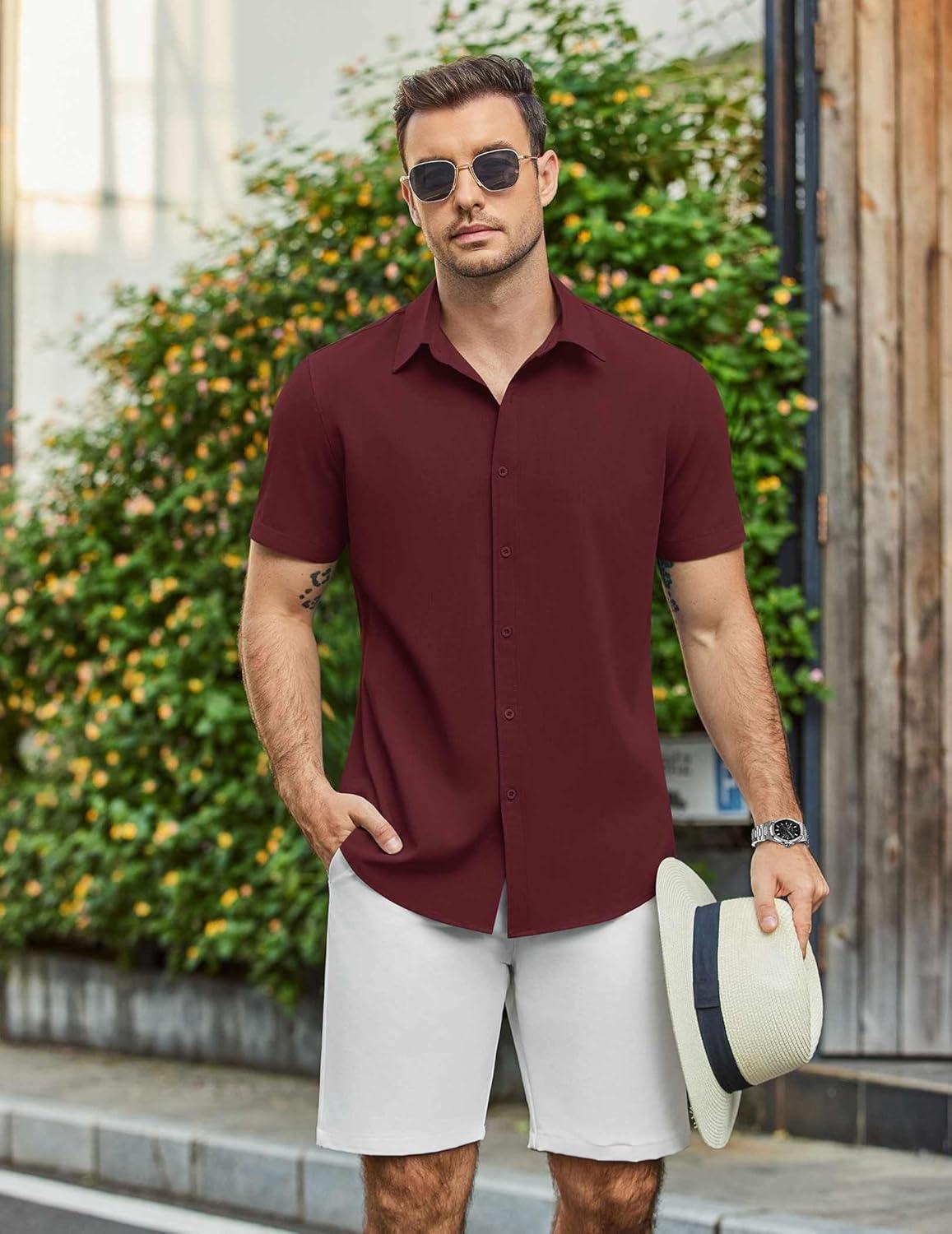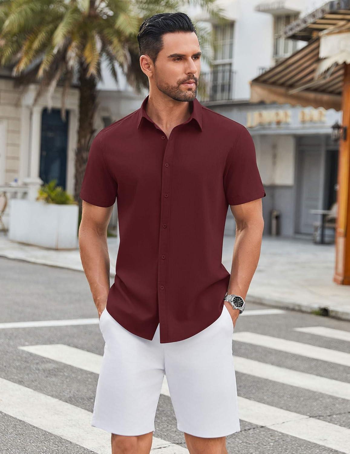 COOFANDY Mens Casual Shirts Short Sleeve Button Down Shirt Wrinkle Free Summer Shirt(Wine Red)