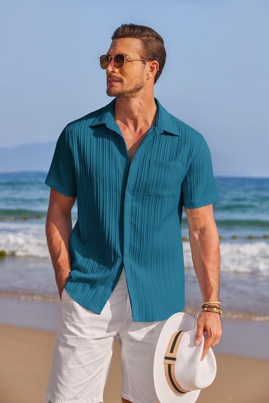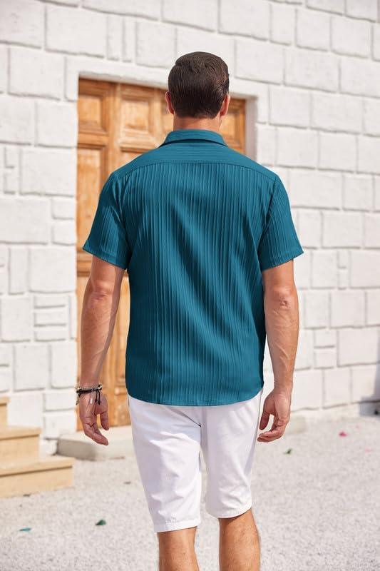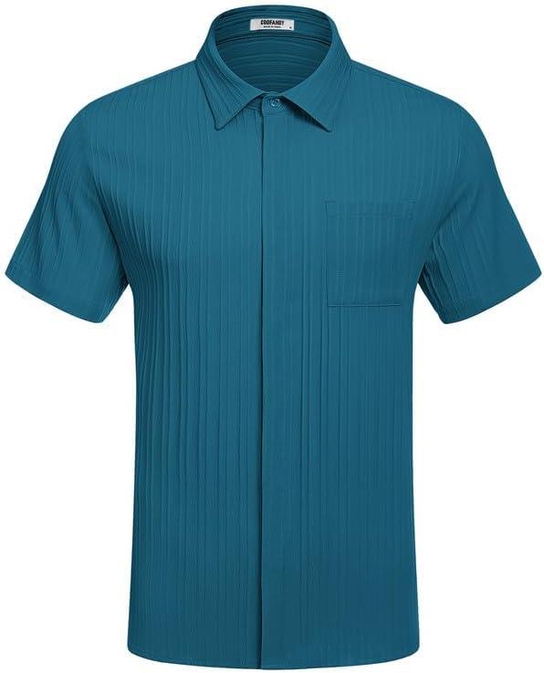 COOFANDY Mens Casual Shirts Short Sleeve Button Down Shirts Fashion Textured Summer Beach Shirt(Lake Blue)