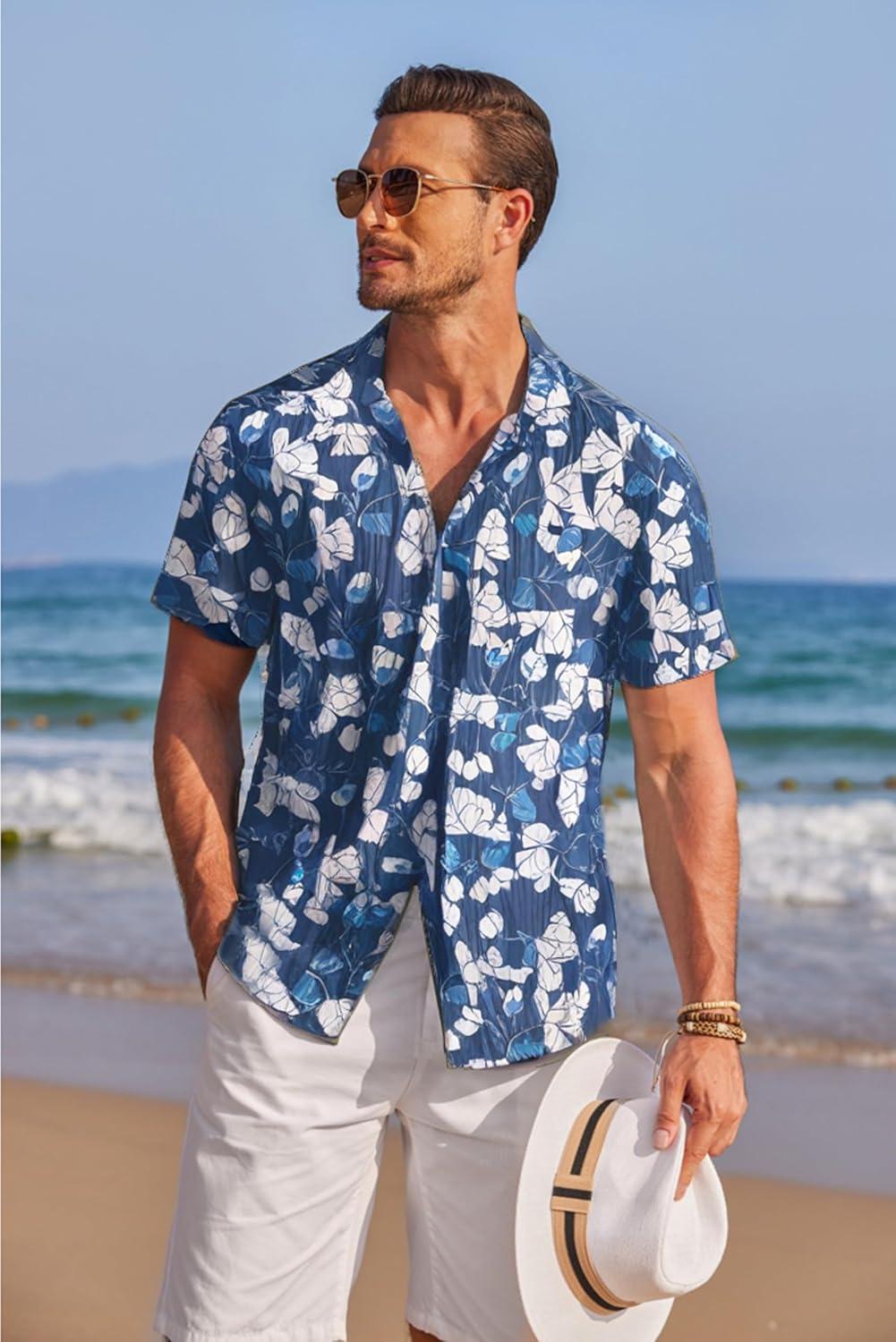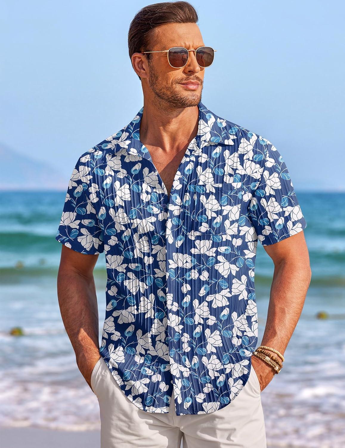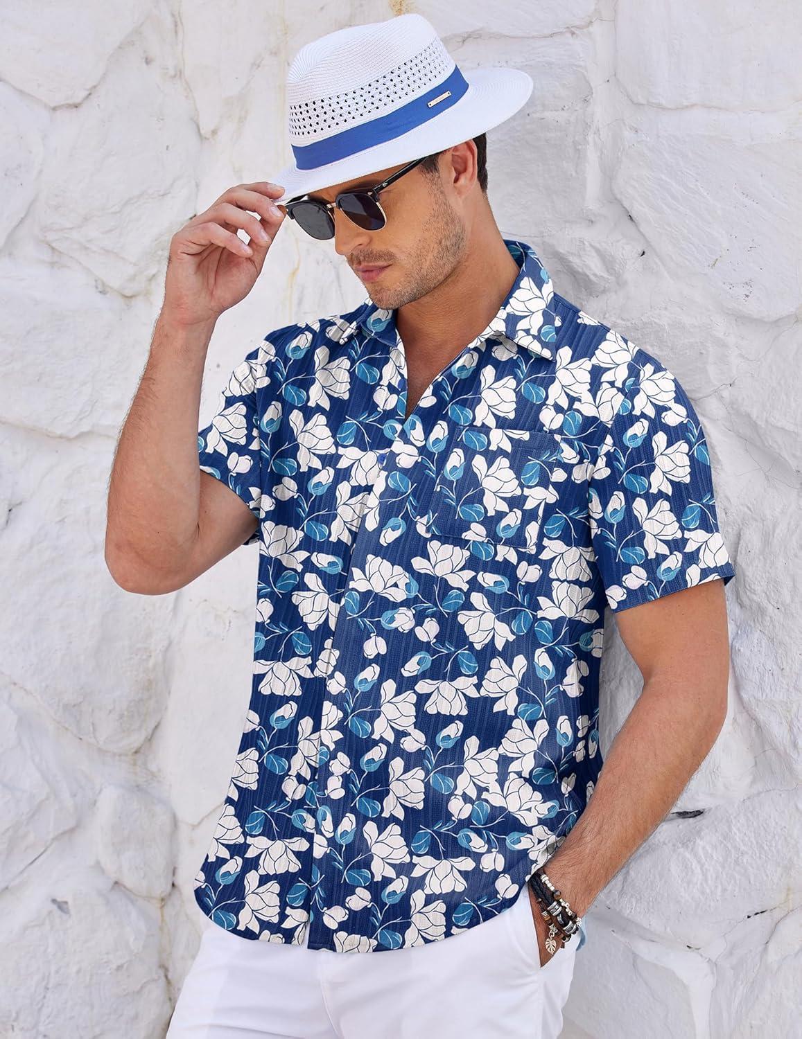 COOFANDY Mens Casual Shirts Short Sleeve Button Down Shirts Fashion Textured Summer Beach Shirt(Navy Blue Floral)