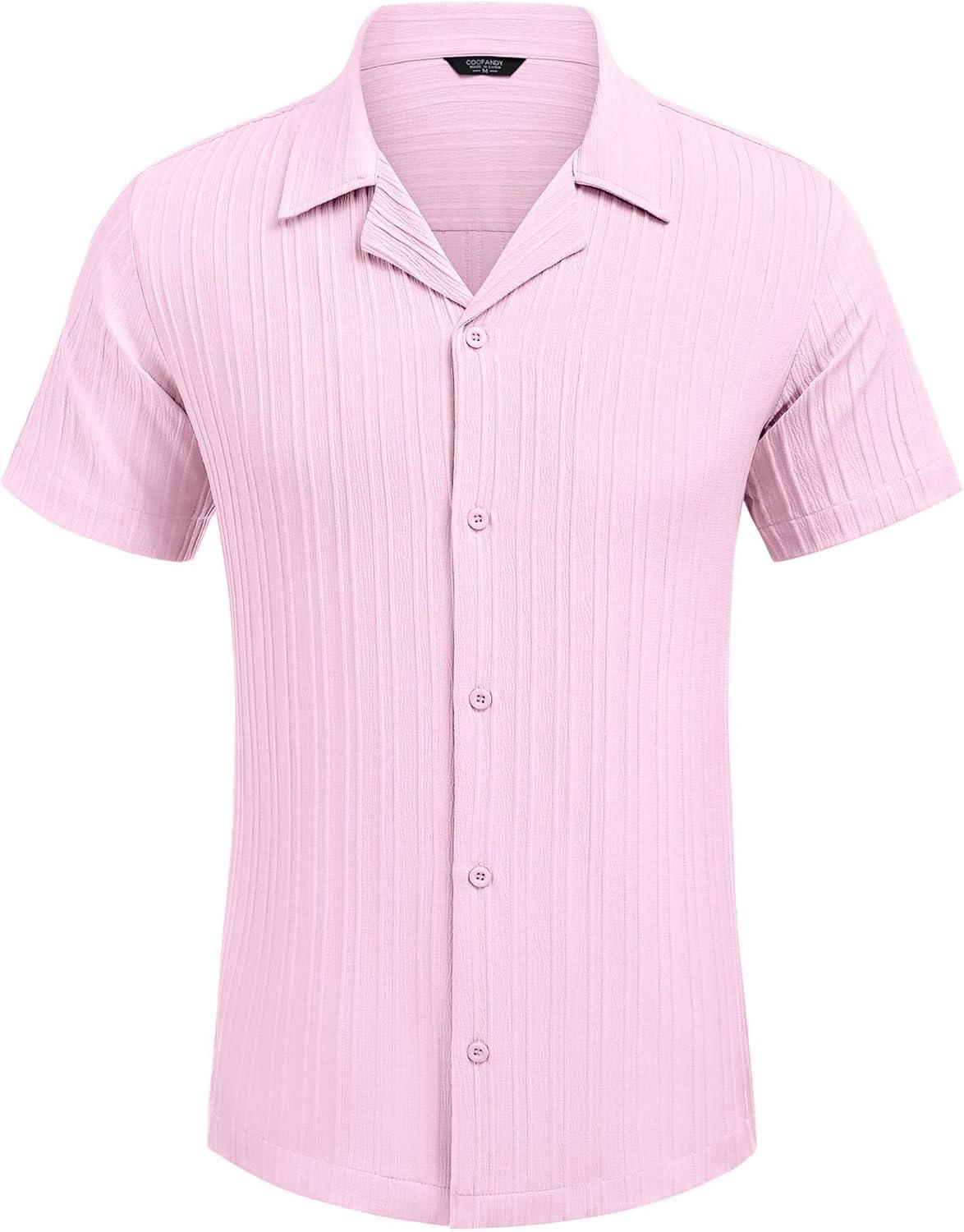 COOFANDY Men’s Casual Shirts Short Sleeve Button Down Shirts Fashion Textured Summer Beach Shirt(Pink)