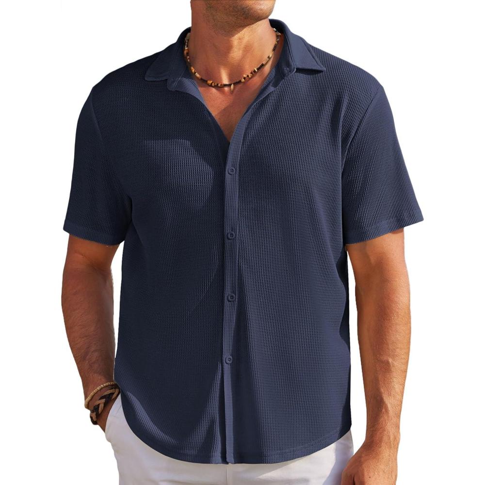 COOFANDY Men’s Casual Shirts Short Sleeve Waffle Knit Button Down Shirt Wrinkle Free Summer Beach Tops(Navy Blue)