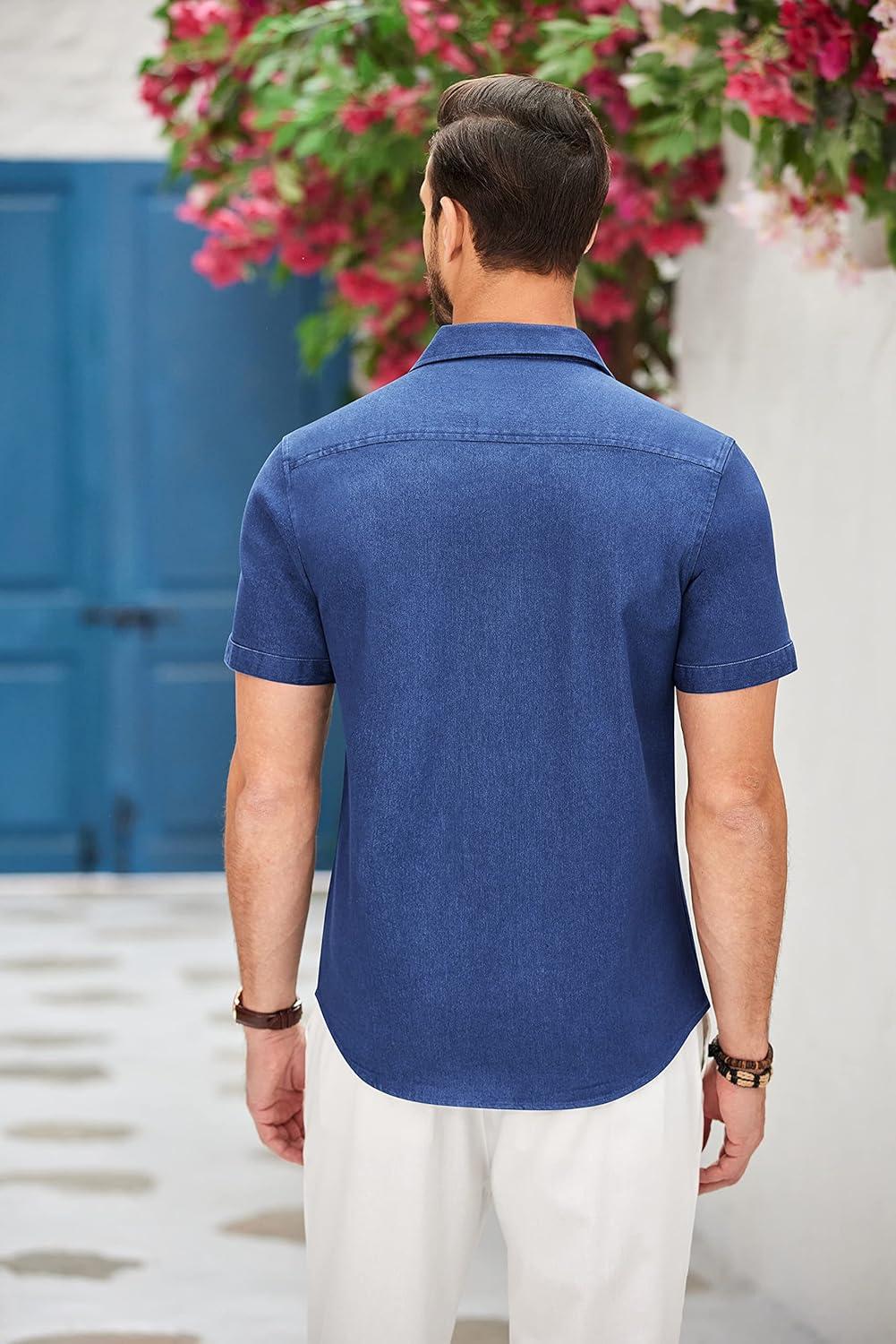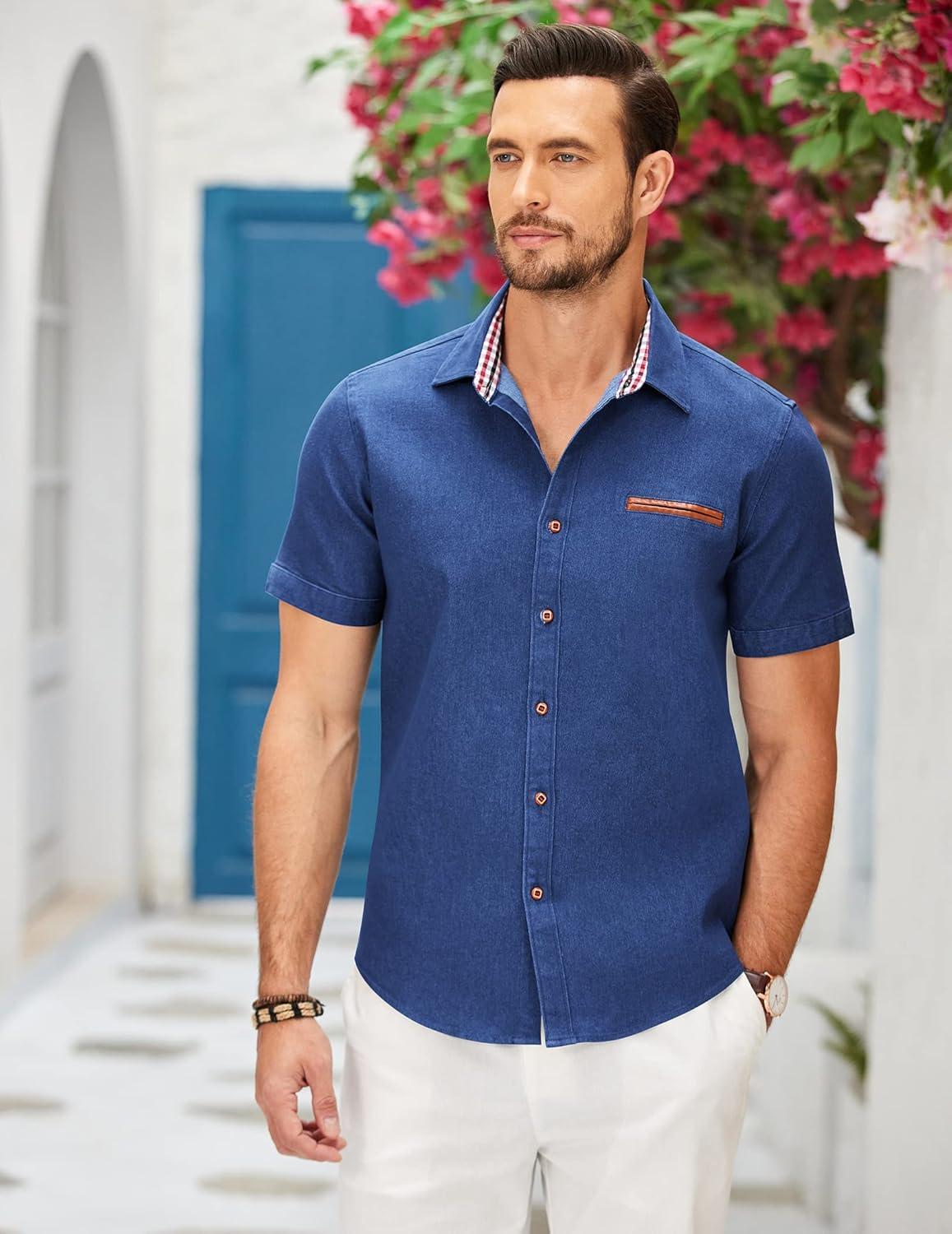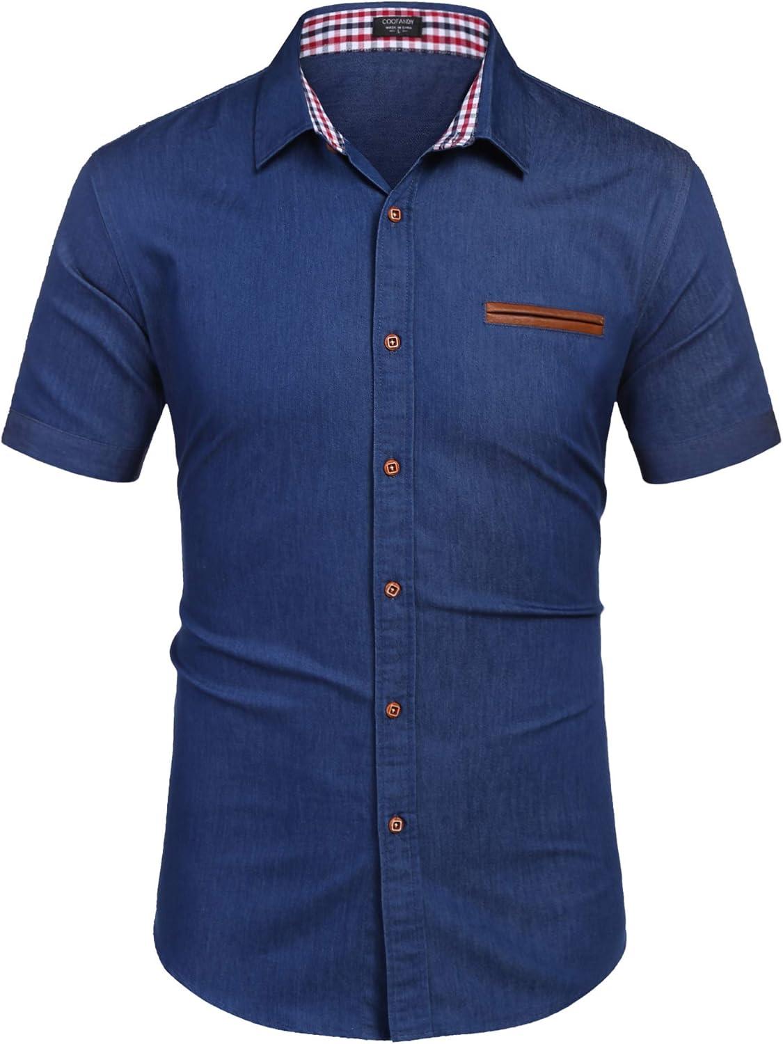 COOFANDY Men’s Casual Short Sleeve Button Down Dress Shirt Plaid Collar Denim Work Shirts(A – Dark Blue – No Pocket)