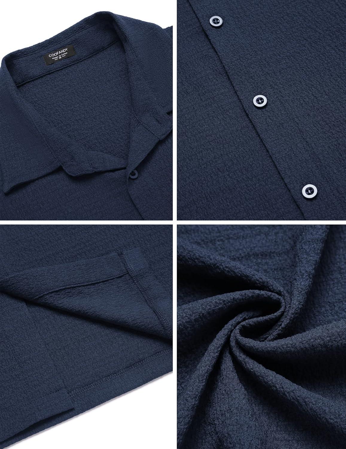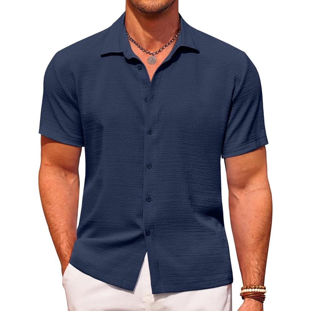 COOFANDY Men’s Casual Short Sleeve Button Down Shirt Textured Summer Beach Shirt(Navy Blue)