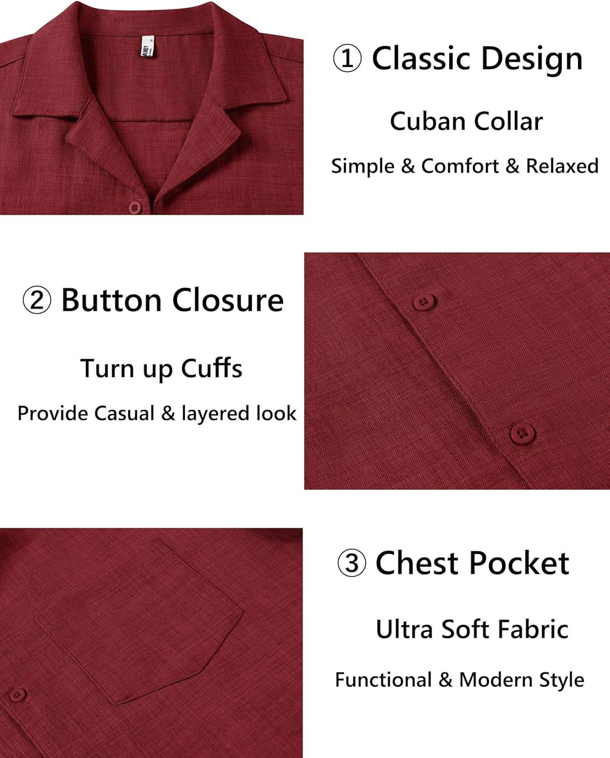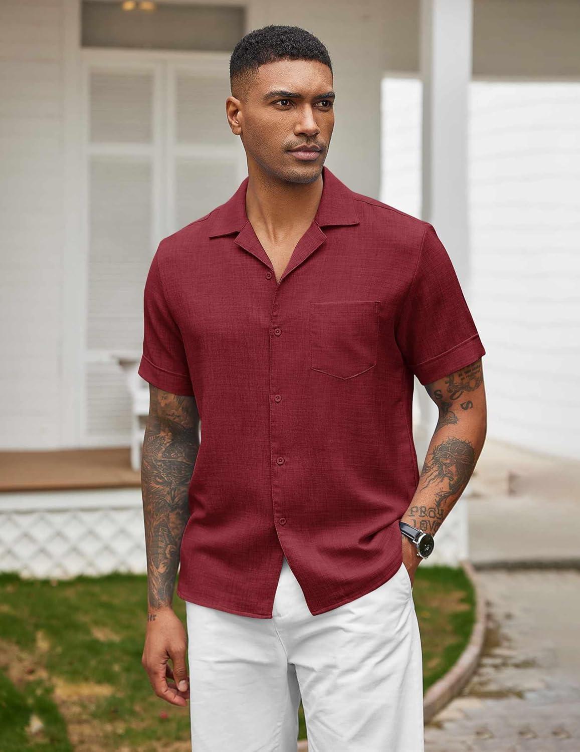 COOFANDY Mens Casual Short Sleeve Button Down Shirts Cuban Linen Textured Shirt Summer Beach Wear(Burgundy)