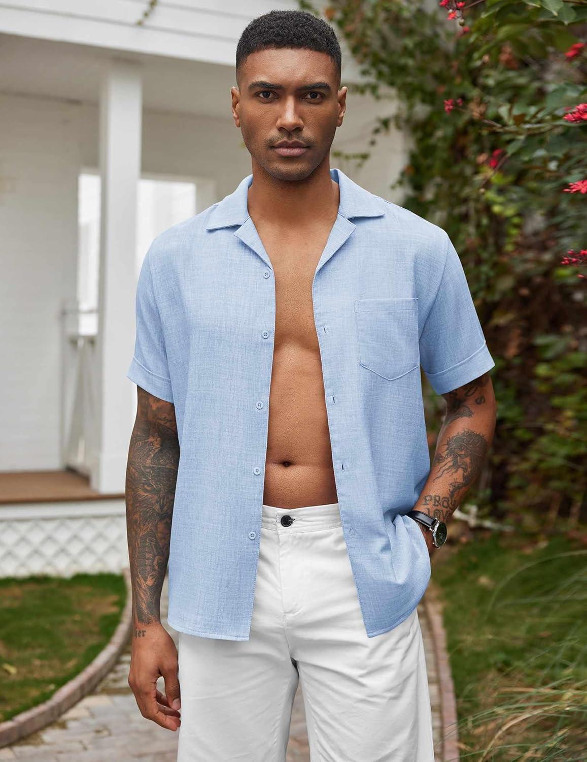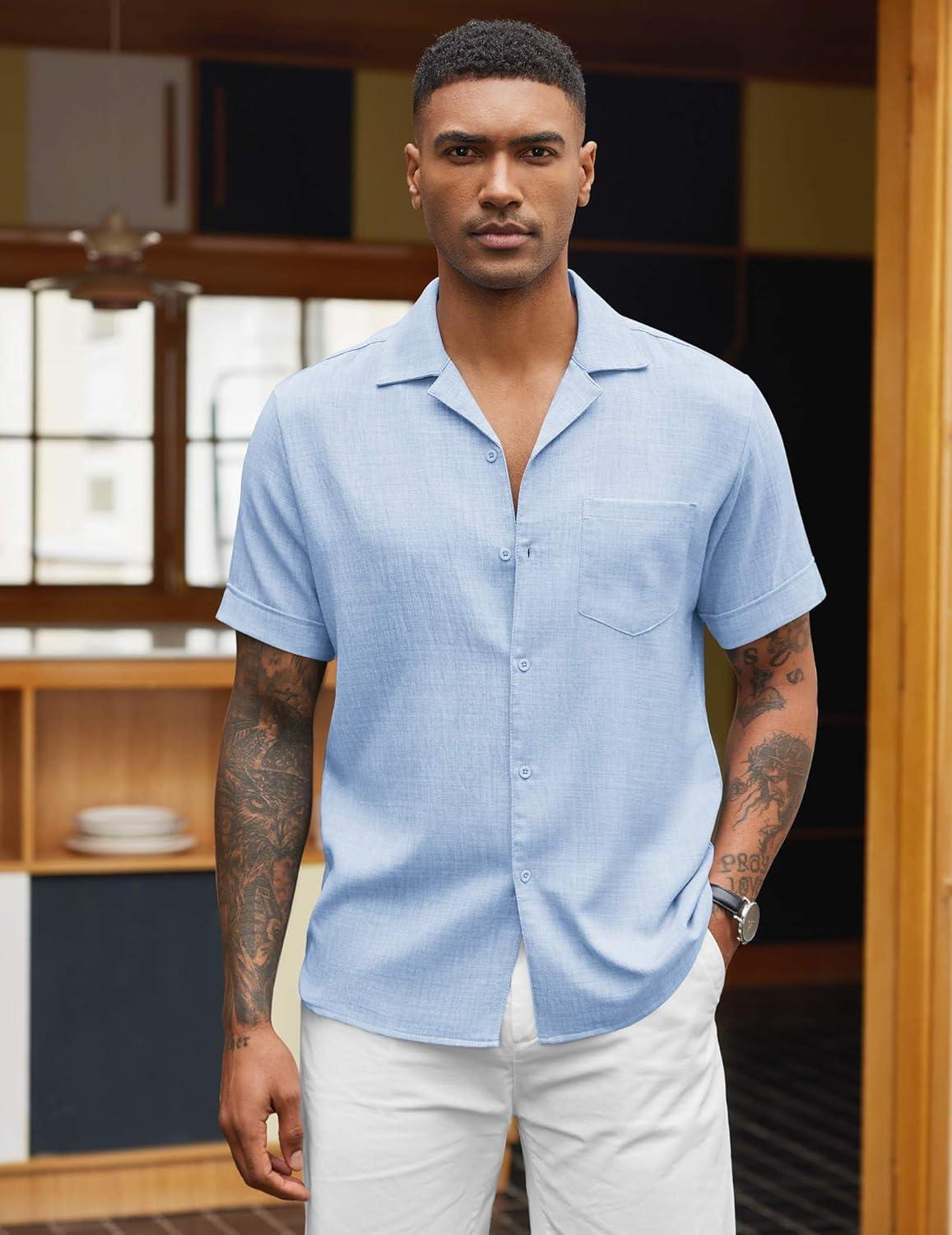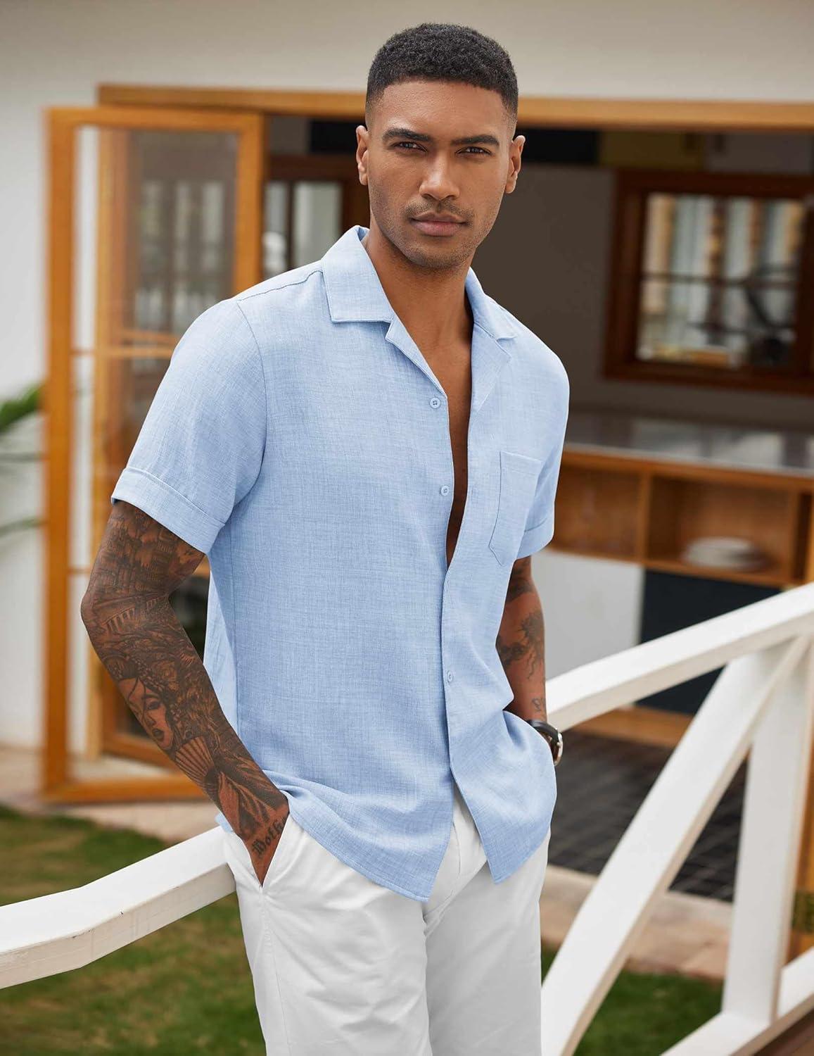 COOFANDY Men’s Linen Shirts Short Sleeve Casual Shirts Button Down Shirt for Men Beach Summer Wedding Shirt(Blue)